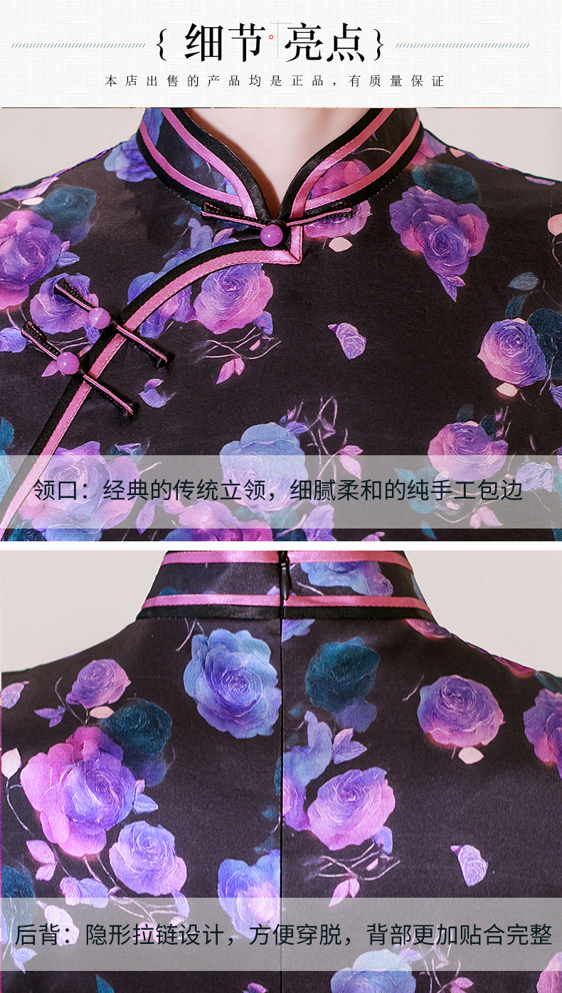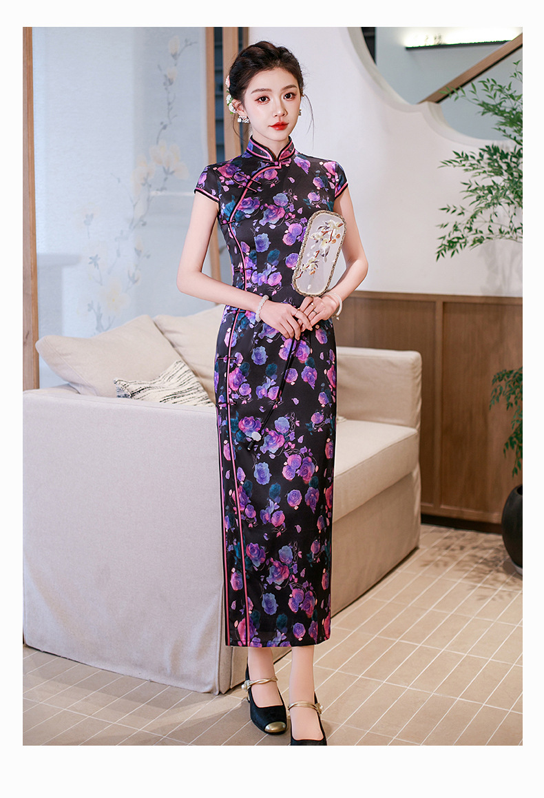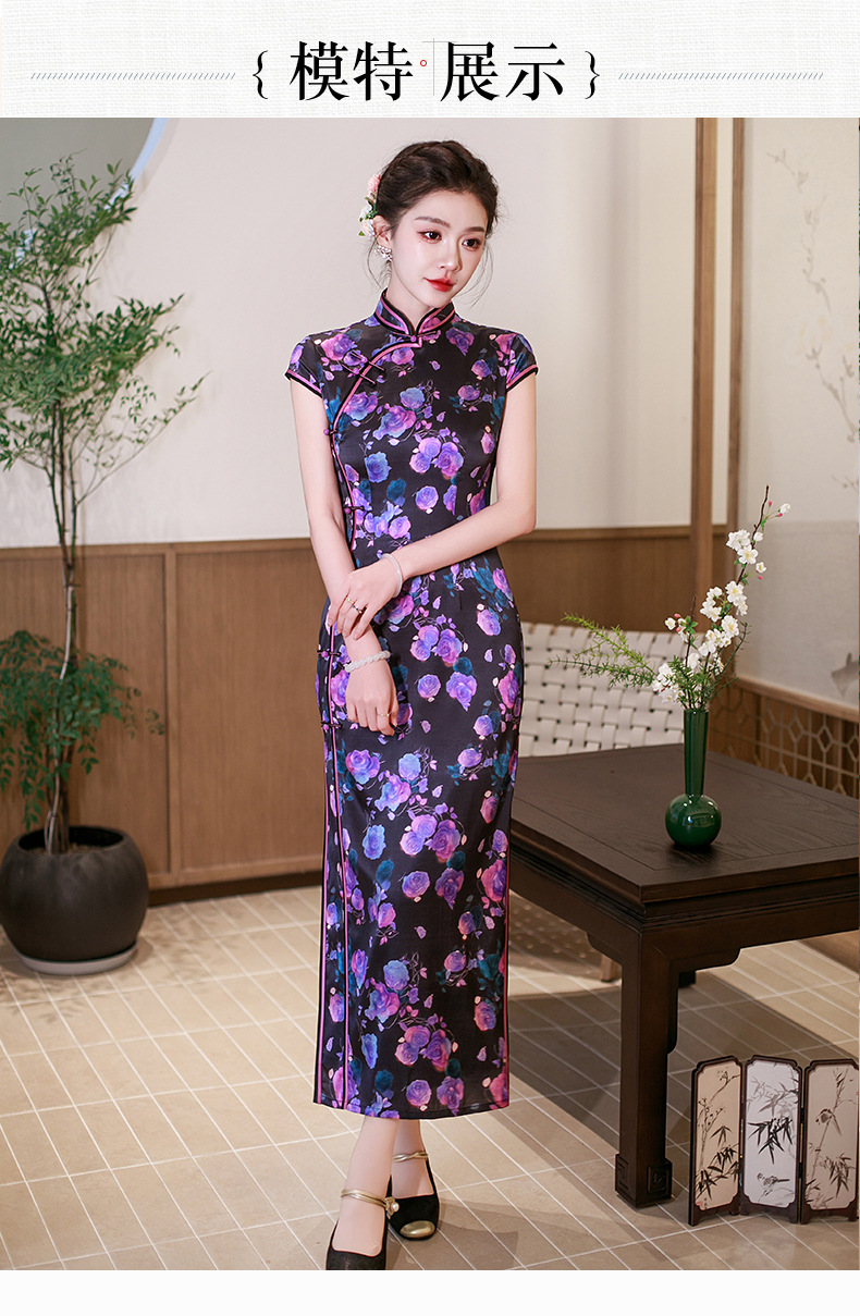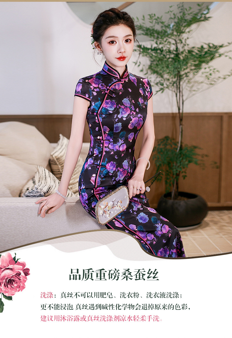 WX2026新款桑蚕丝旗袍紫色长款改良中式桑蚕丝连衣裙优雅气质修身复