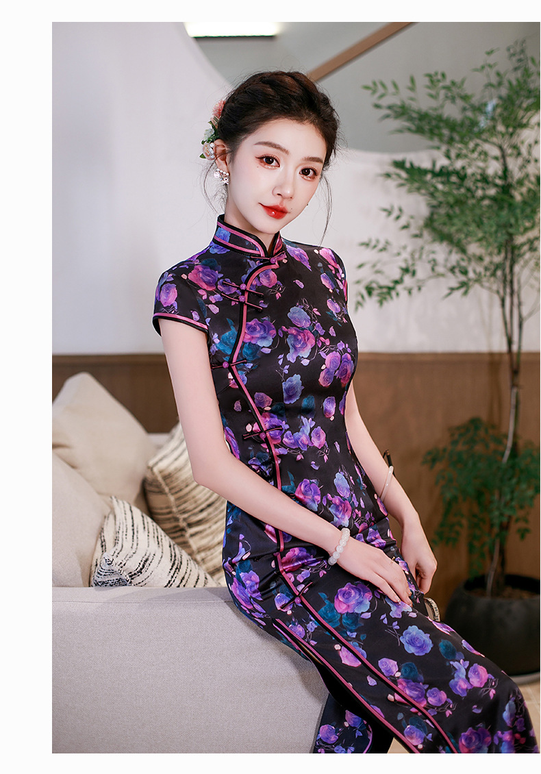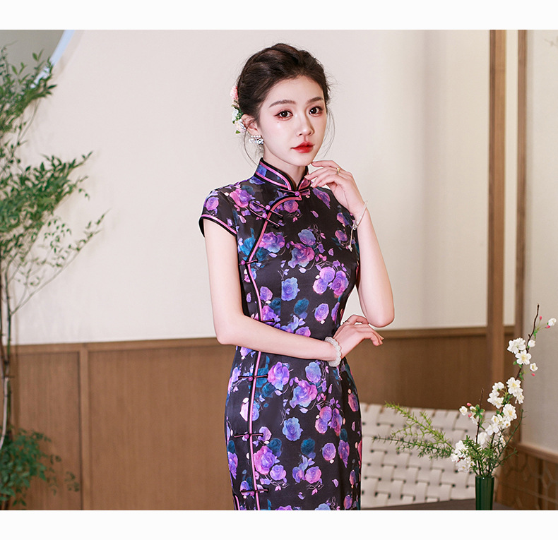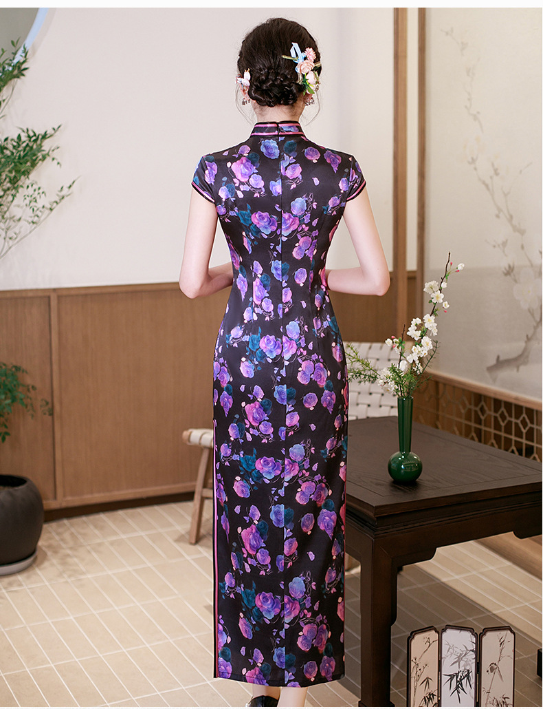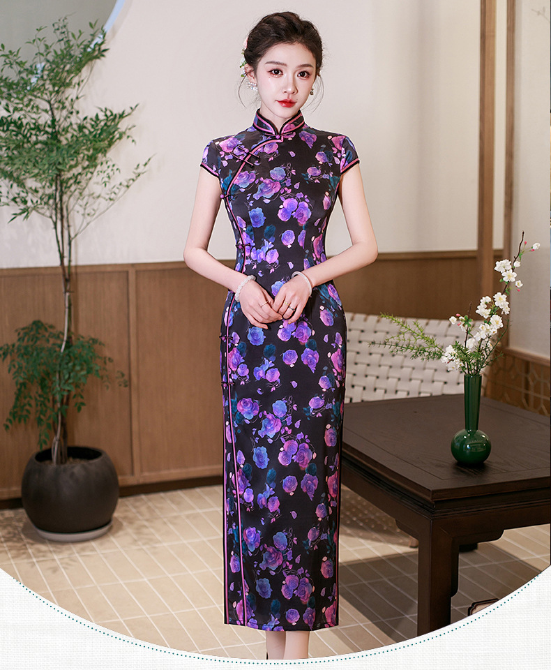 WX2026新款桑蚕丝旗袍紫色长款改良中式桑蚕丝连衣裙优雅气质修身复