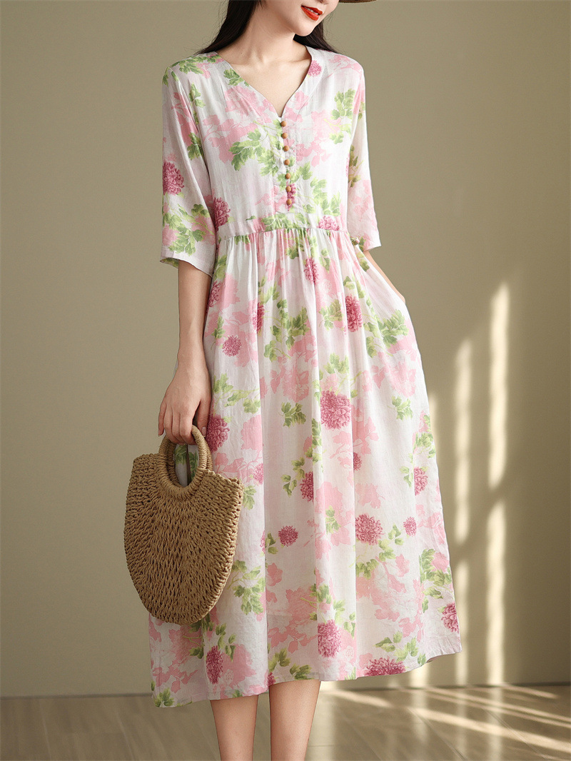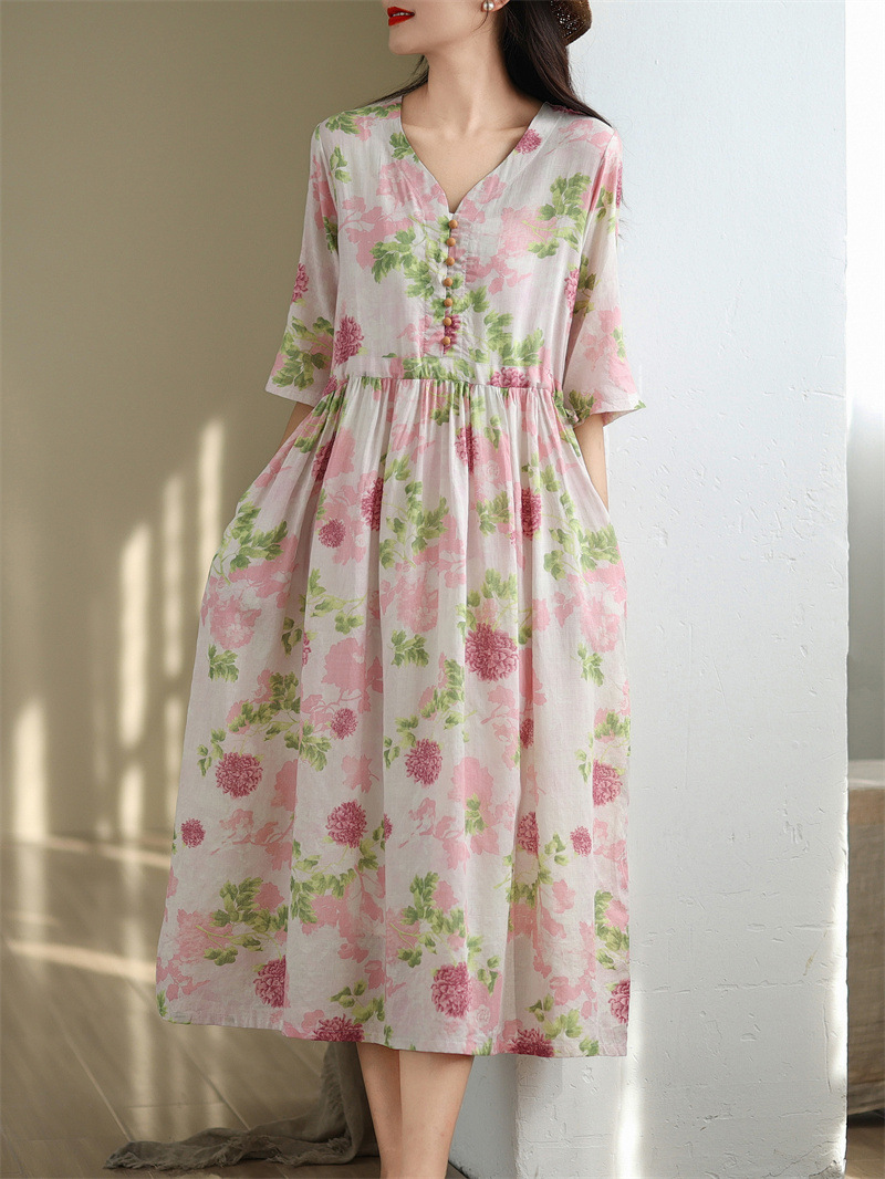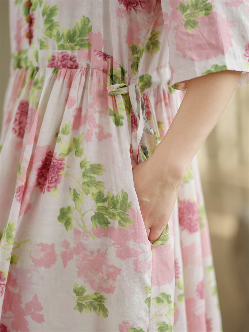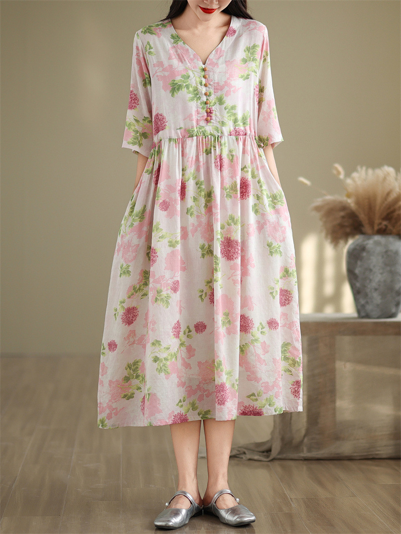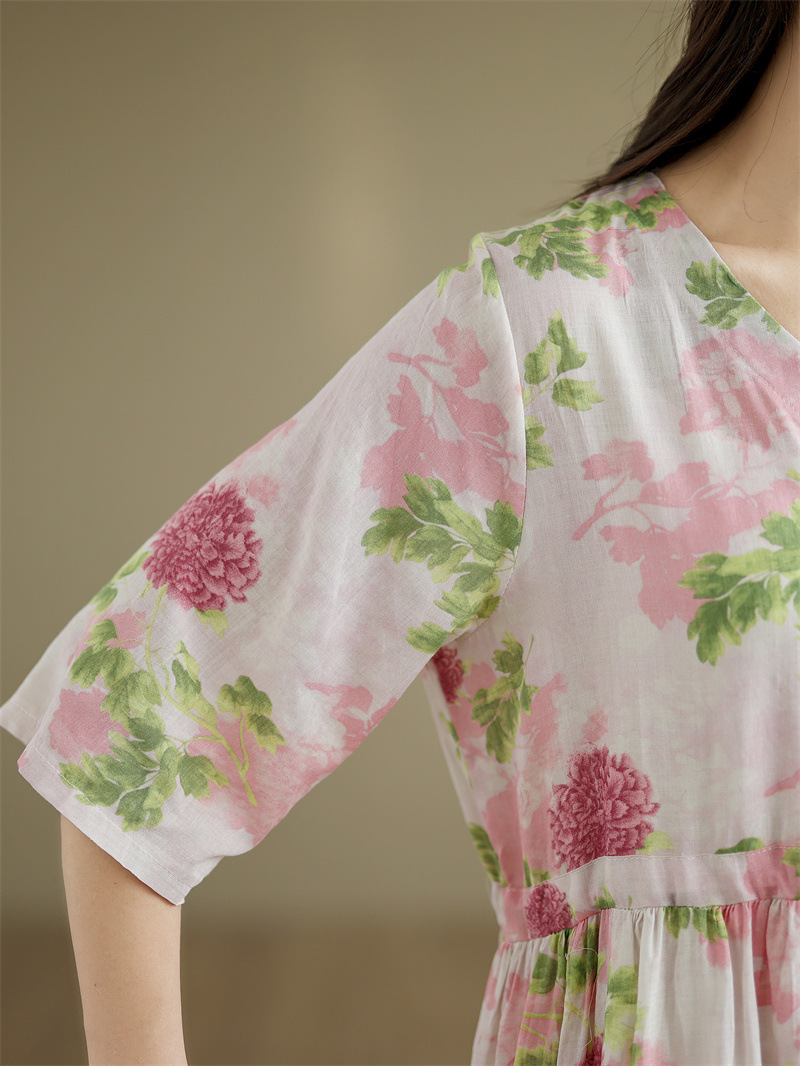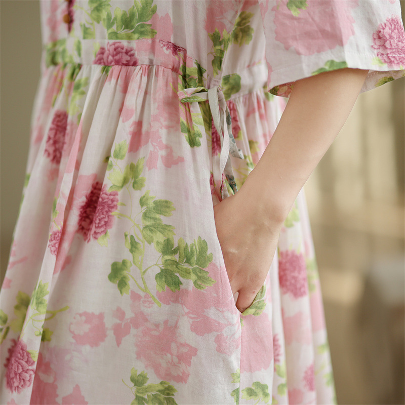 GYH 5537复古气质温婉飘逸洋气印花褶皱大摆连衣裙