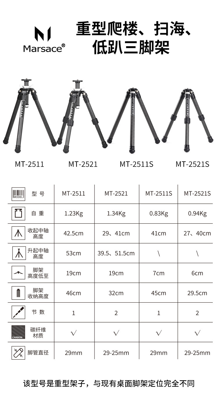马小路Marsace MT-2511 MT-2521 S 重型爬楼、扫海、低趴三脚架