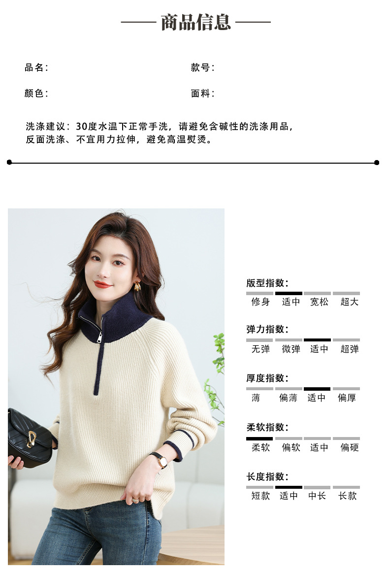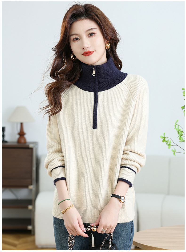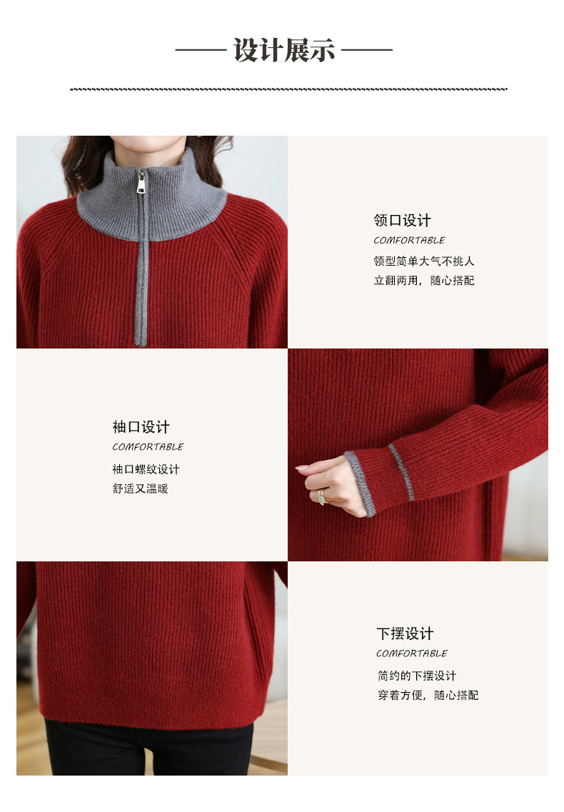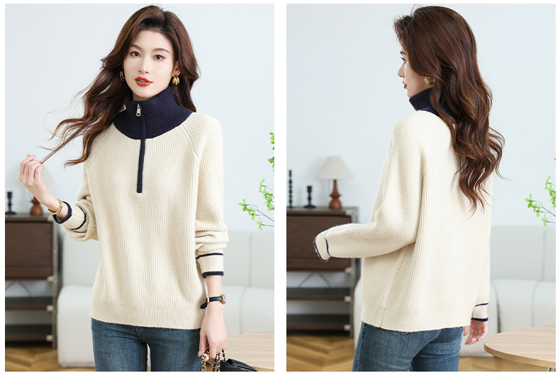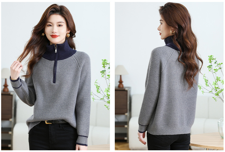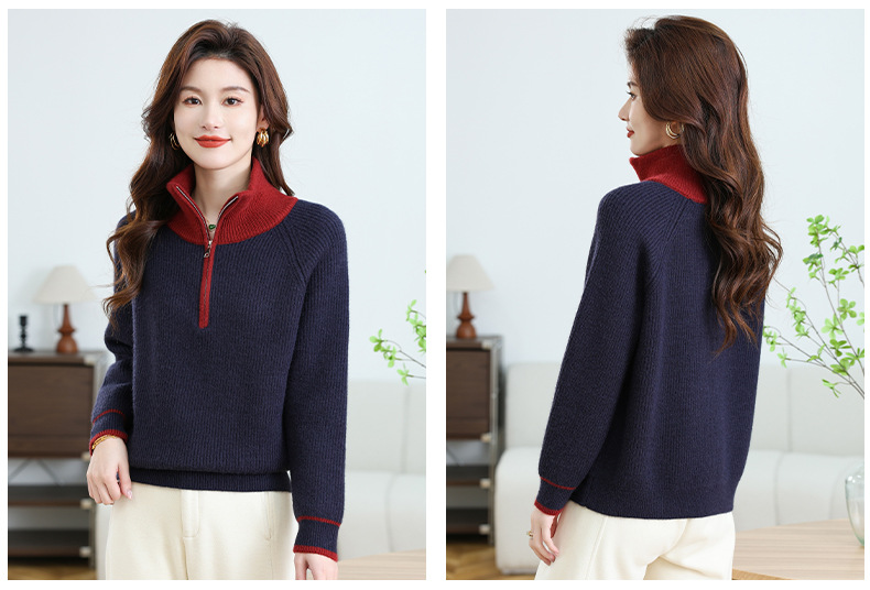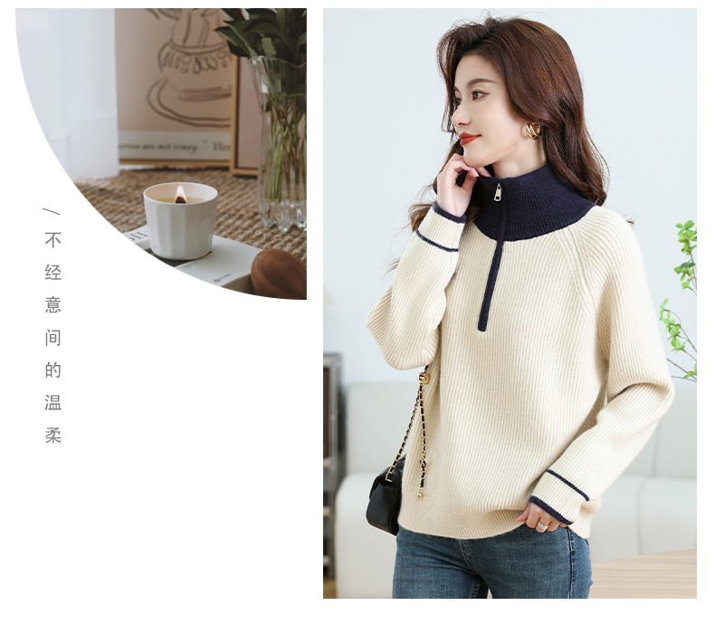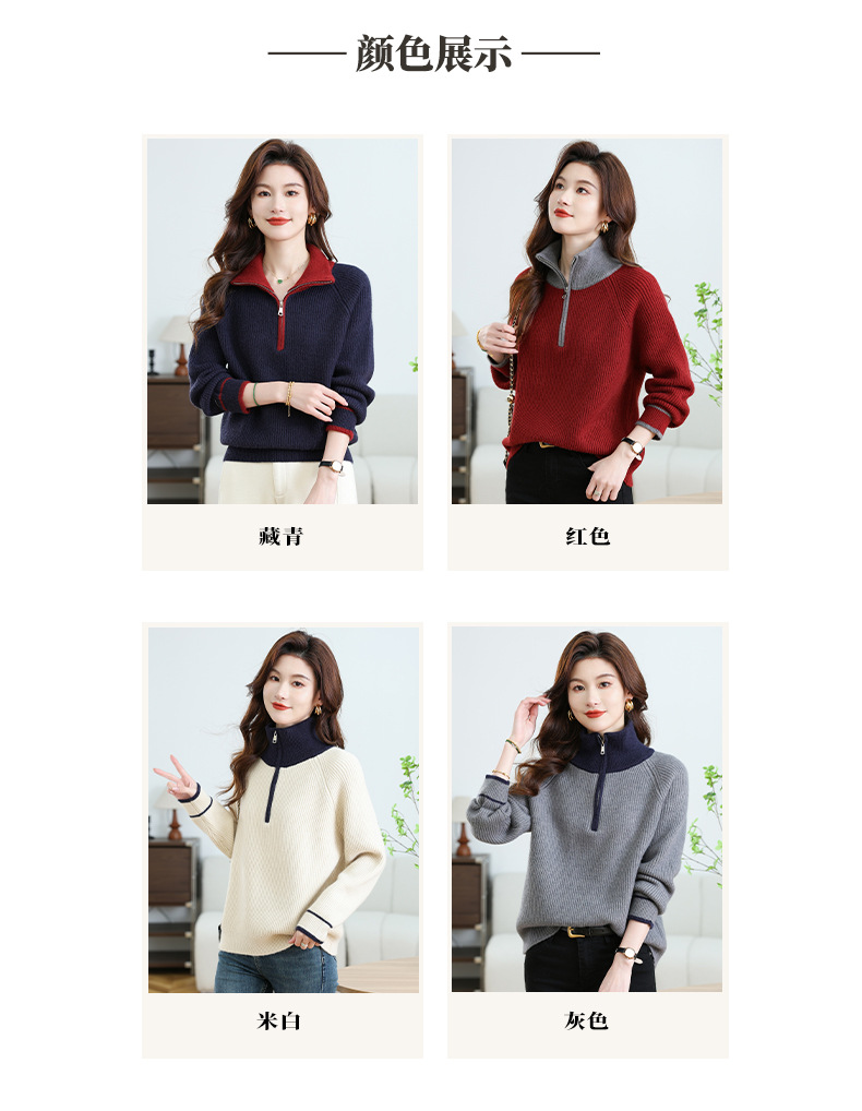 CC-17-6763高领毛衣女款2024新款秋冬拼色洋气拉链小个子针织上衣内搭打底衫