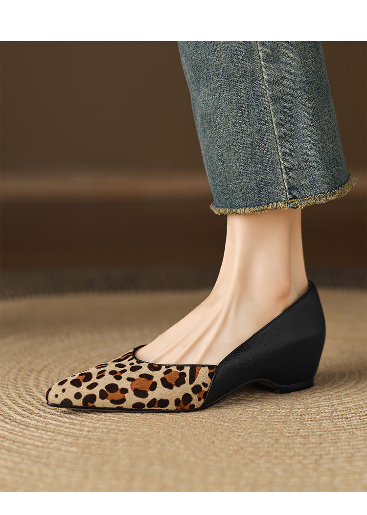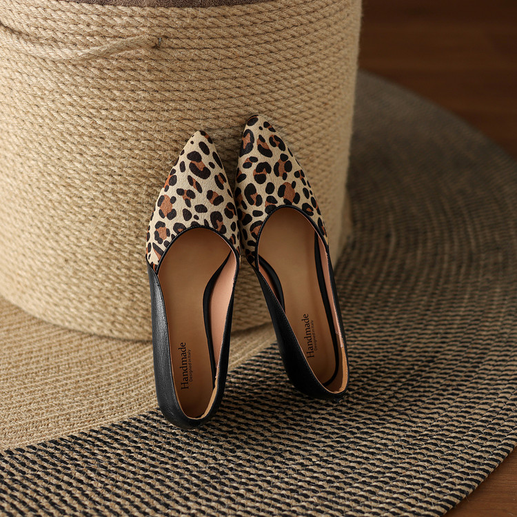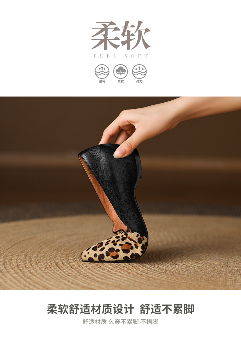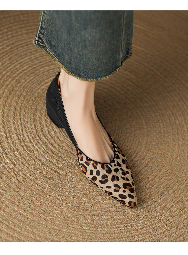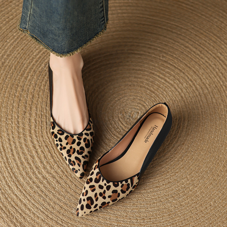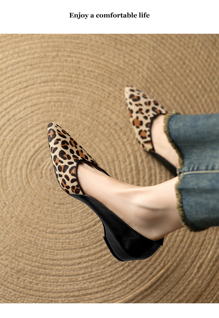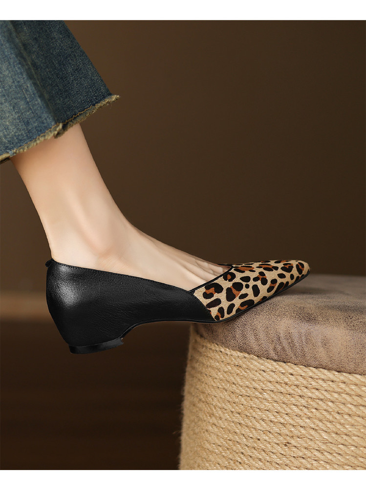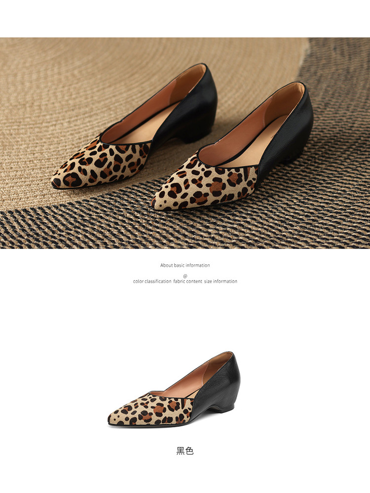 【预售5天】软真皮豹纹羊皮平底单鞋女内增高新款春秋季尖头浅口中跟女鞋LD&7418