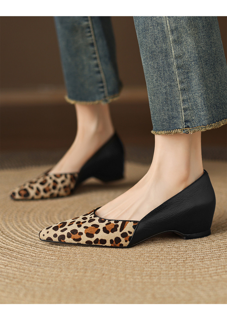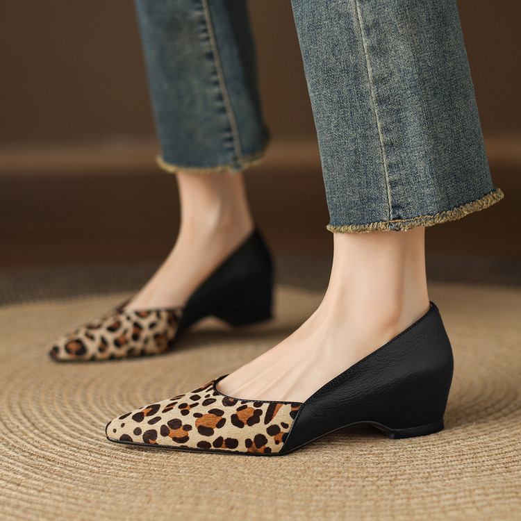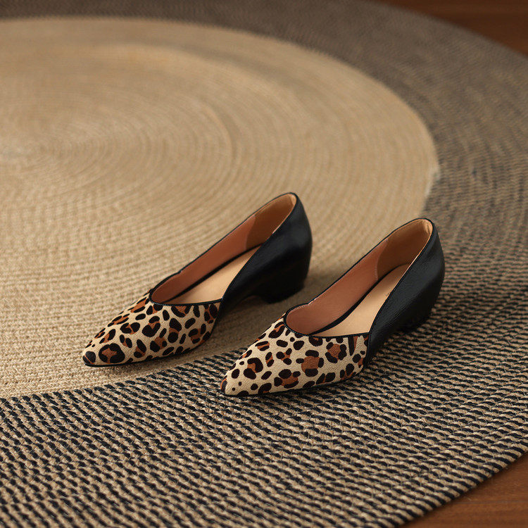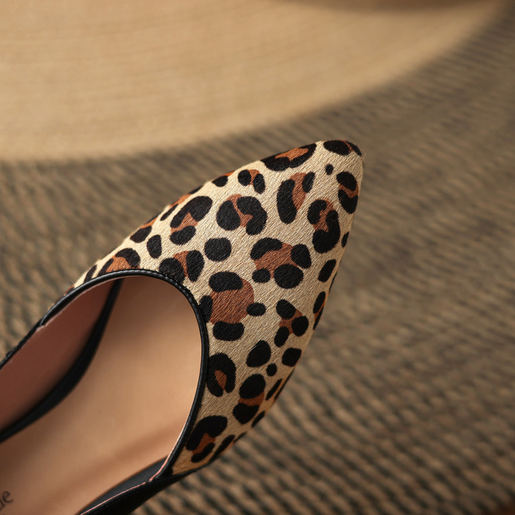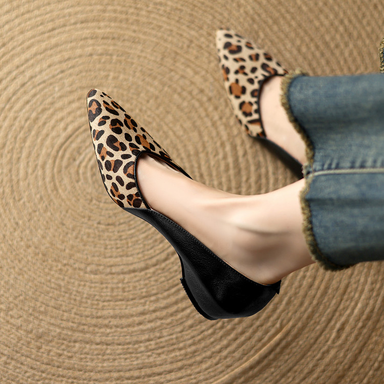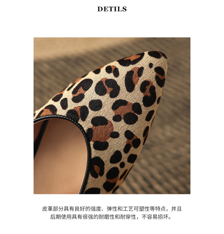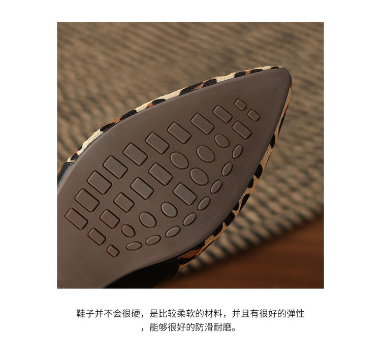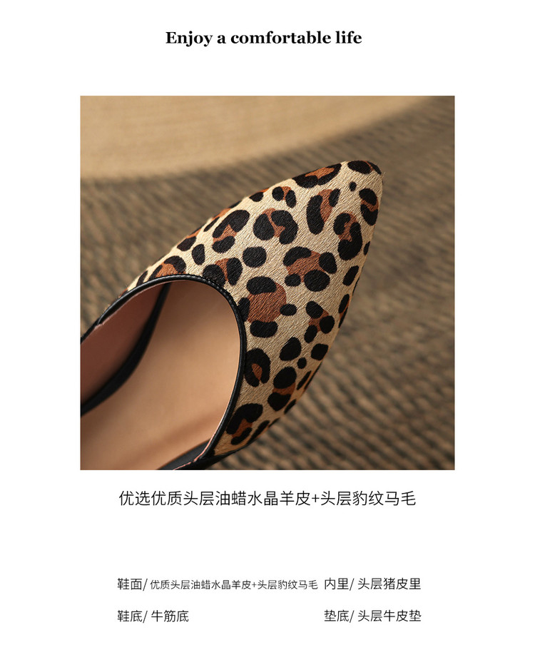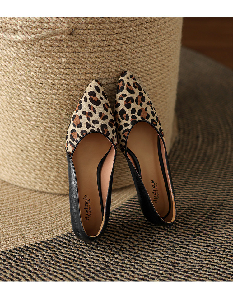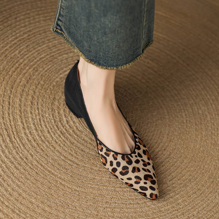 【预售5天】软真皮豹纹羊皮平底单鞋女内增高新款春秋季尖头浅口中跟女鞋LD&7418