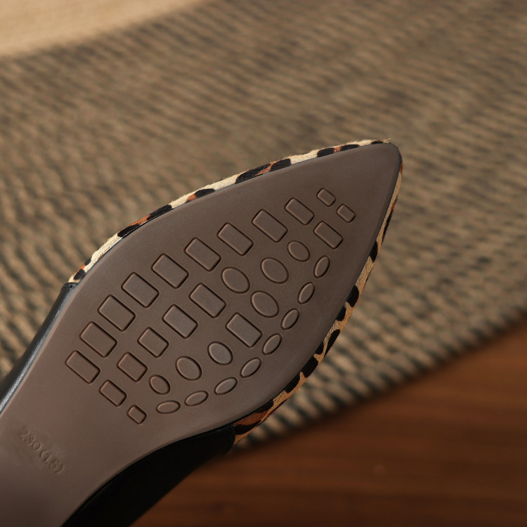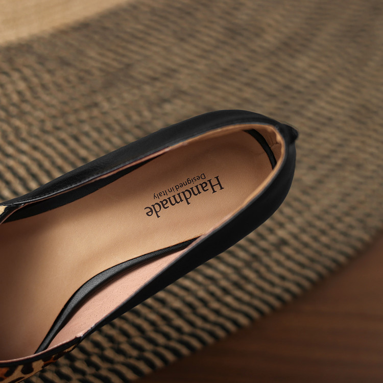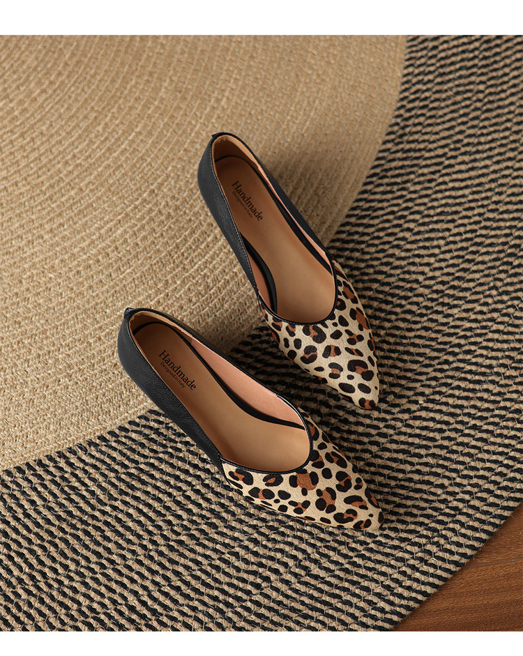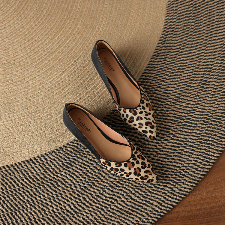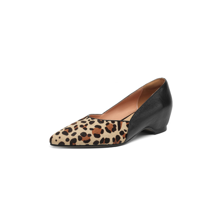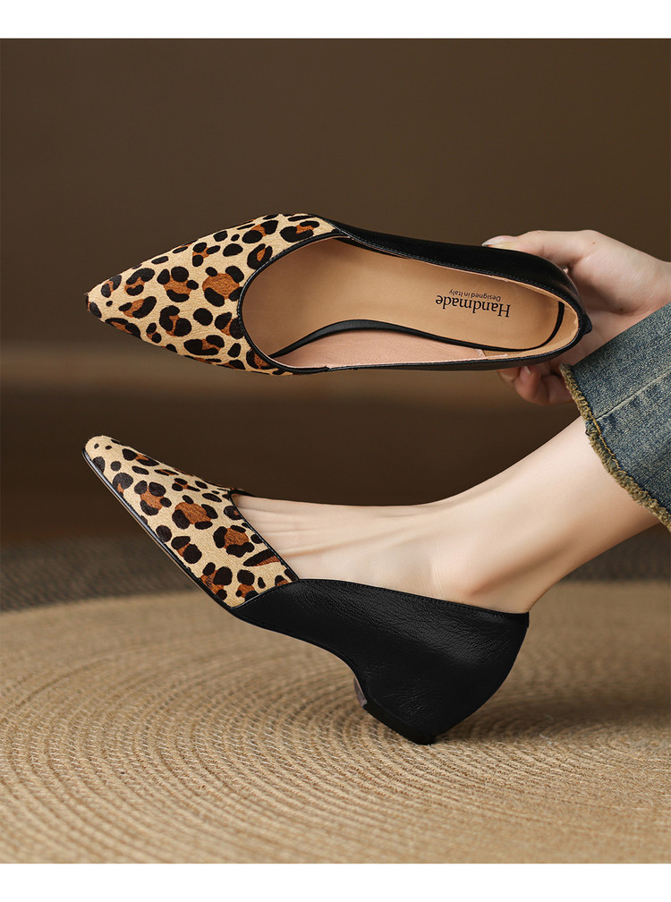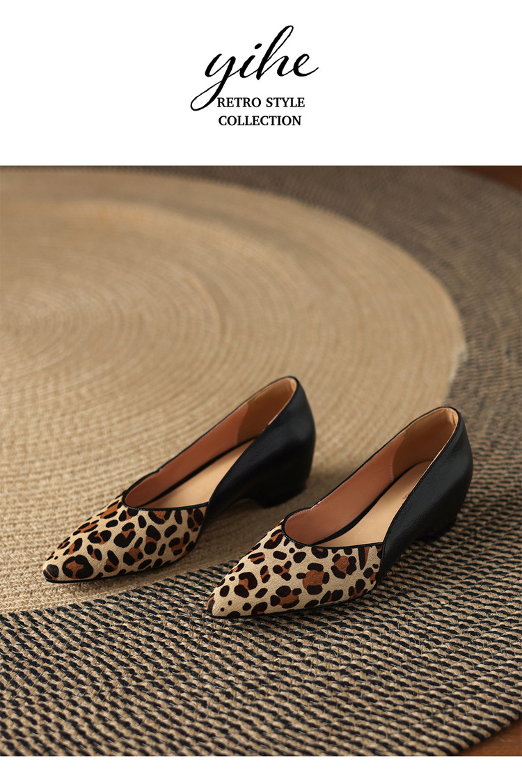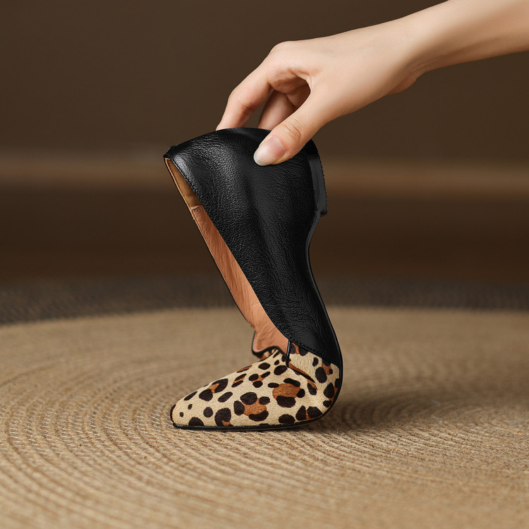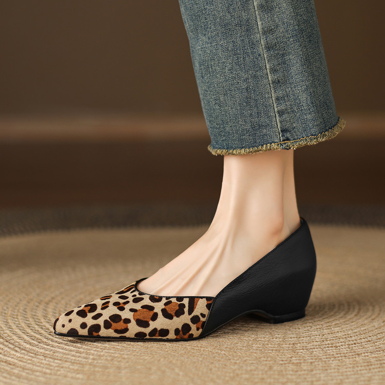 【预售5天】软真皮豹纹羊皮平底单鞋女内增高新款春秋季尖头浅口中跟女鞋LD&7418