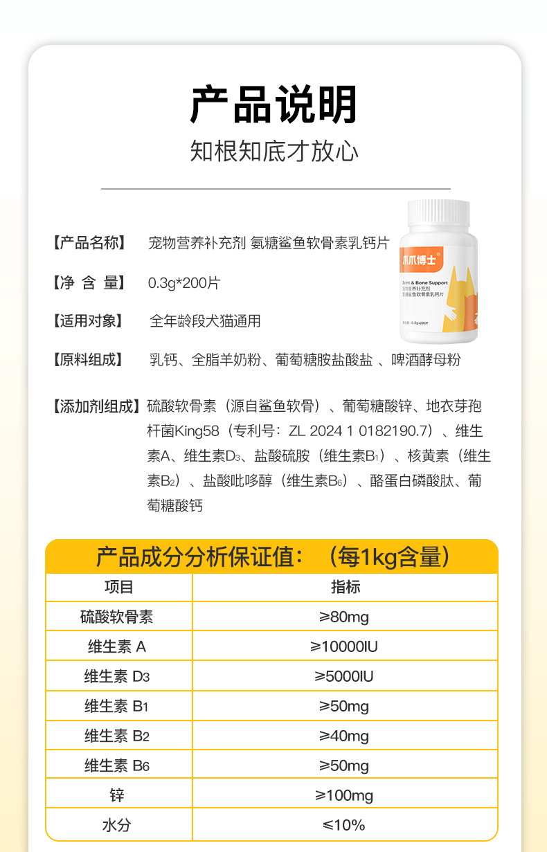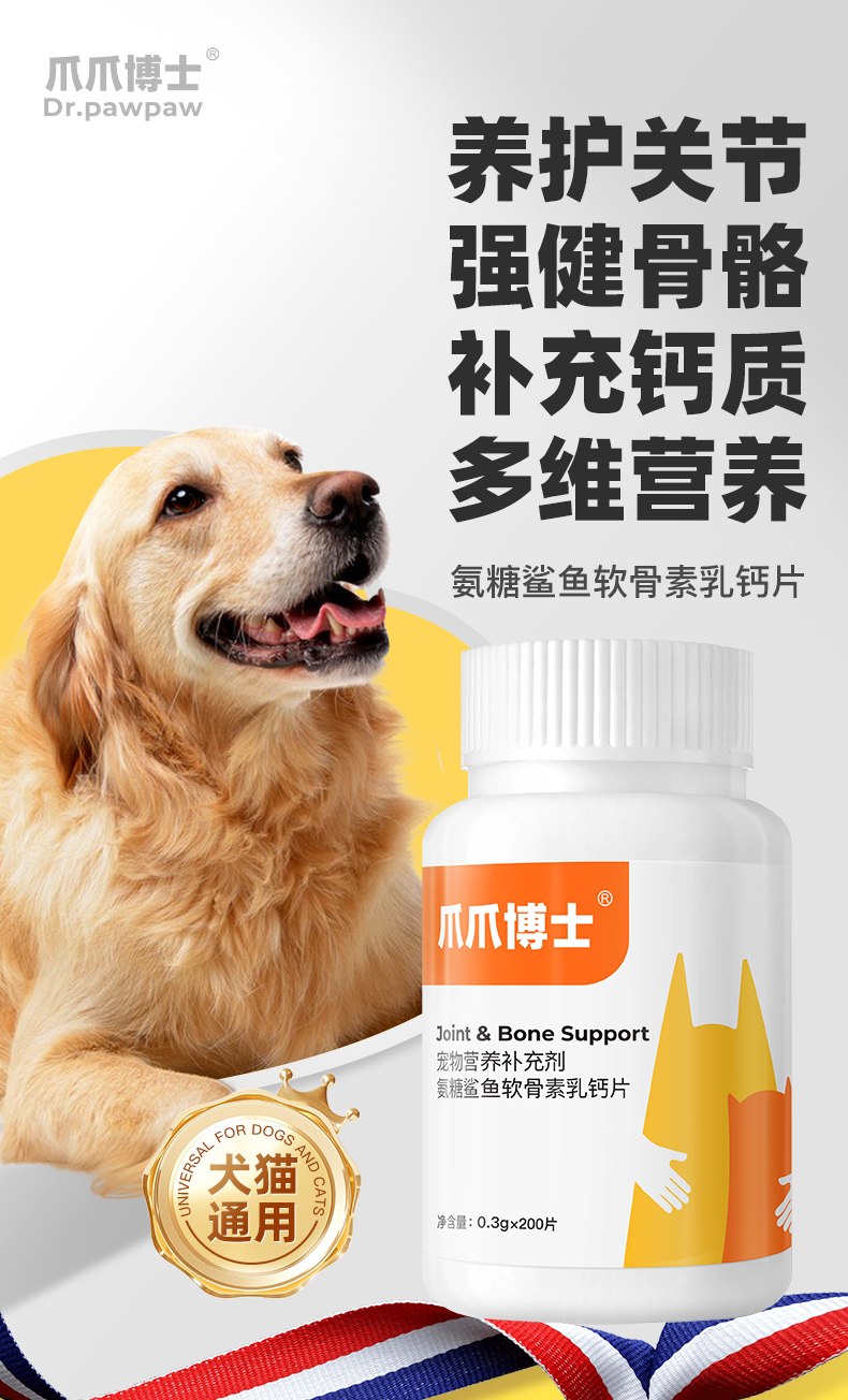 【犬猫通用X】(1瓶200片)爪爪博士狗狗猫咪补筋骨韧带补钙氨糖软骨素促进发育强健骨骼鲨鱼软骨素乳钙片200片