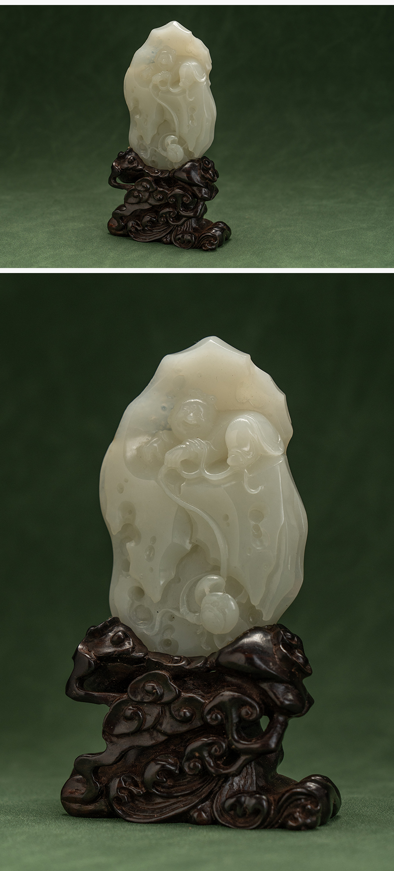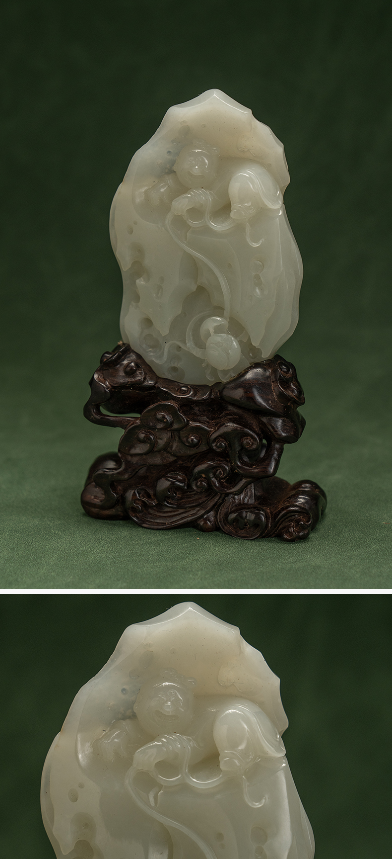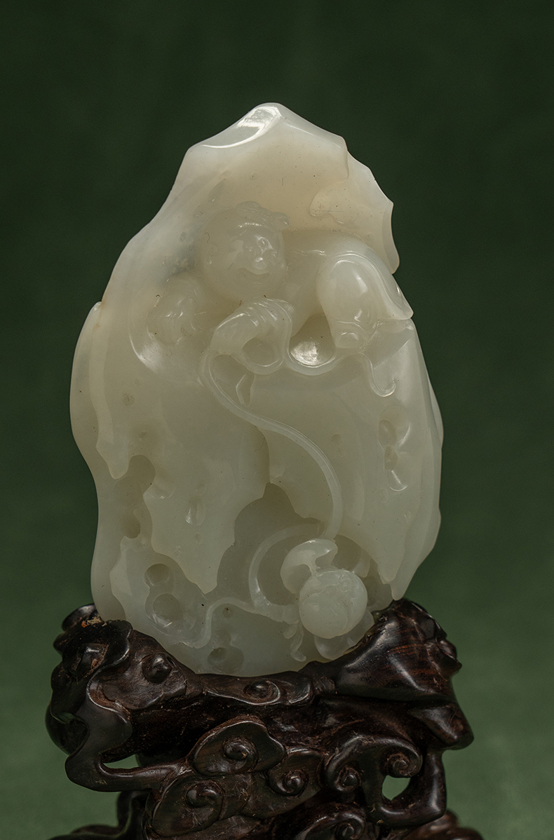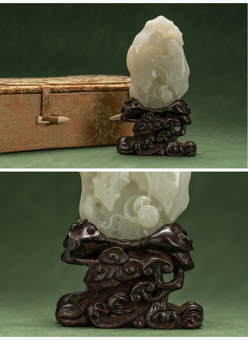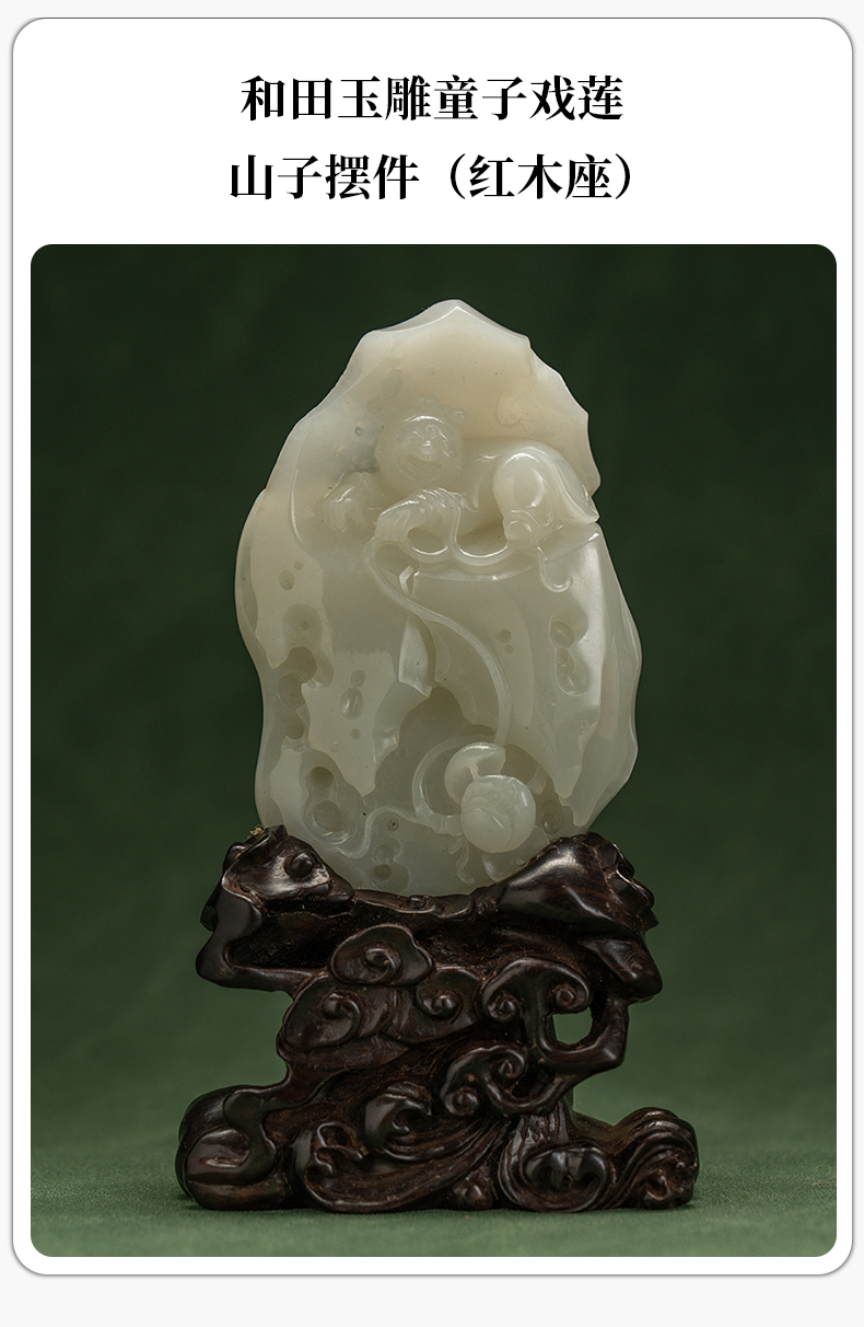 和田玉雕童子戏莲山子摆件(红木座)