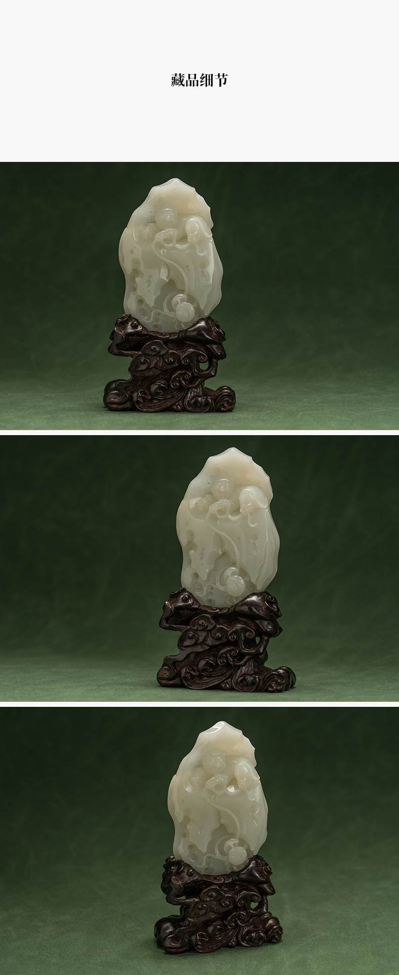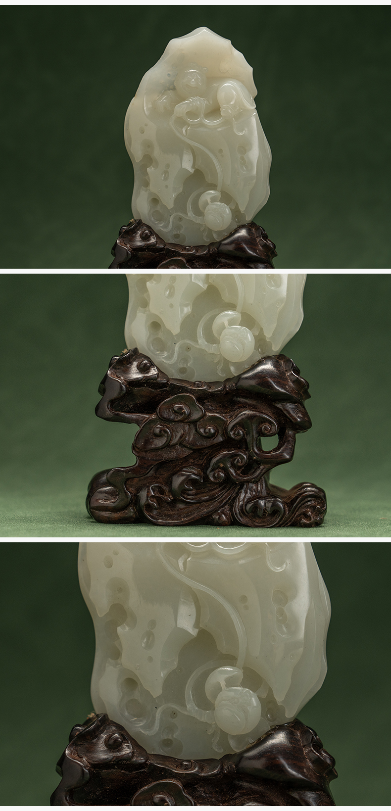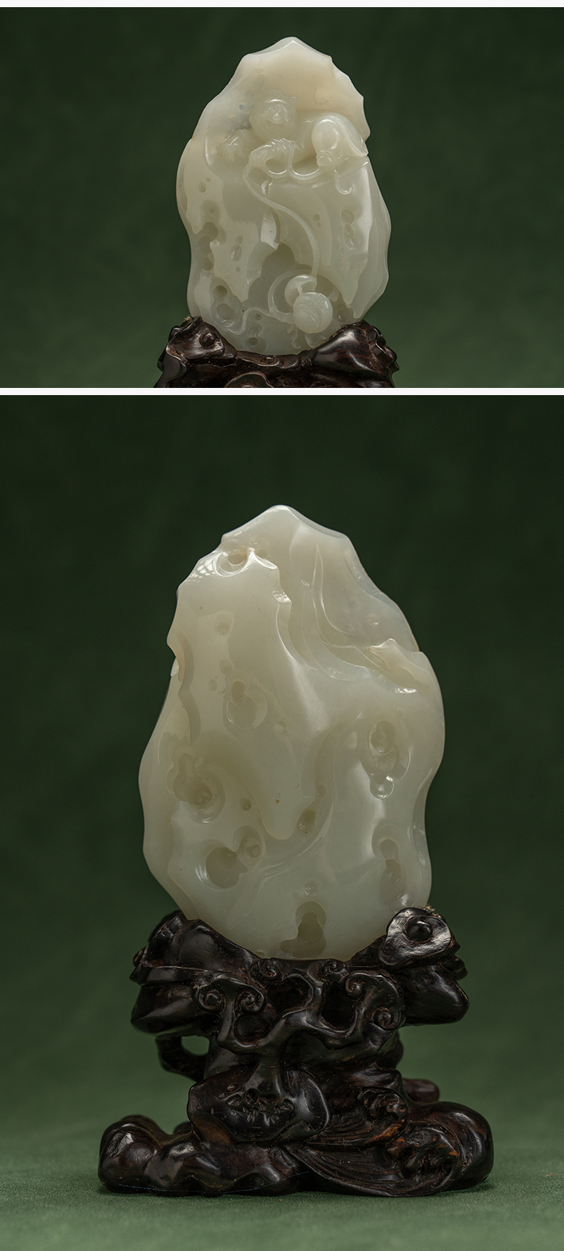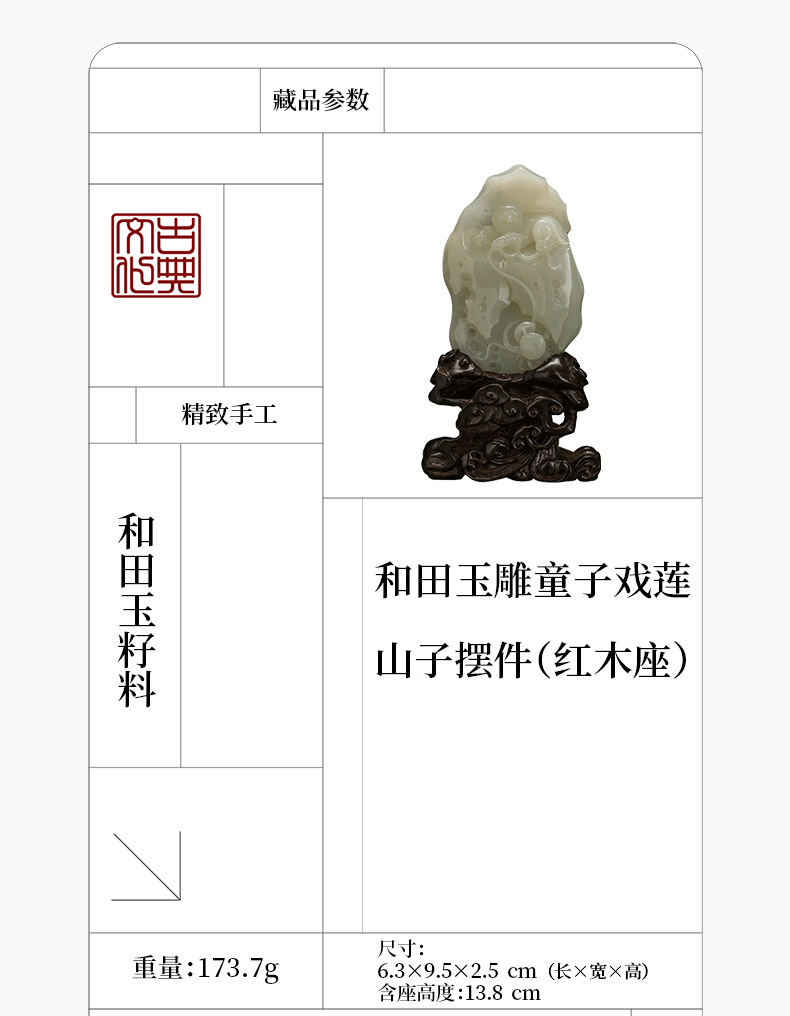 和田玉雕童子戏莲山子摆件(红木座)