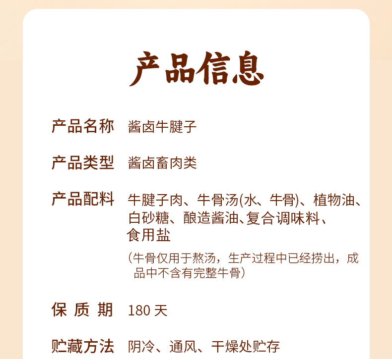 【配料表 】牛腱子肉、牛骨汤(水、牛骨)、植物油、白砂糖、酿造酱油、复合调味料、食用盐牛骨仅用于熬汤,生产过程中已经捞出,成品中不含有完整牛骨。