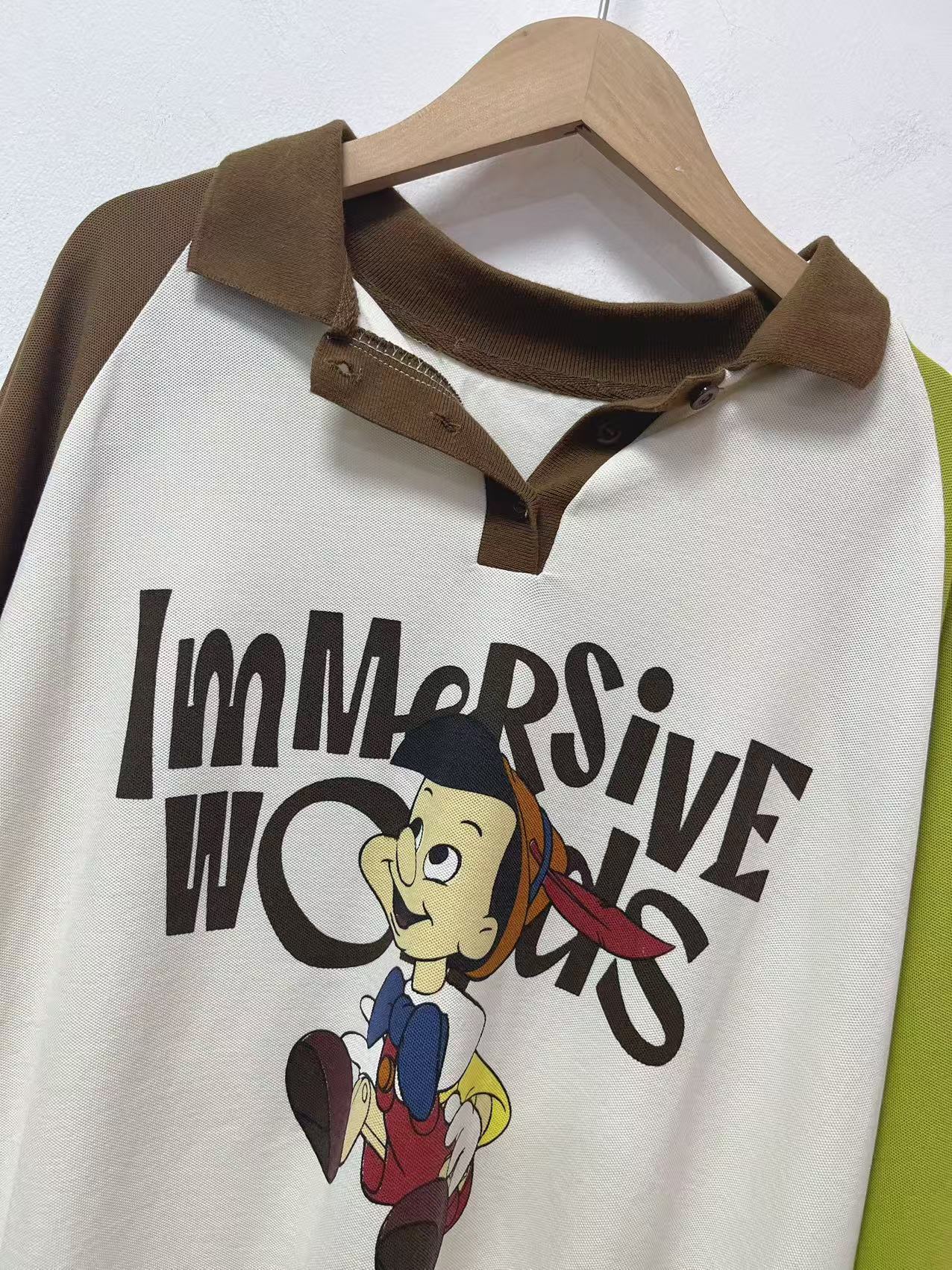 清仓价2025~2362撞色袖卡通翻领宽松短袖T恤-喜出