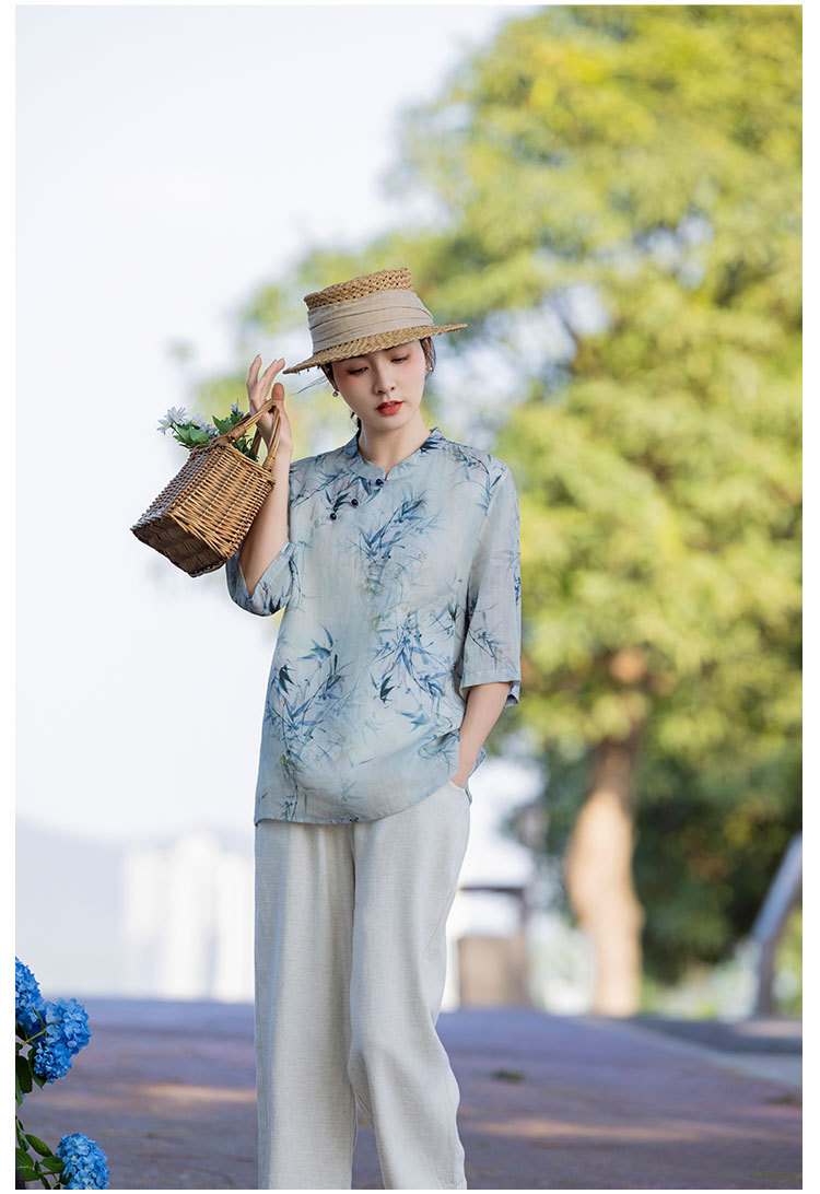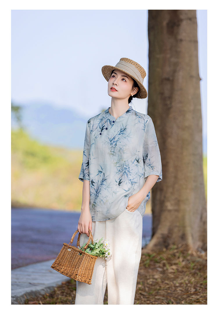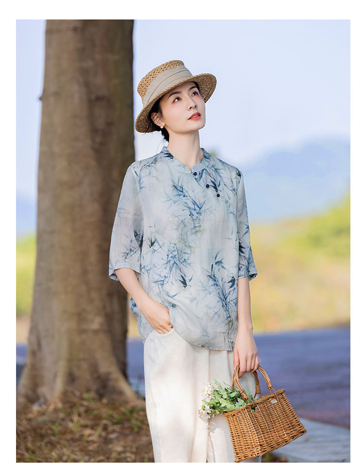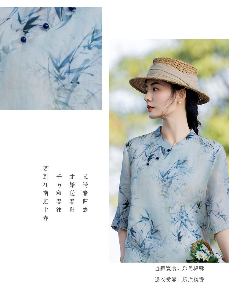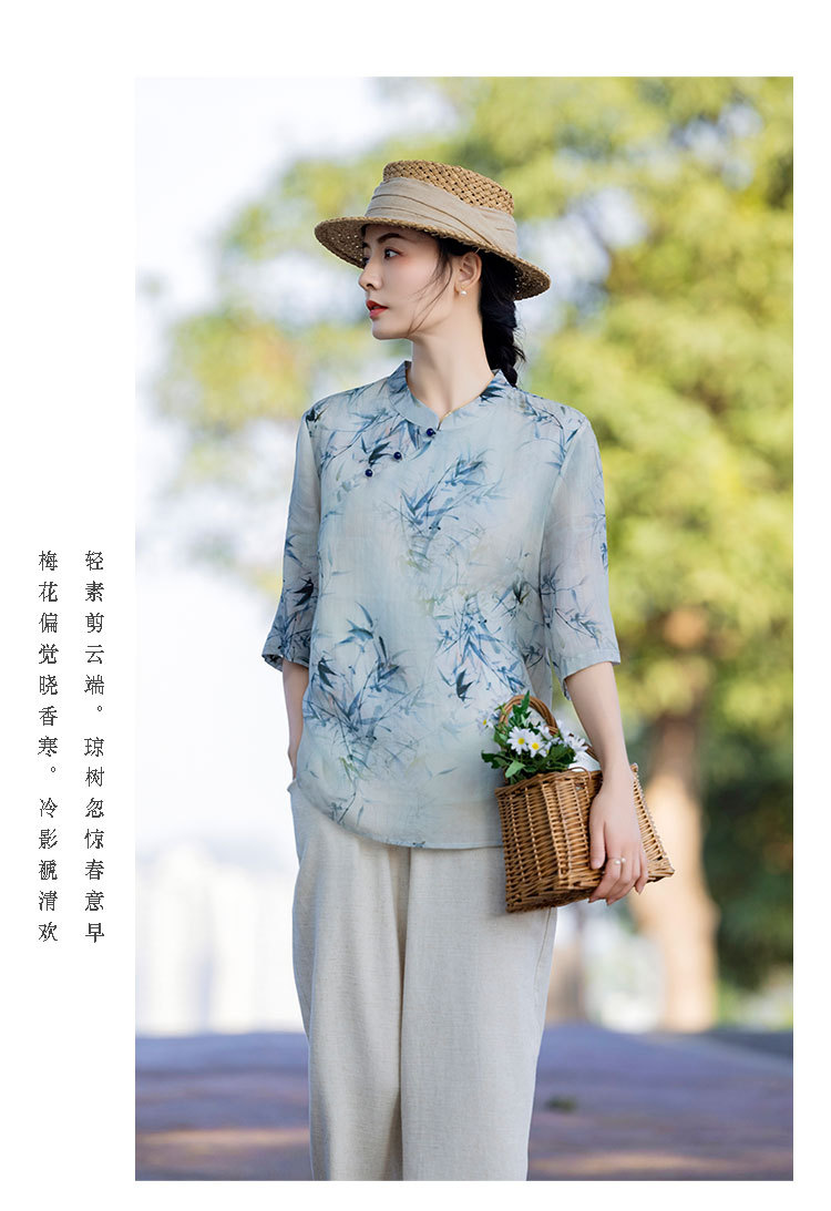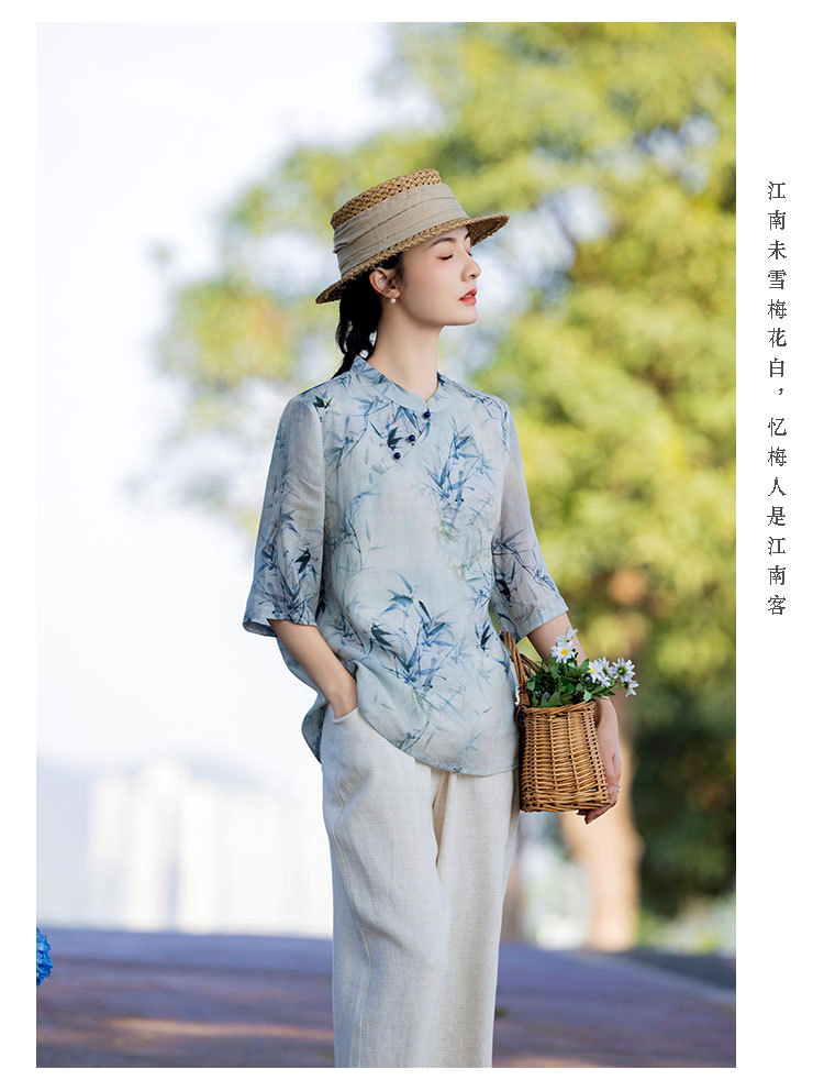 雀说中国风复古小众独特设计立领新中式斜襟盘扣衬衫苎麻印花上衣女AL96181