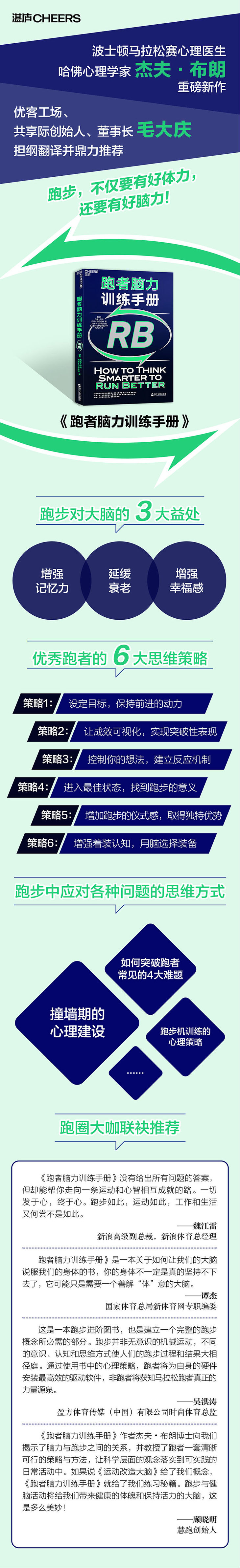 《跑者脑力训练手册》作者杰夫·布朗博士向我们揭示了脑力与跑步之间的关系,并教授了跑者一套清晰可行的策略与方法,让科学层面的观念落实到可实践的日常活动中。如果说《运动改造大脑》给了我们概念,《跑者脑力训练手册》就给了我们练习秘籍。跑步与健脑活动将给我们带来健康的体魄和保持活力的大脑,这是多么美妙!