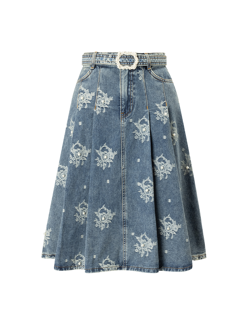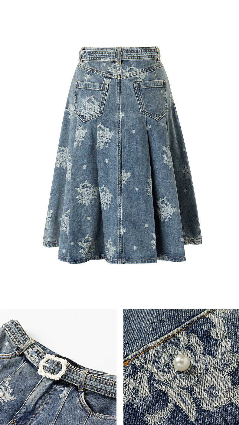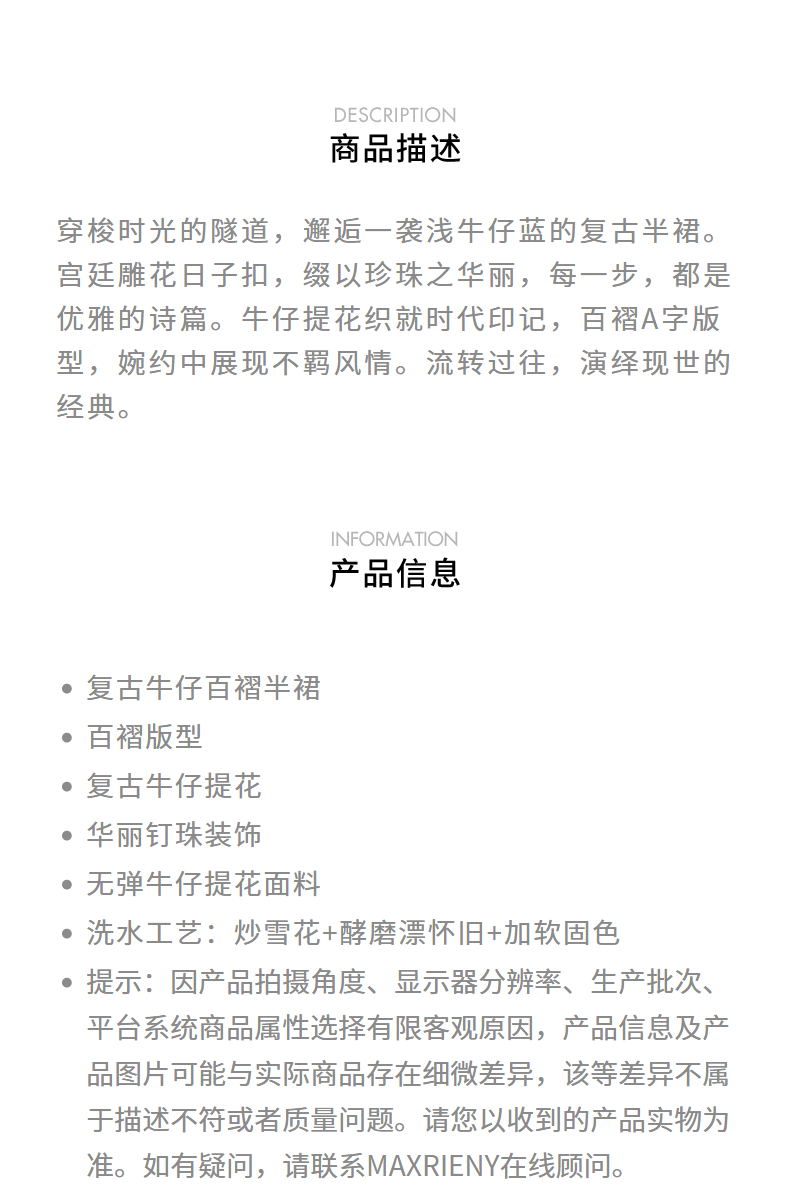 玛克门店发货:【Day Dreaming-主题纪念款】MAXRIENY华丽复古感牛仔百褶半裙(货号:MC85SK077)