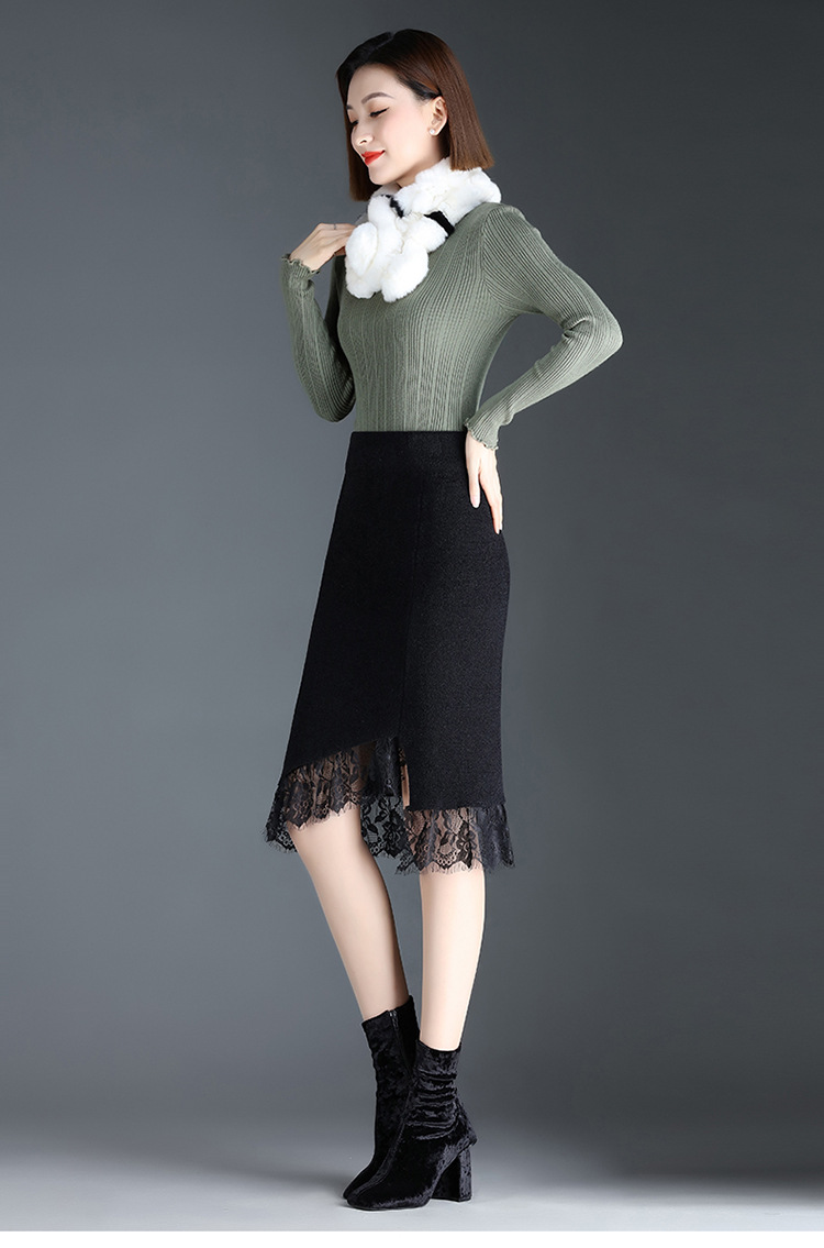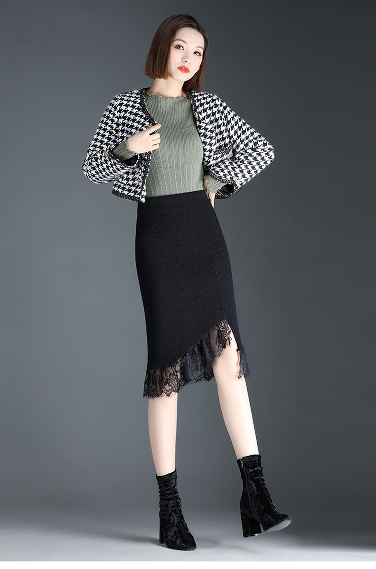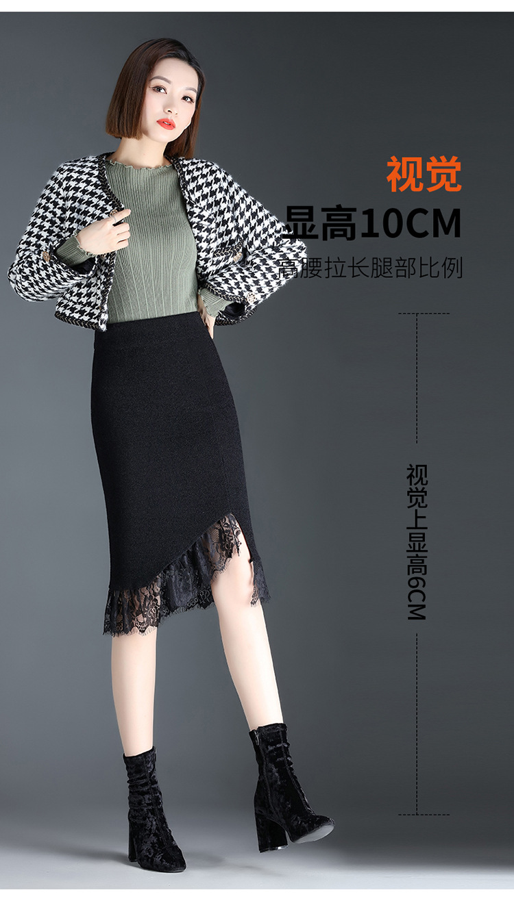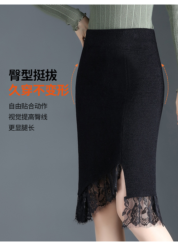 MYX-WM-68196-L中长款不规则黑色显瘦半身裙蕾丝拼接针织包臀裙秋冬款高腰一步裙