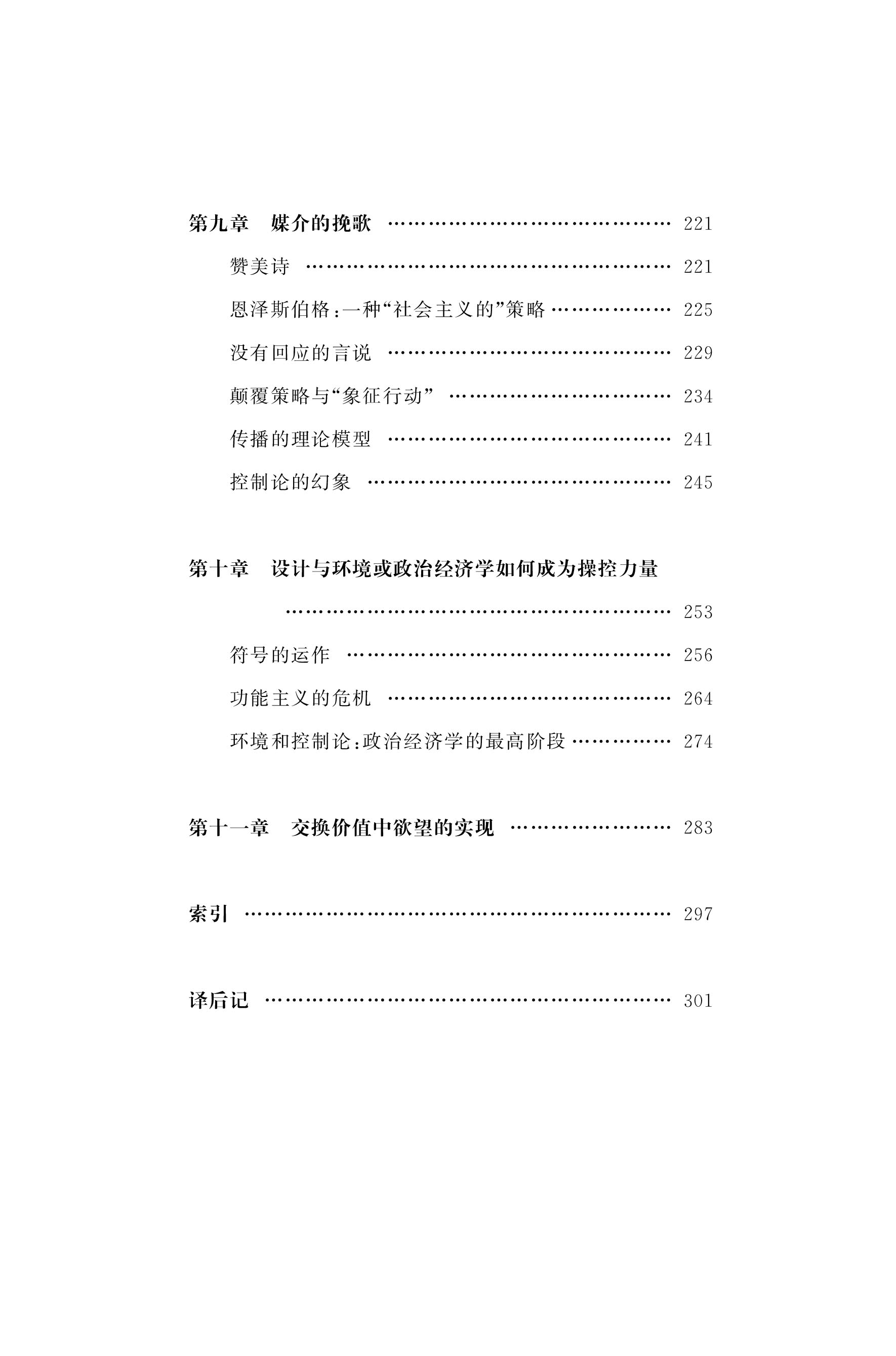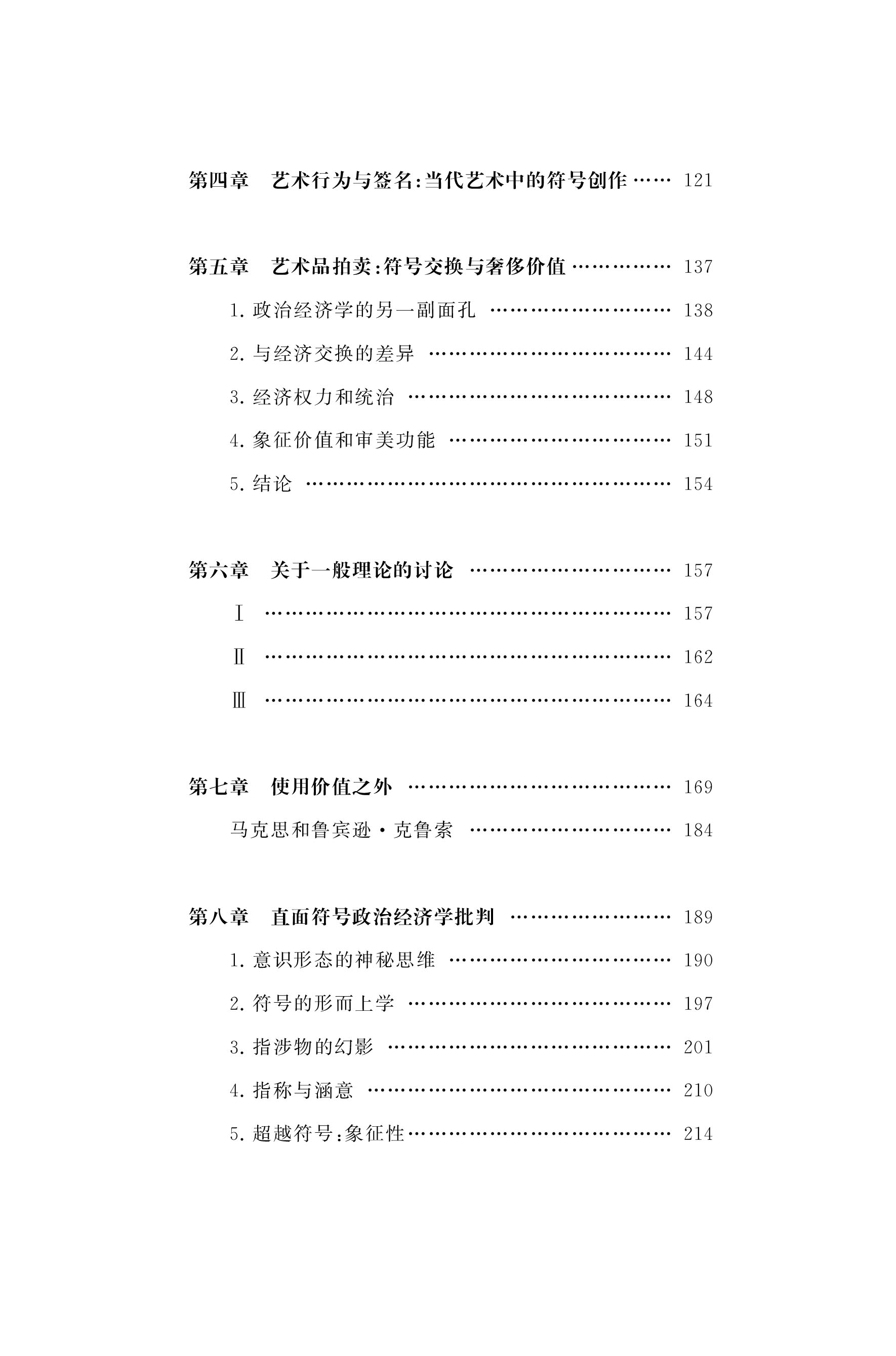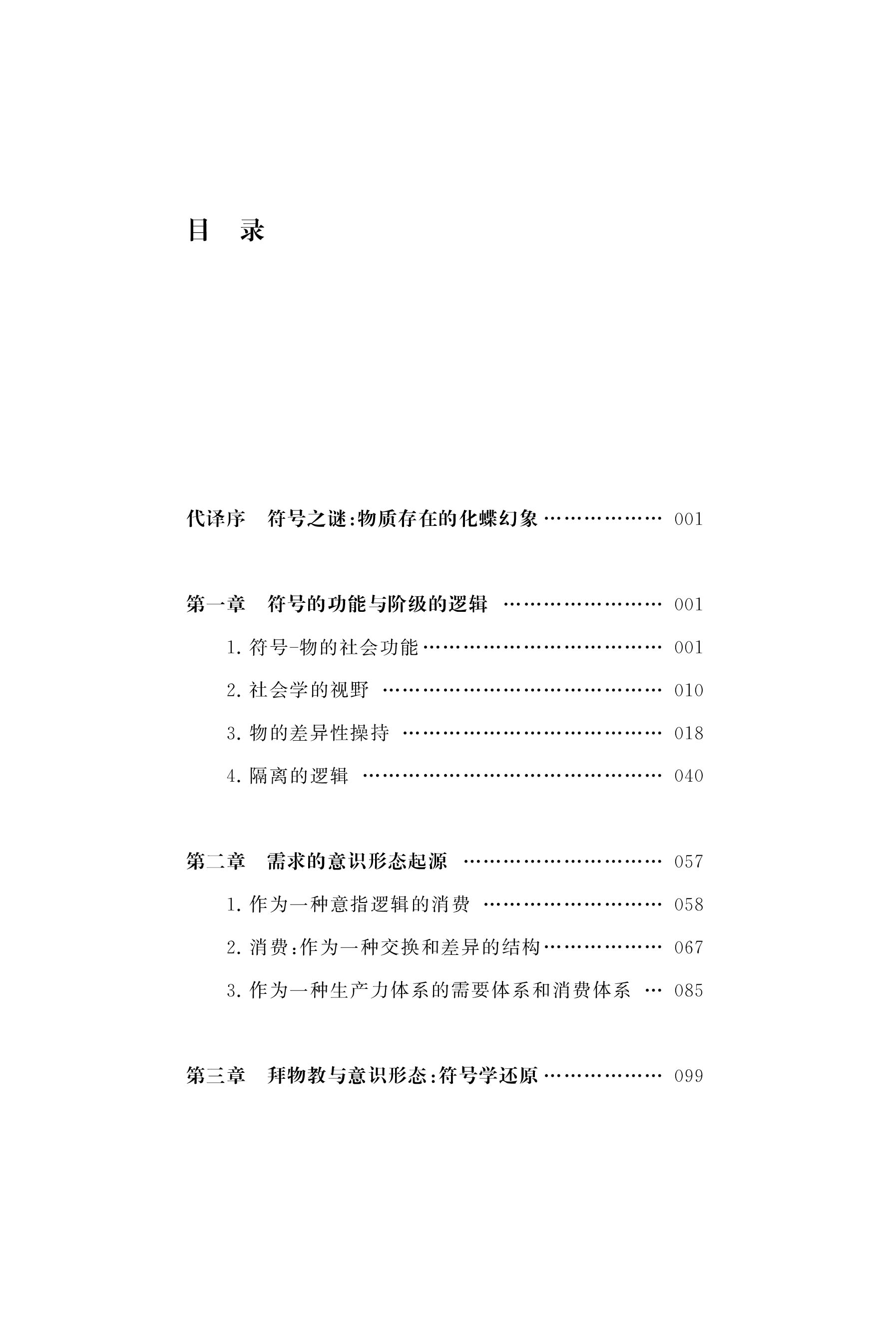 全书共分11个章节,具体内容包括符号的功能与阶级的逻辑、需求的意识形态起源、直面符号政治经济学批判、设计与环境或政治经济学如何成为操控力量等。