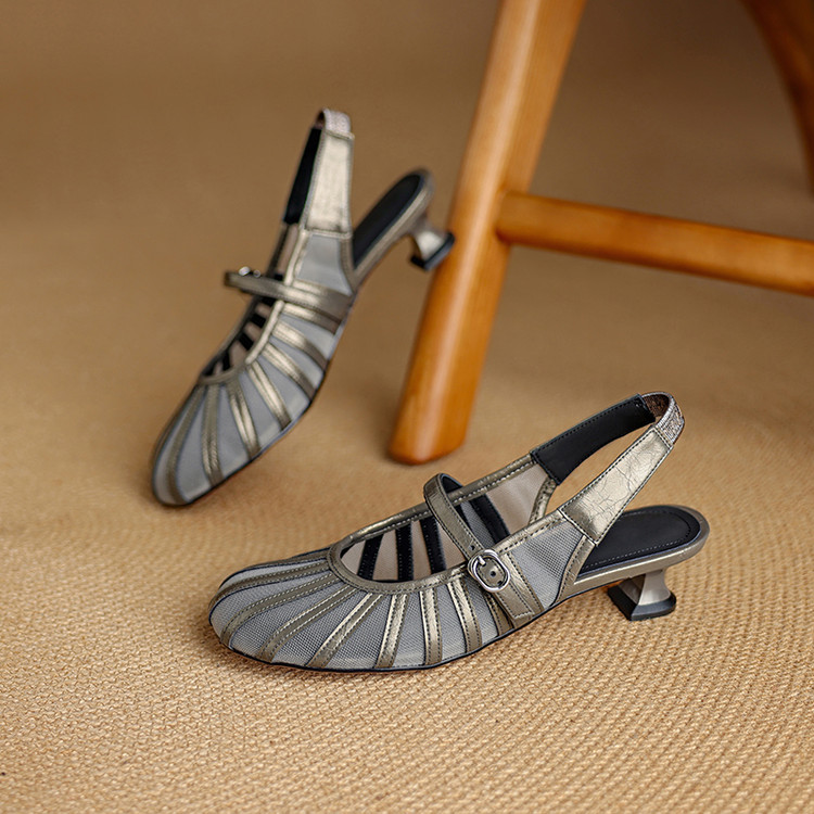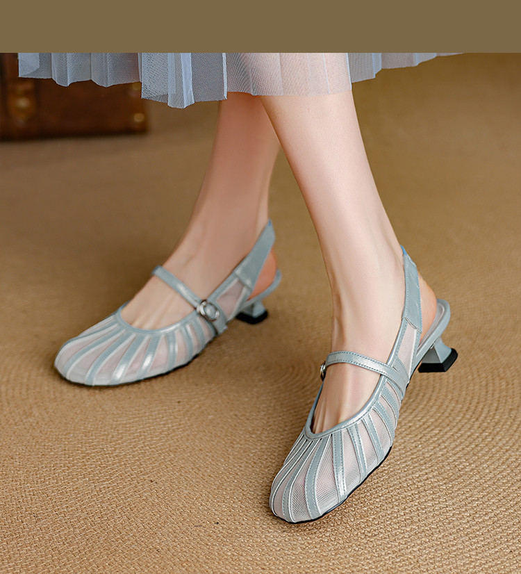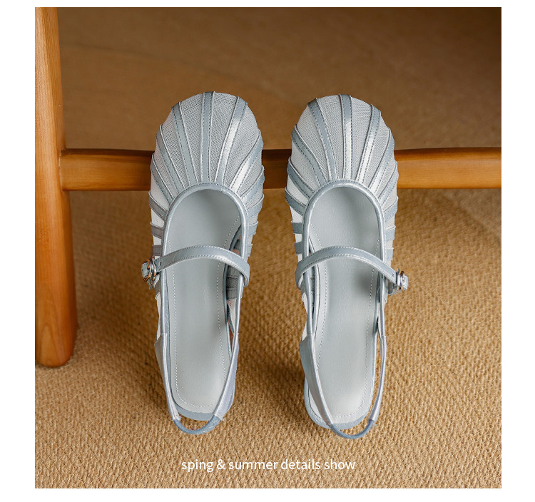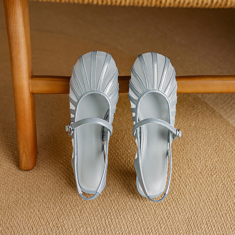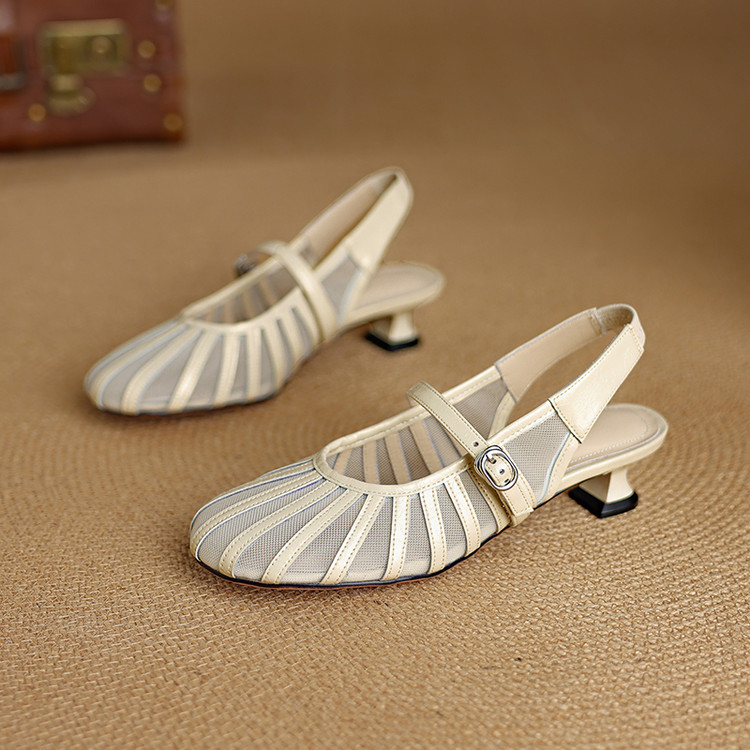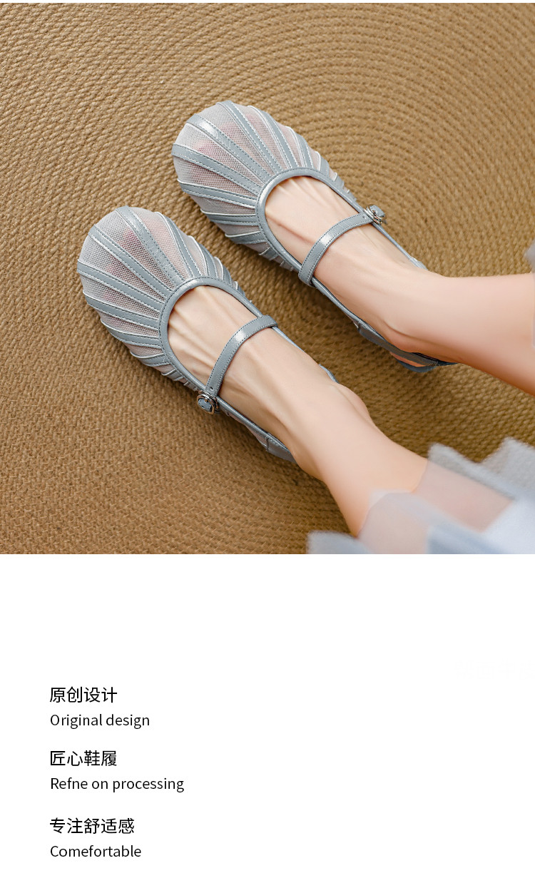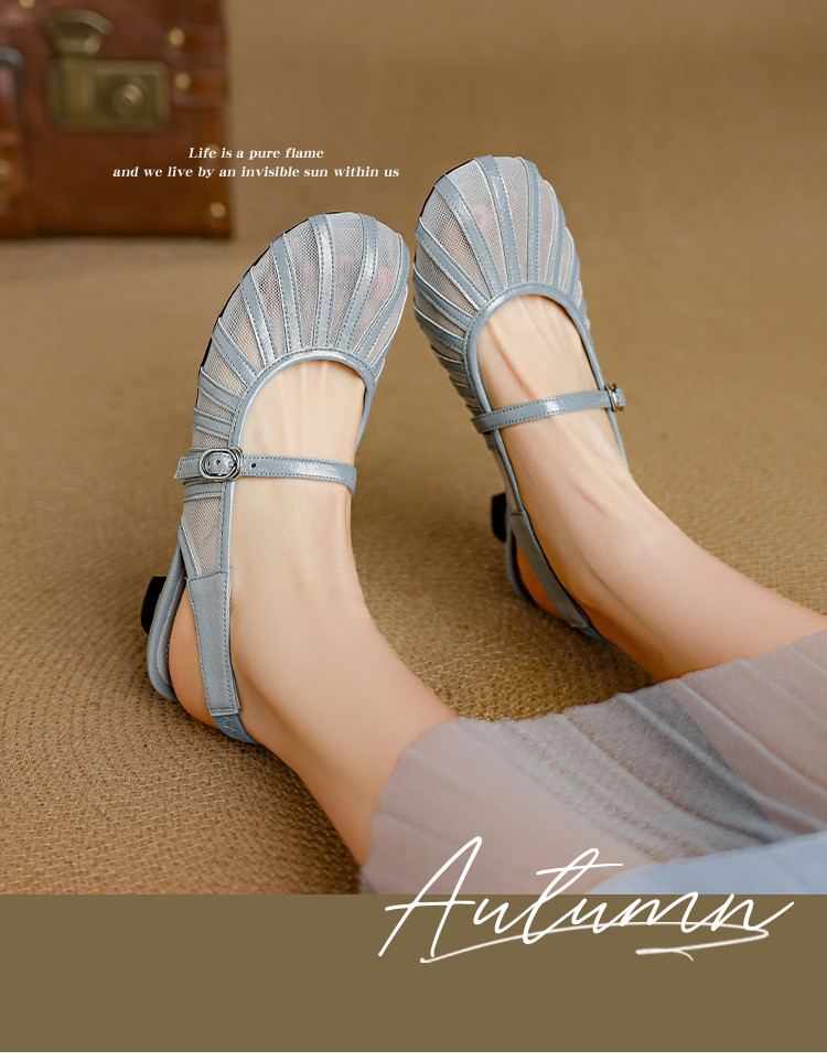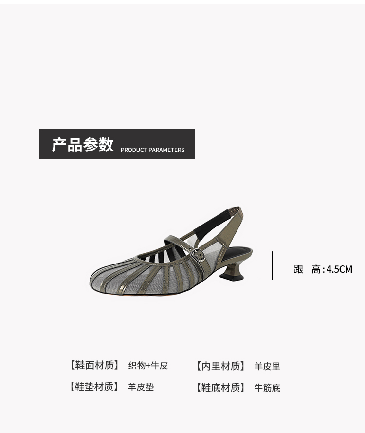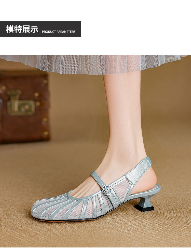 【预售5天】温柔玛丽珍风包头网纱后空凉鞋女新款韩版圆头粗中跟牛皮时装凉鞋NJMK&K1507