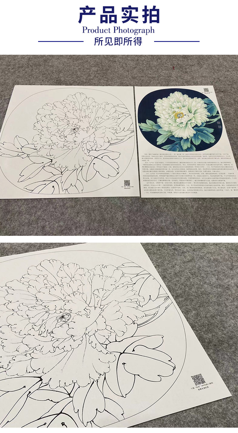 【大彩图】李晓明工笔画白描底稿圆形小品《豆绿》牡丹临摹勾线花鸟线稿KA05