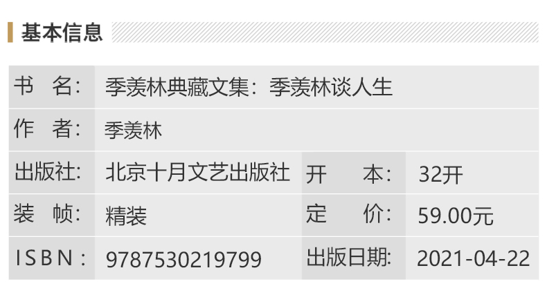 书中的涓涓溪水般的智慧就会流注于心间中,季羡林先生分享了许多他对人生意义与价值的感悟,包括怎么样去为人处世,怎么样去看待命运与缘分。除了这些大的人生奥义,书中还教你怎样交朋友、怎样对待毁誉、怎样对待压力、怎样认识老年、怎样看待衣着款式等具体而细致的问题。这本书在道理时并不死板教条,有着感人肺腑的真情和才会横溢的哲思,每次读来都能回味尤甘。——沙溢