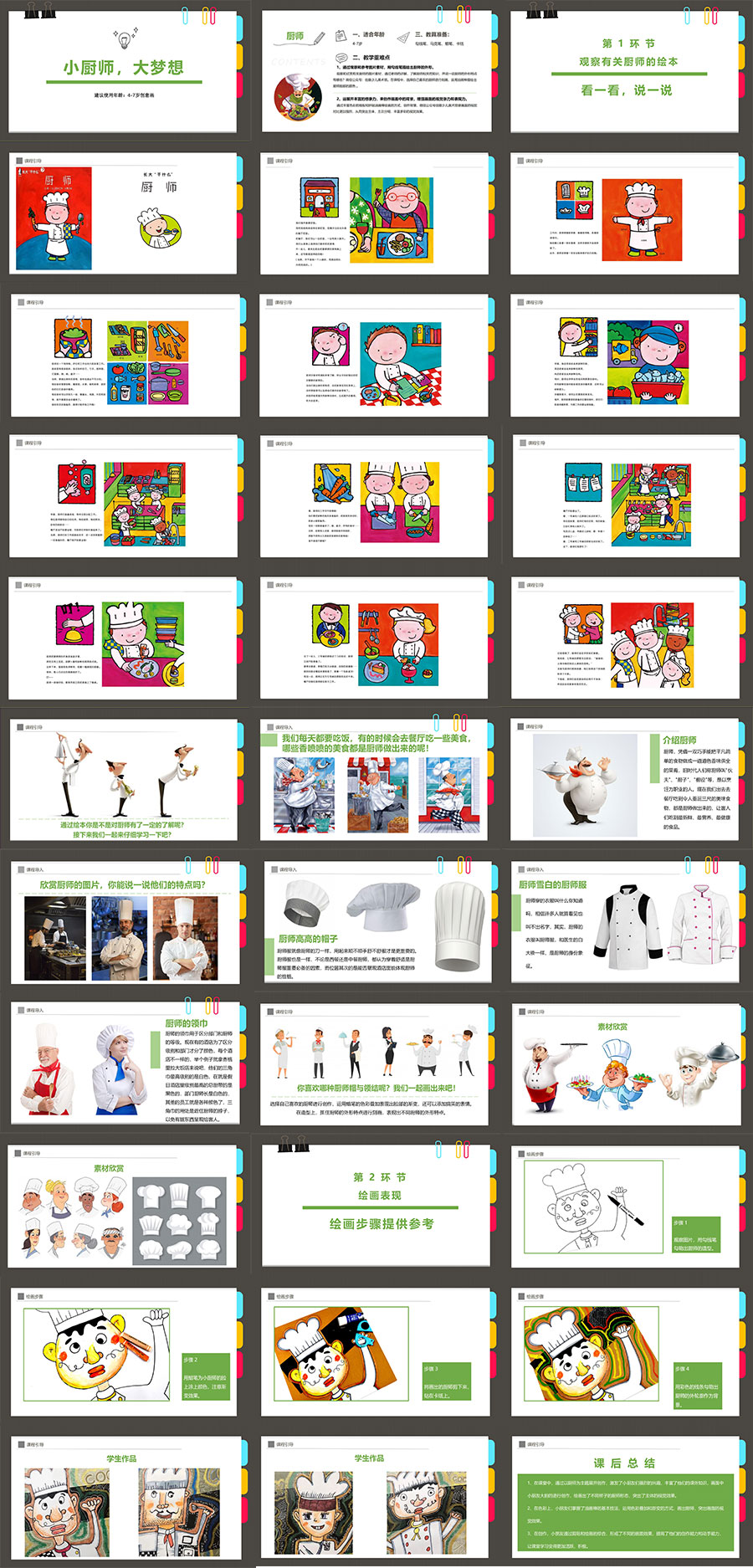 观察和欣赏有关厨师的图片素材,通过老师的讲解,了解厨师相关的知识,并说一说厨师的外形特点有哪些。在课程中,选择自己喜欢的厨师进行刻画,运用油画棒描绘出厨师脸部的颜色 。