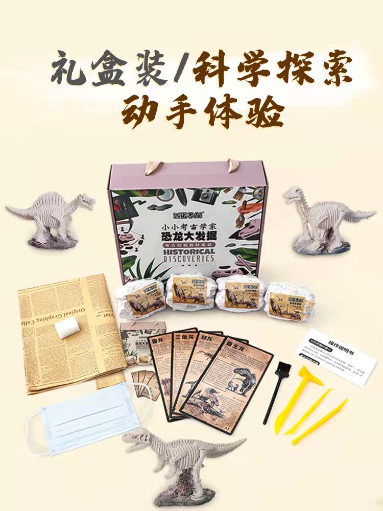 【商品附件】4块考古化石+4张知识卡+说明书+考古工具一套+防尘垫+儿童口罩
