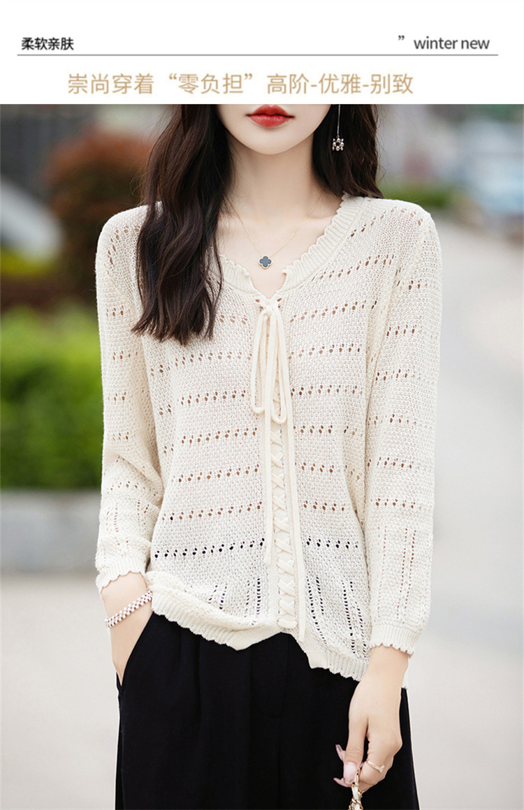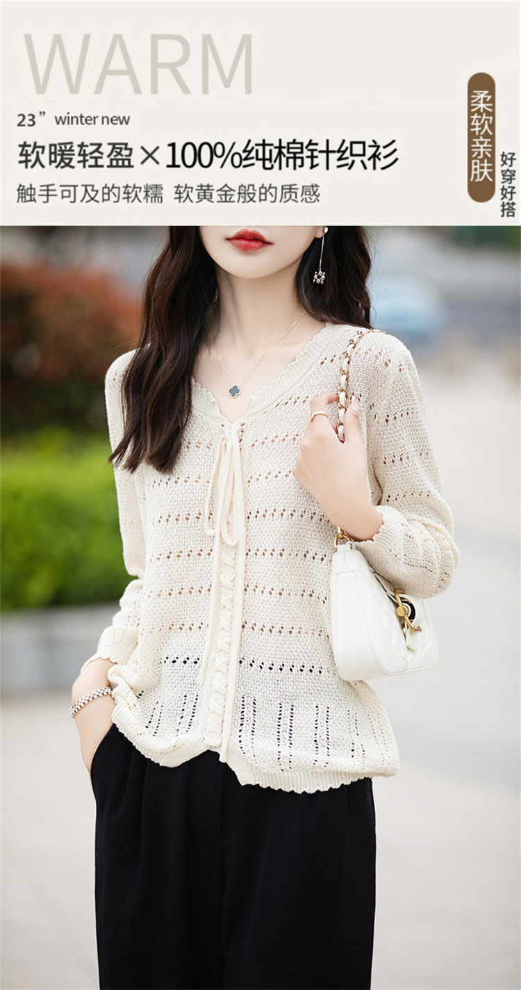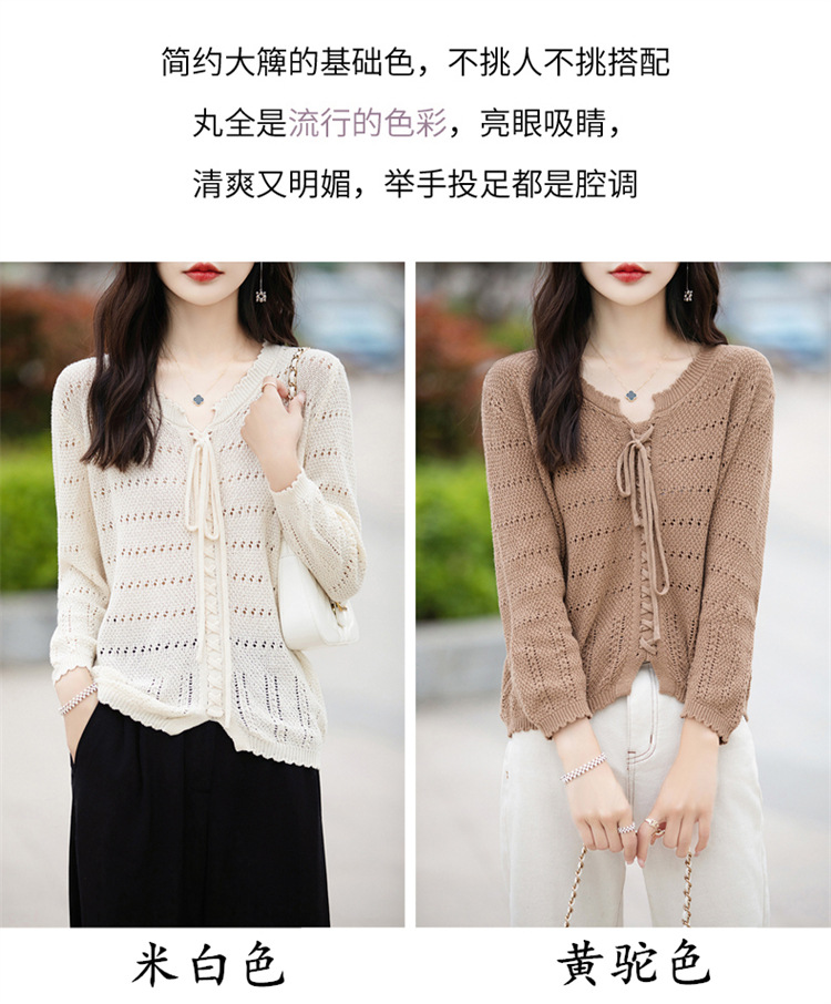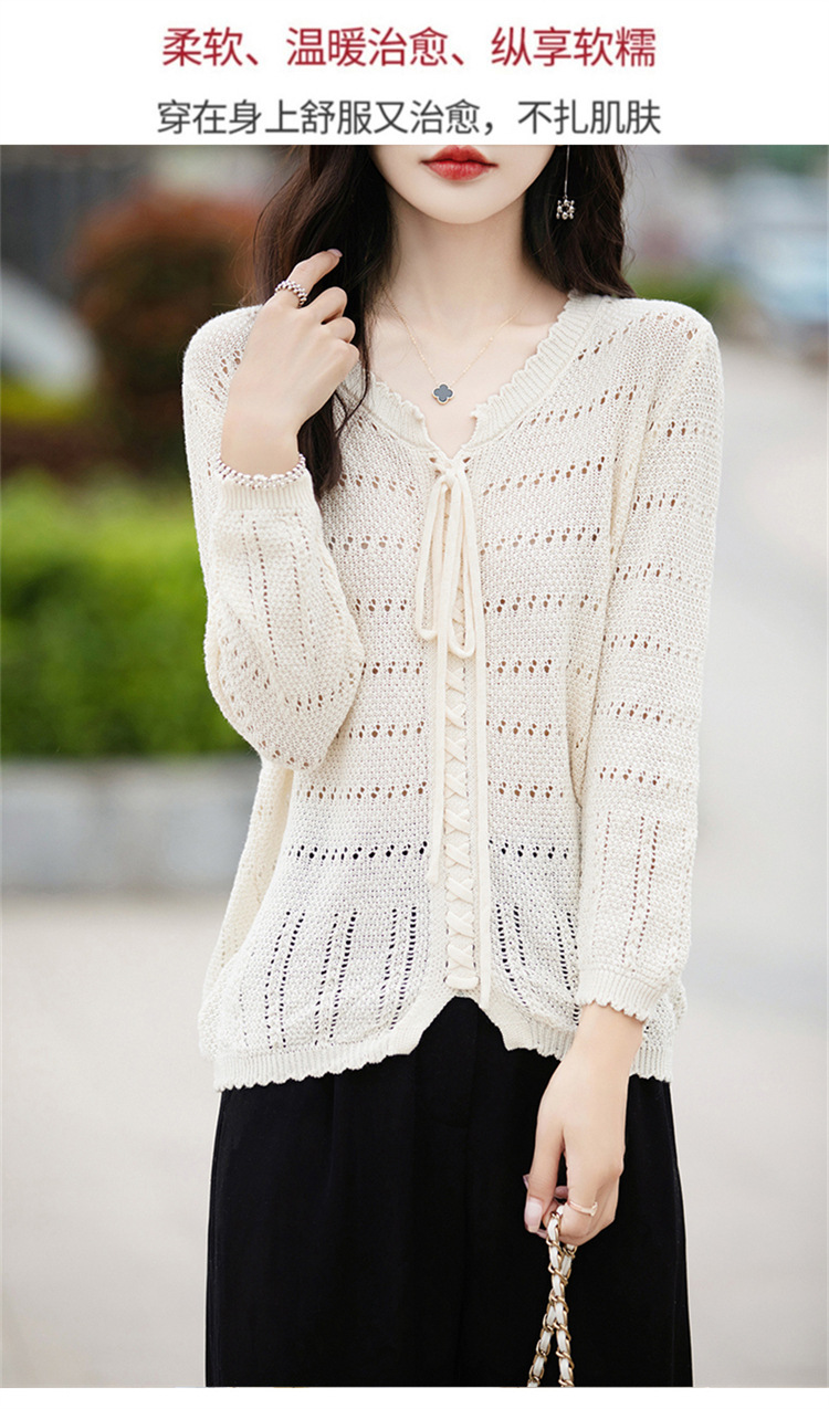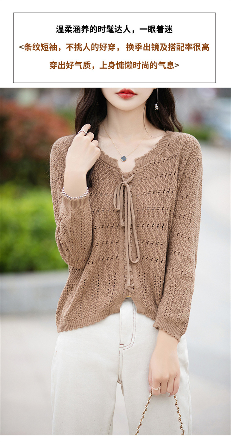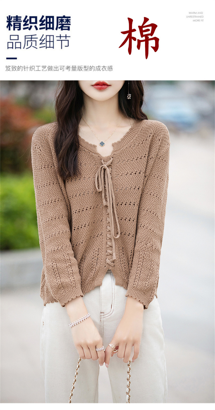 丁摩 春夏新款纯棉线镂空针织衫上衣女洋气小衫宽松显瘦薄款系带空调衫5ZF-115