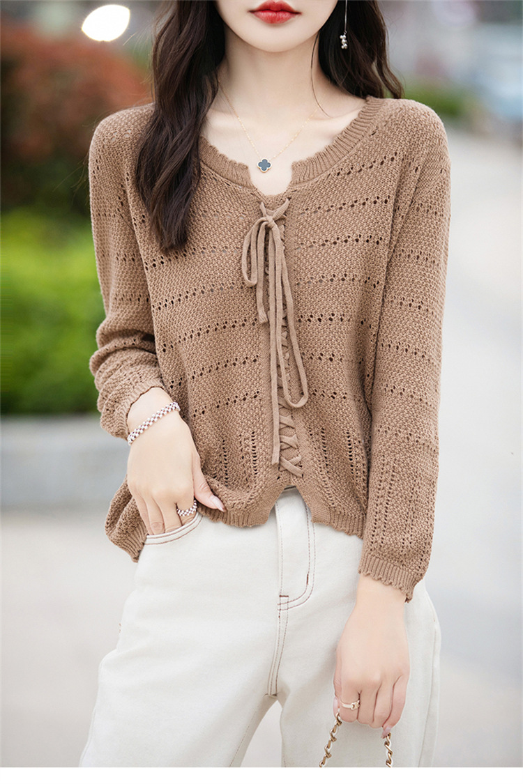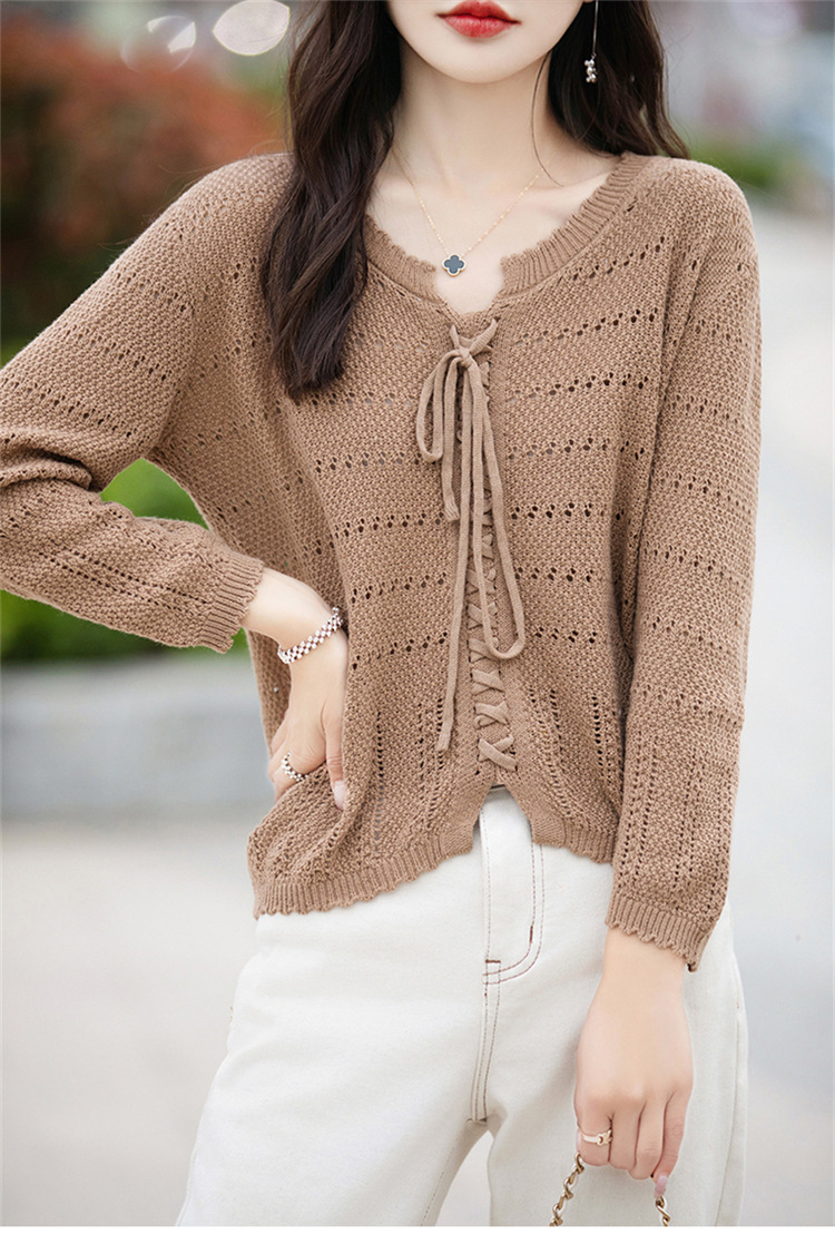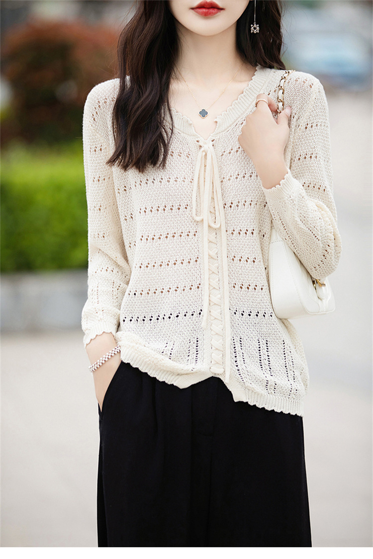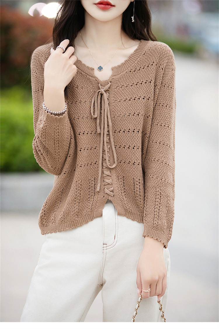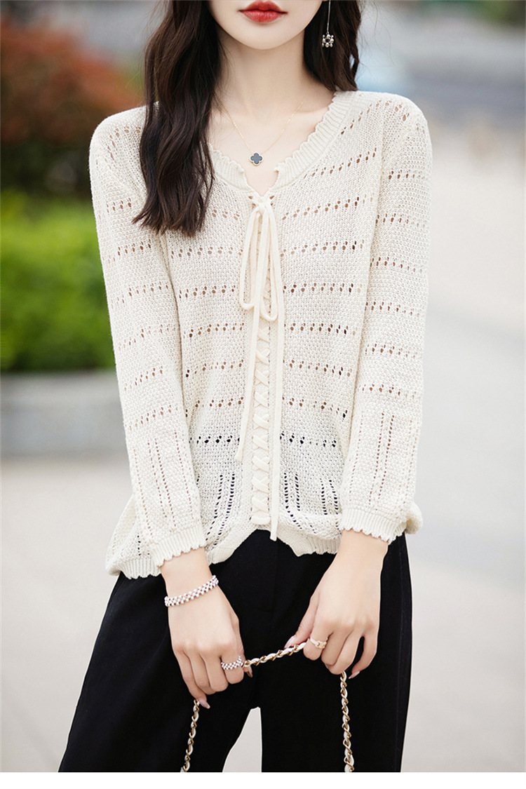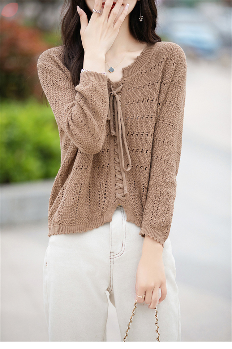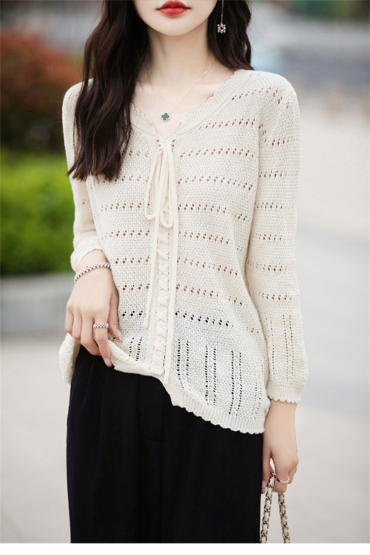 丁摩 春夏新款纯棉线镂空针织衫上衣女洋气小衫宽松显瘦薄款系带空调衫5ZF-115