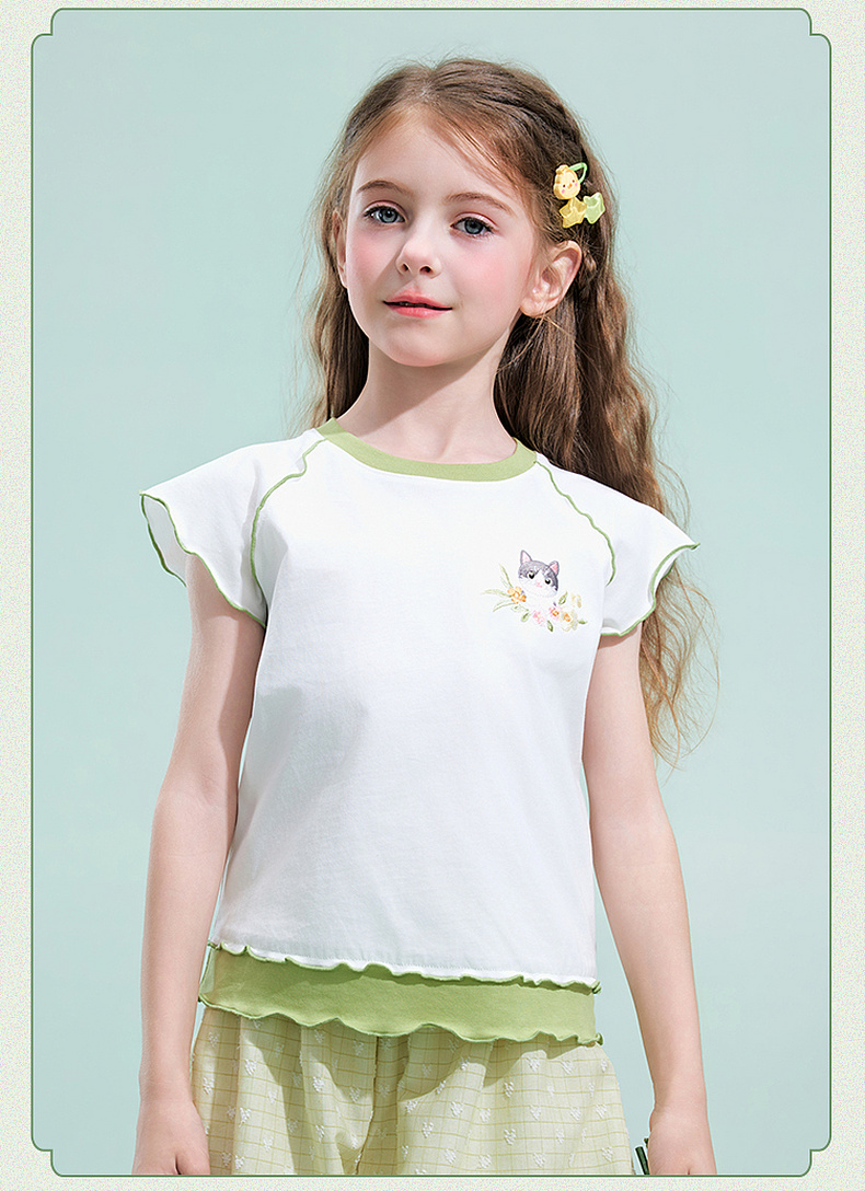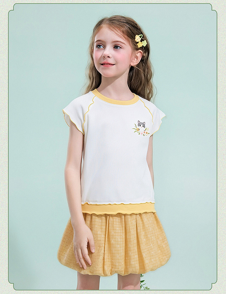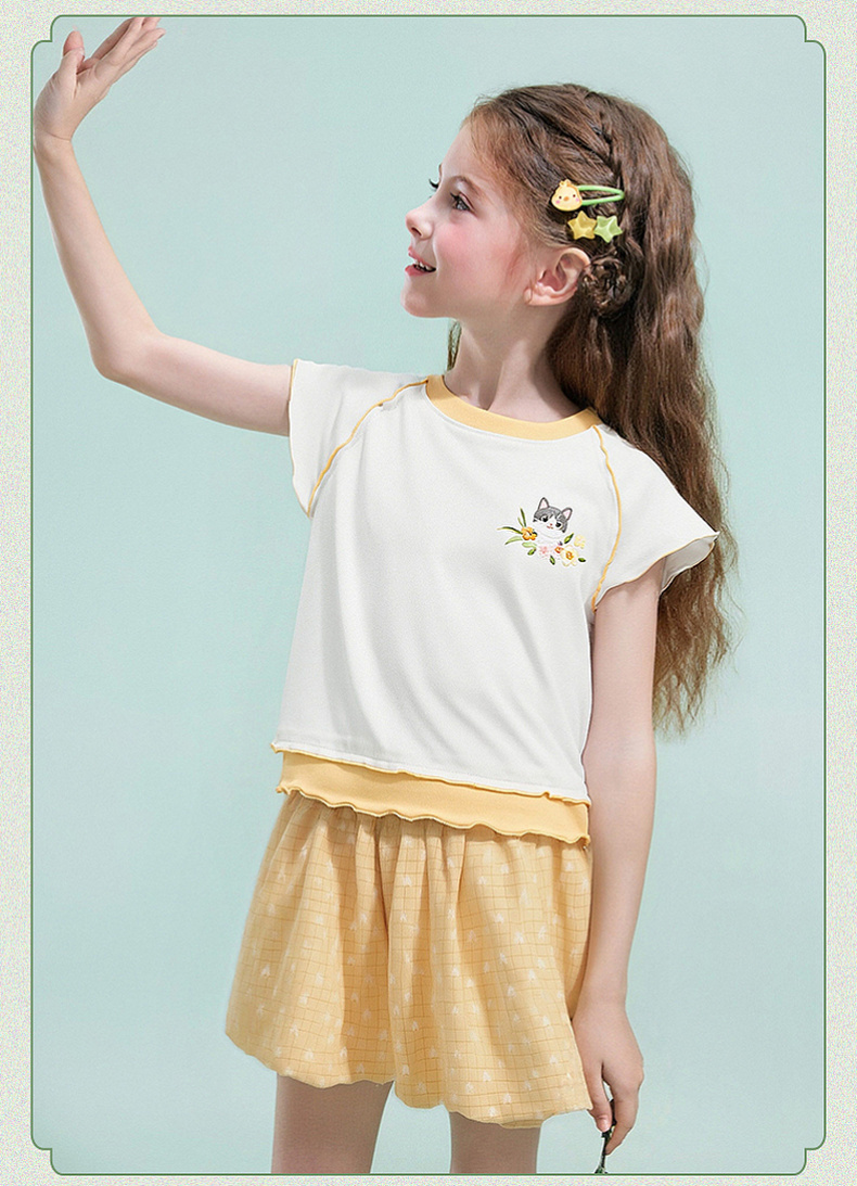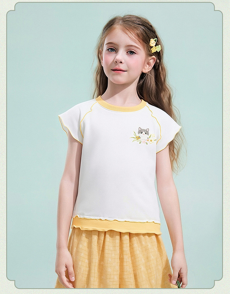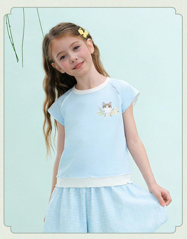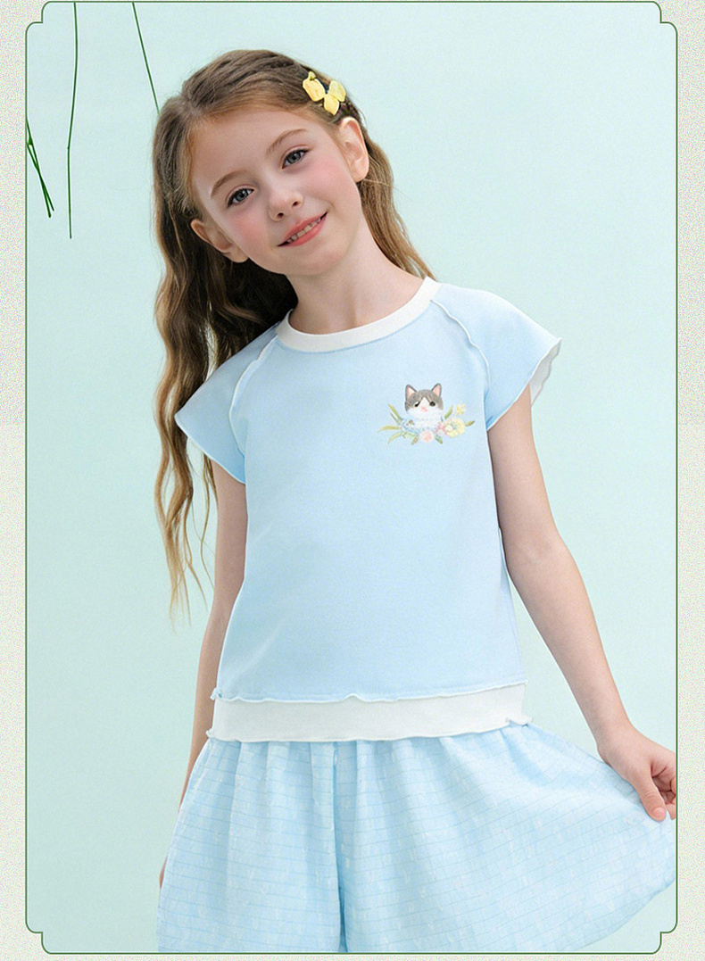 笛莎/Deesha 【观山见】2026年夏季新款女童中大童国风绣花撞色拼接短袖T恤