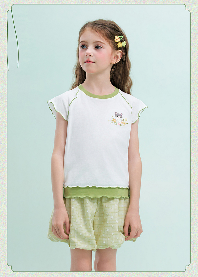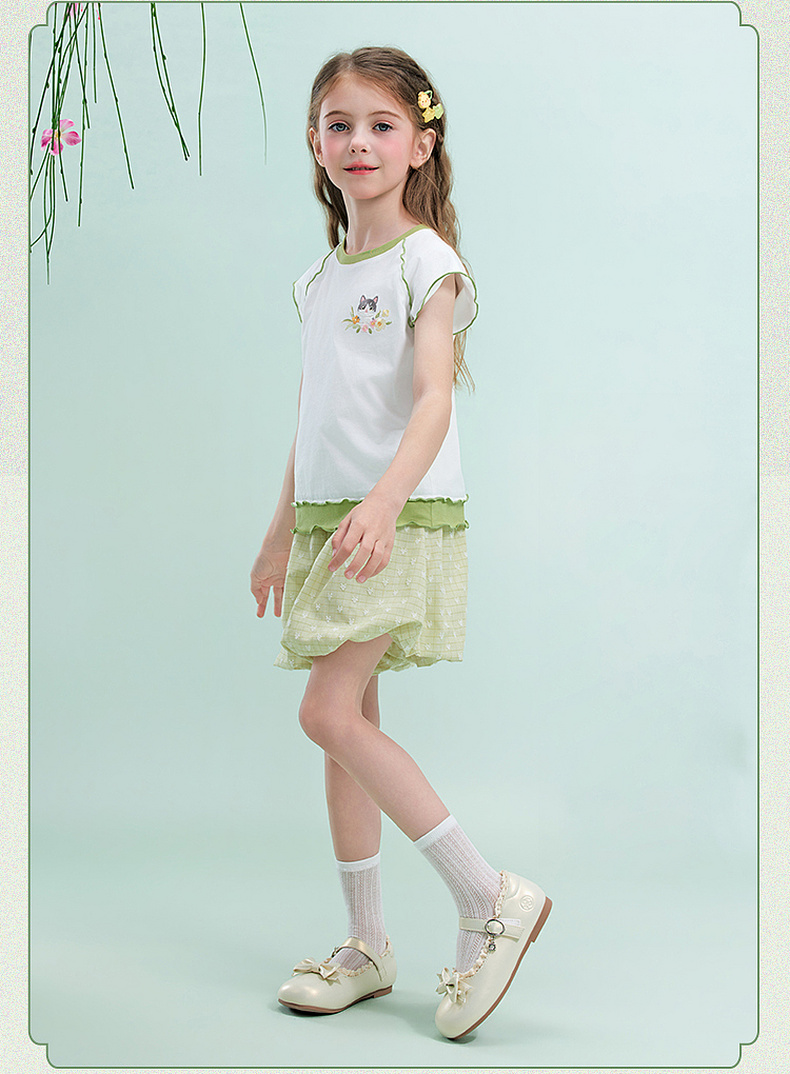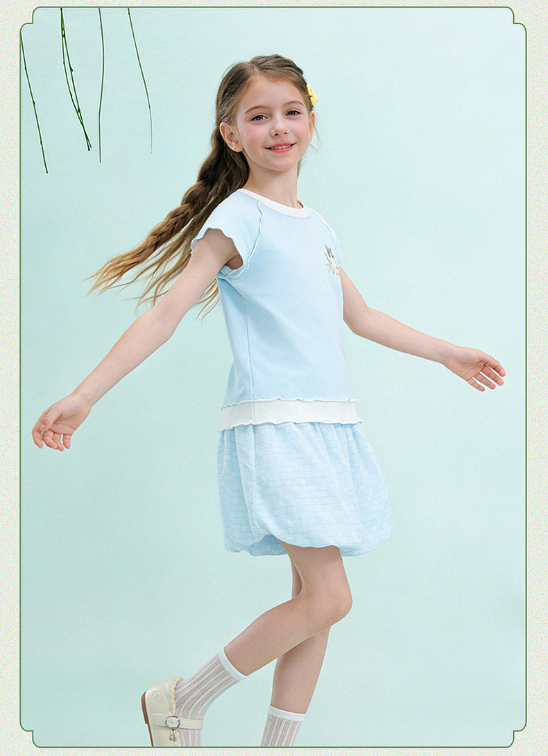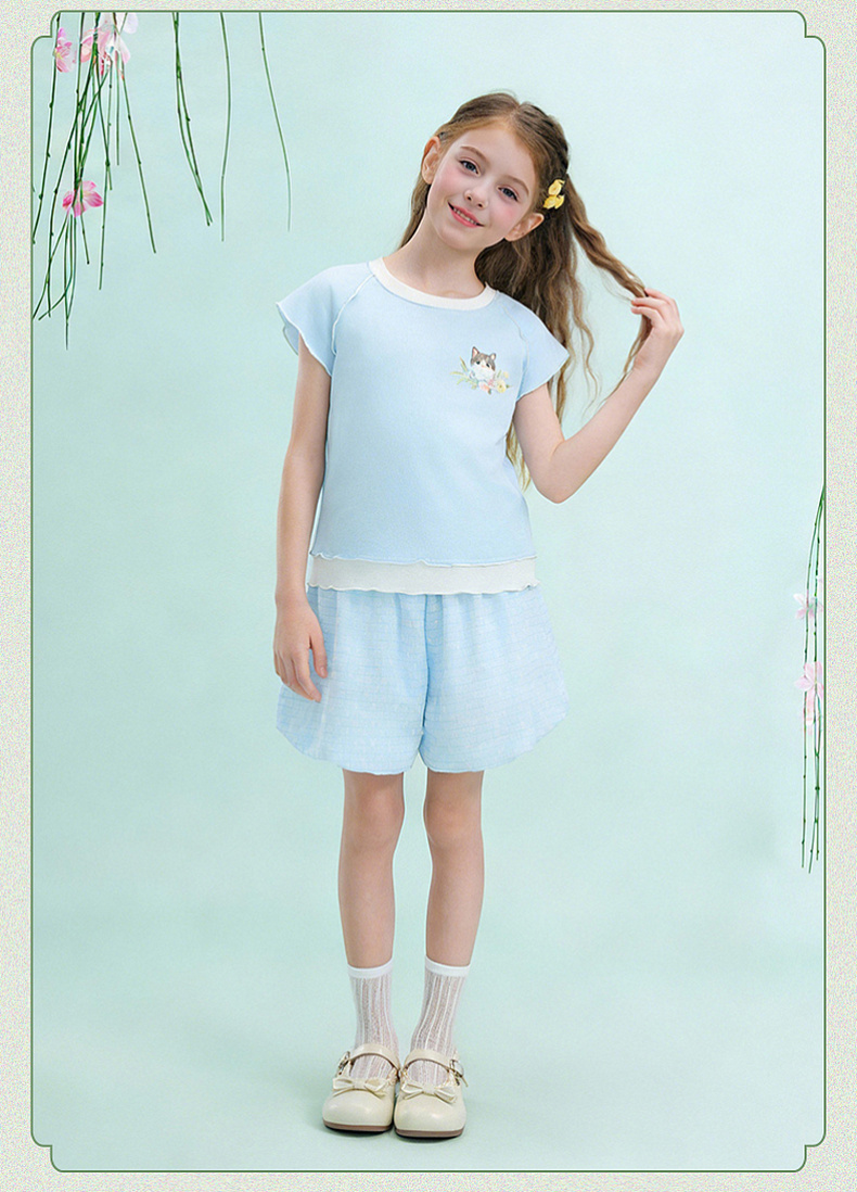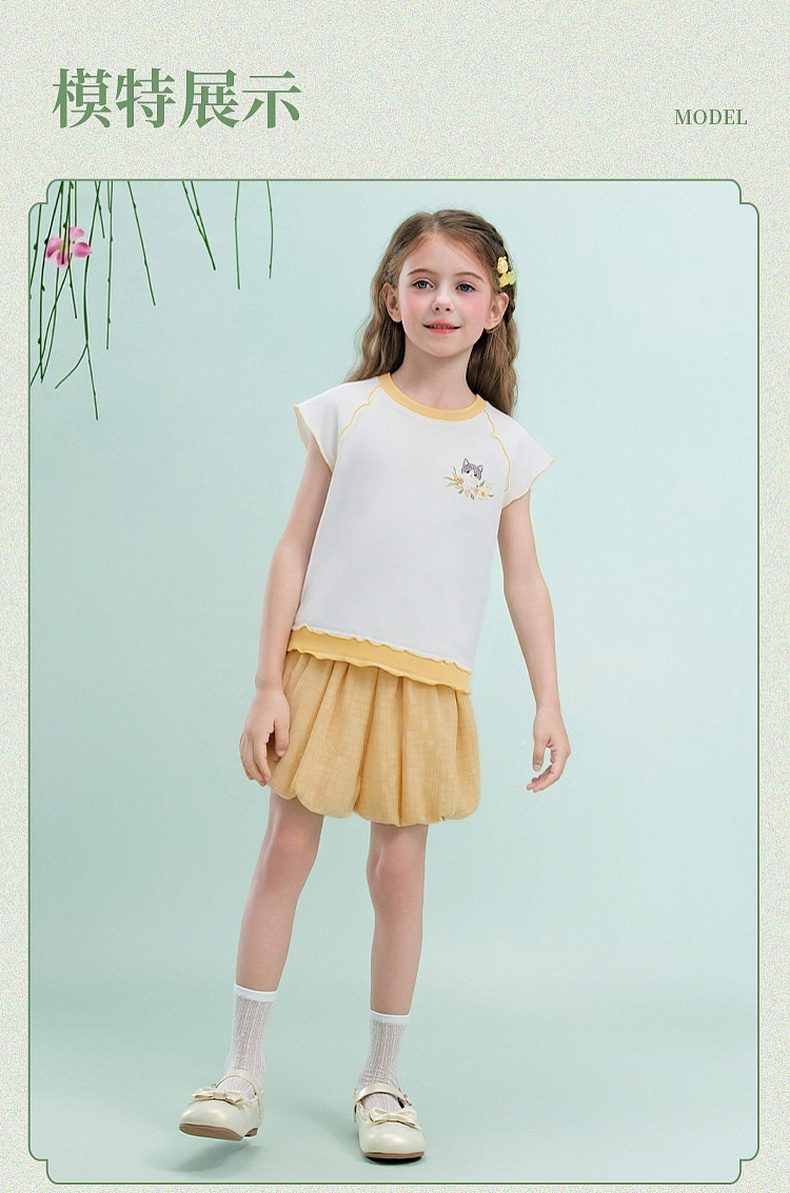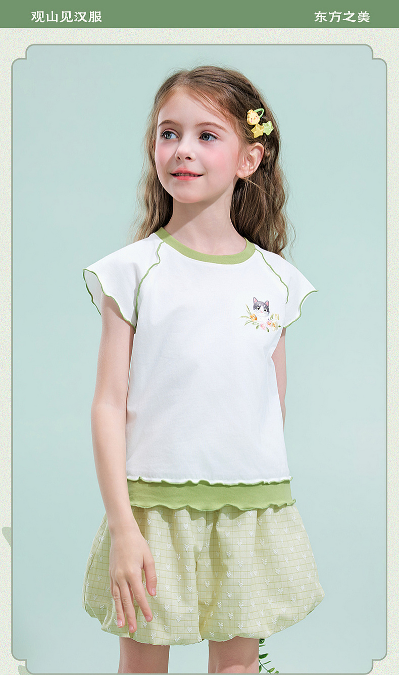 笛莎/Deesha 【观山见】2026年夏季新款女童中大童国风绣花撞色拼接短袖T恤
