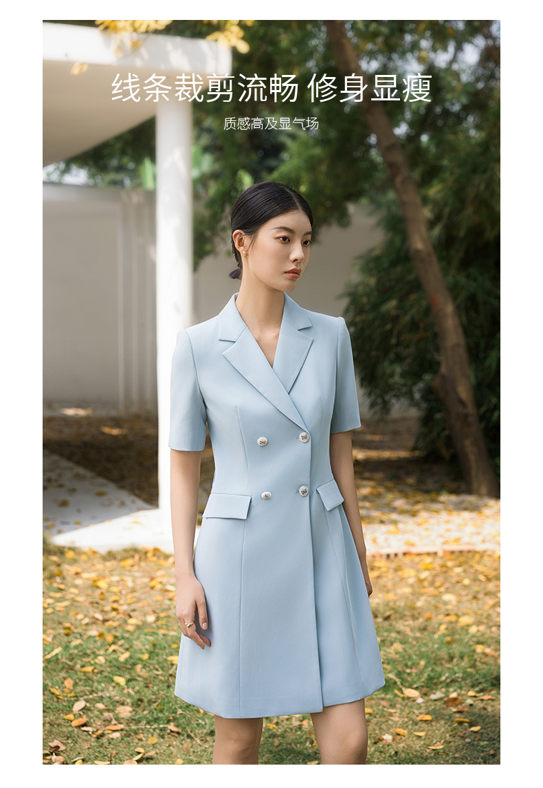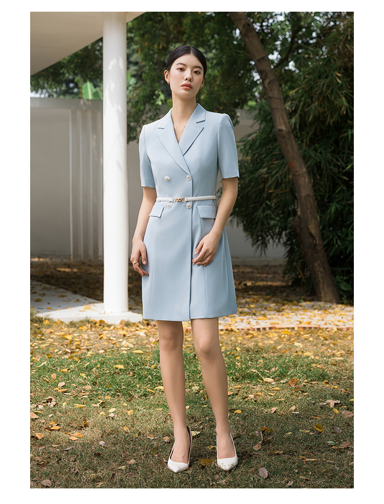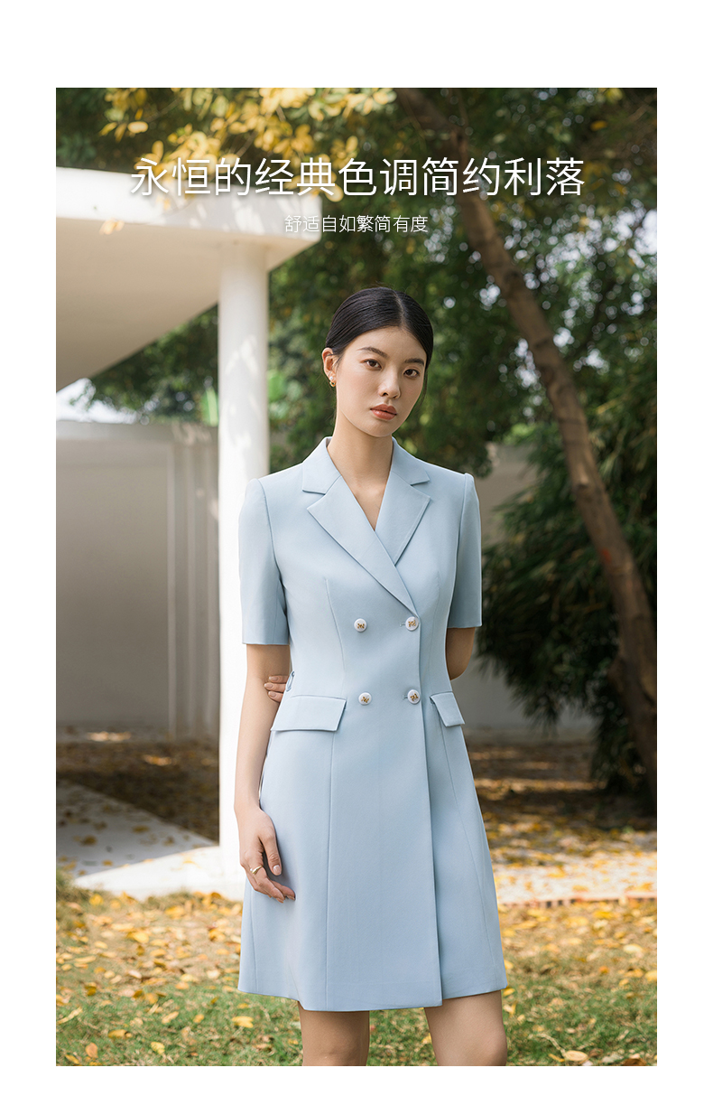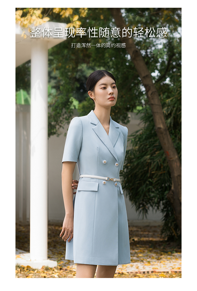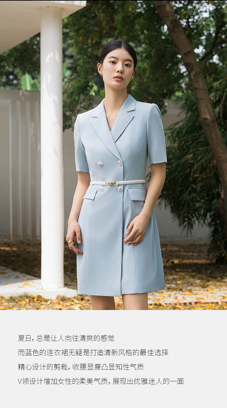 IWY/蓝色西装连衣裙短袖高级优雅名媛商务通勤医美职业ol工装裙子Q14236