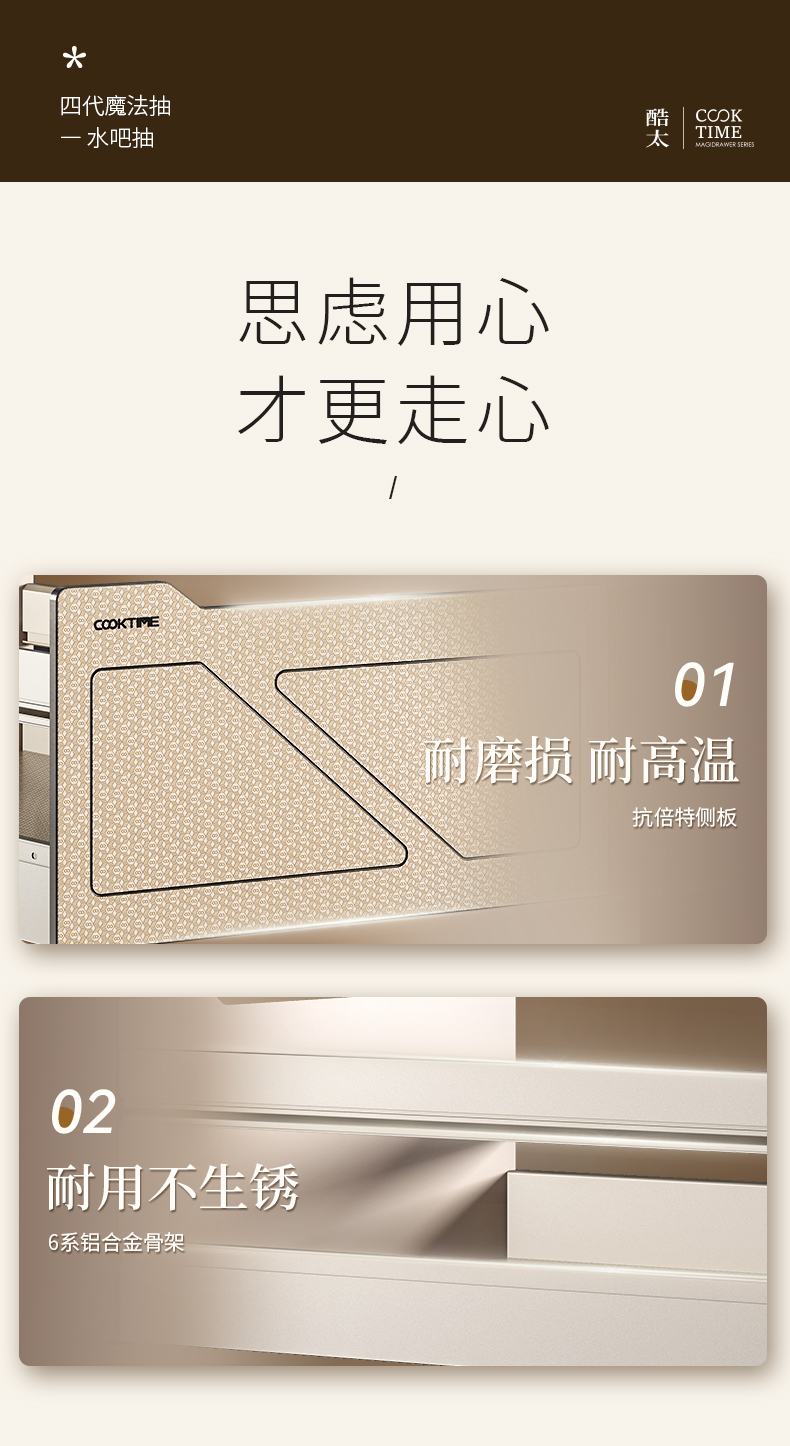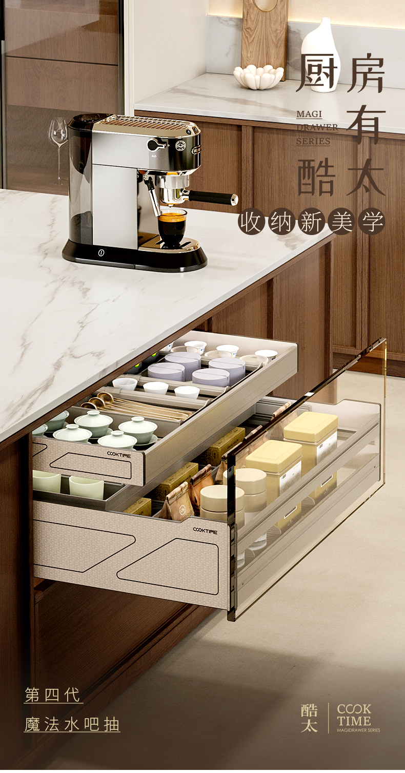 - 酷太坚持8年自主研发,已获得专利证书130项,拥有一套领先市场的厨房收纳系统,为千万中国家庭解决厨房脏乱差,缔造厨房新生活。