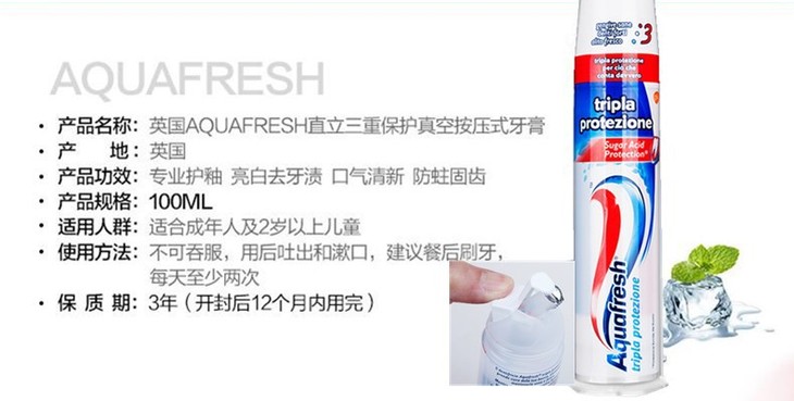 买一赠一【直立+盖按压式】意大利进口Aquafresh三色牙膏 去口臭 去黄牙黑牙 口气清新