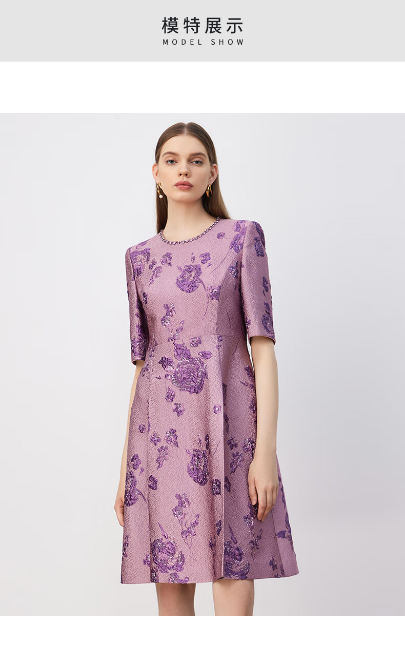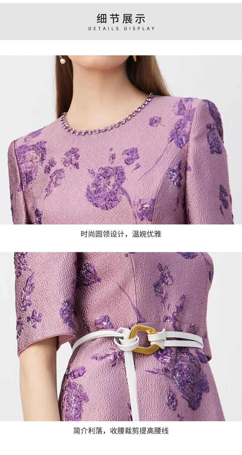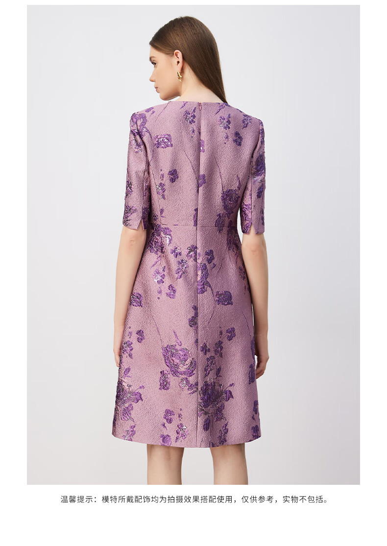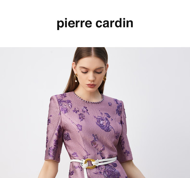 皮尔卡丹女装连衣裙圆领提花高级感五分袖通勤裙子P3329E3902F3