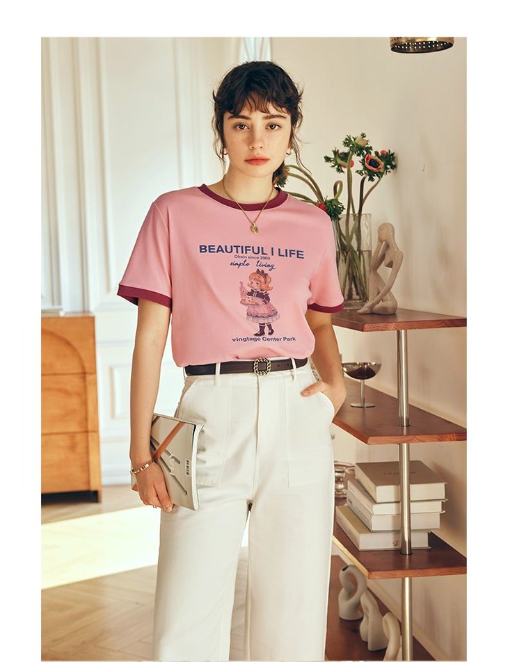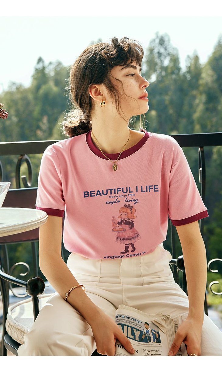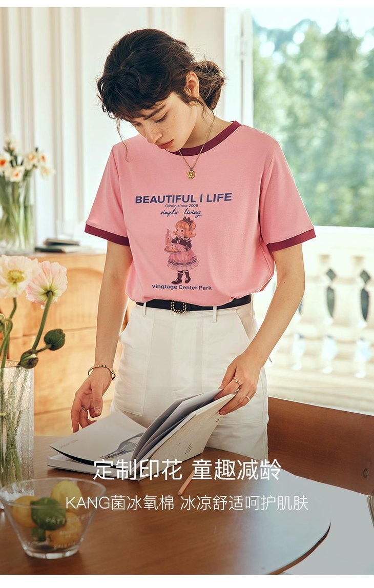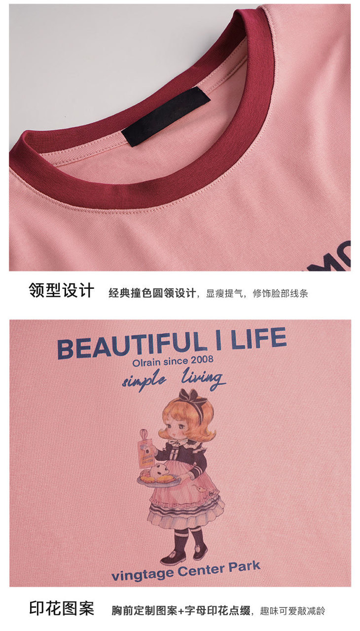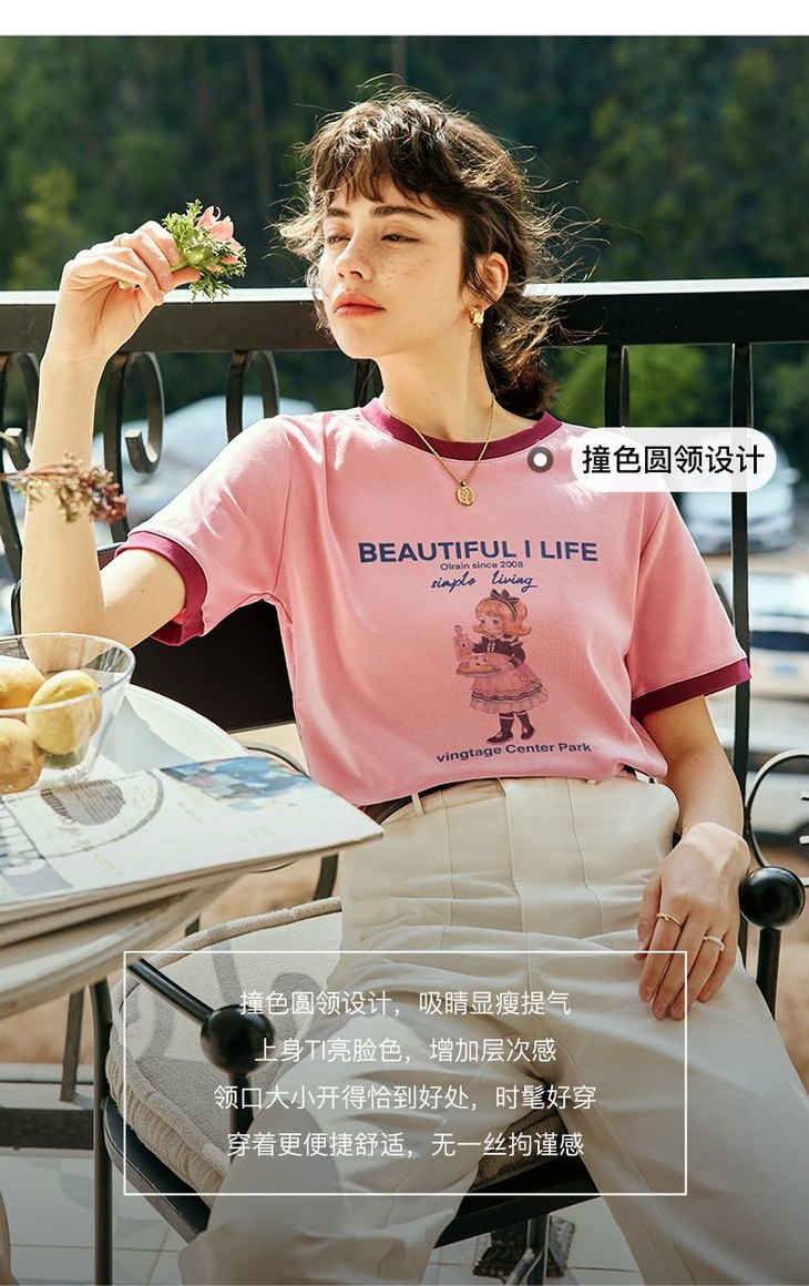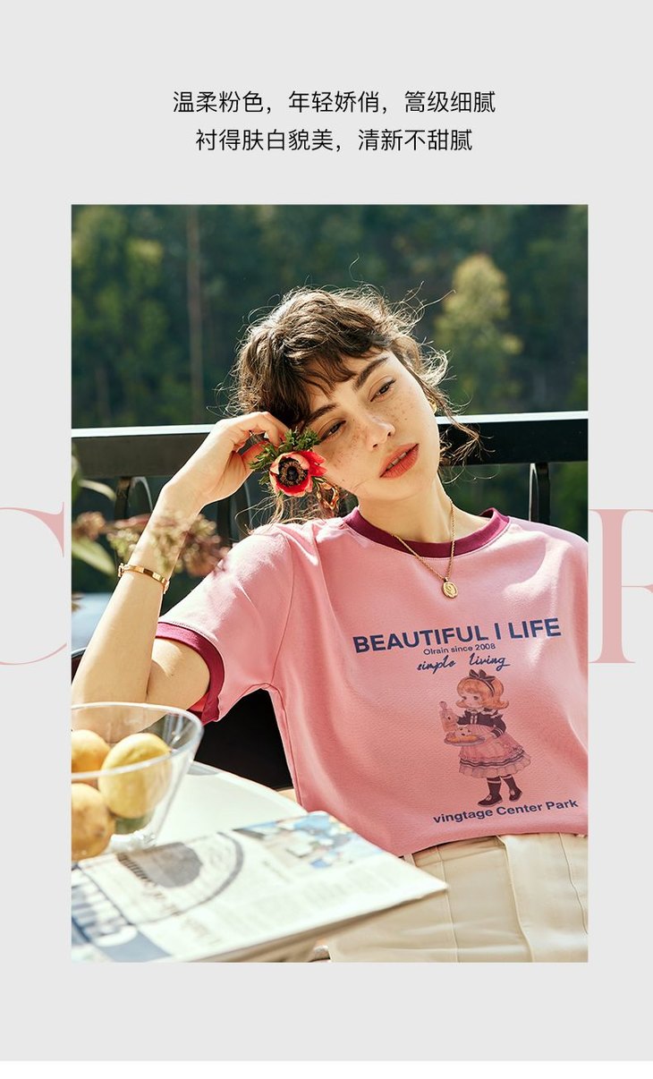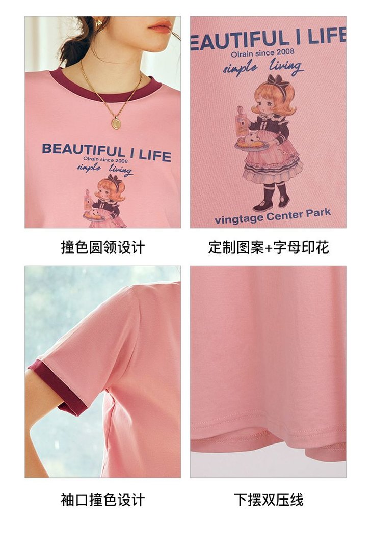 OLrain欧芮儿法式粉色短袖T恤女夏季2023年新款宽松印花百搭上衣
