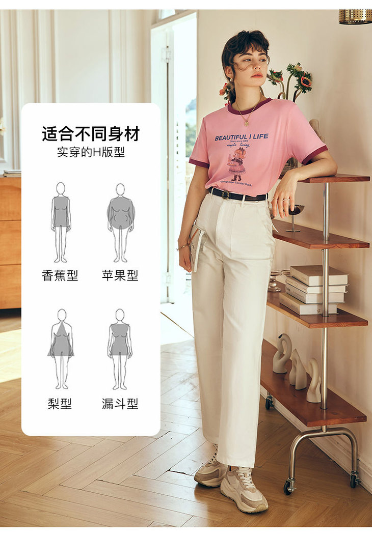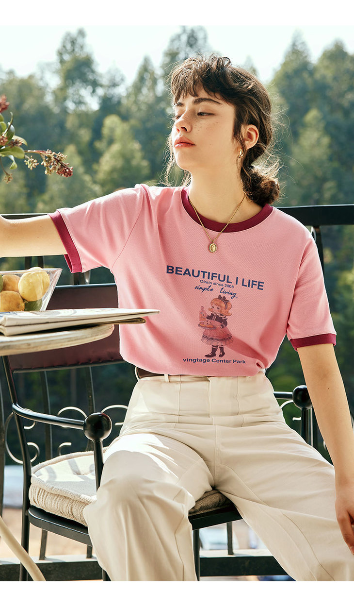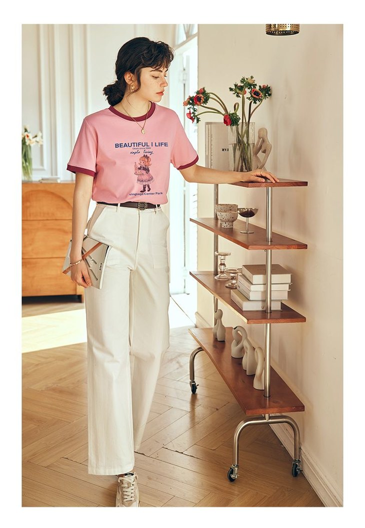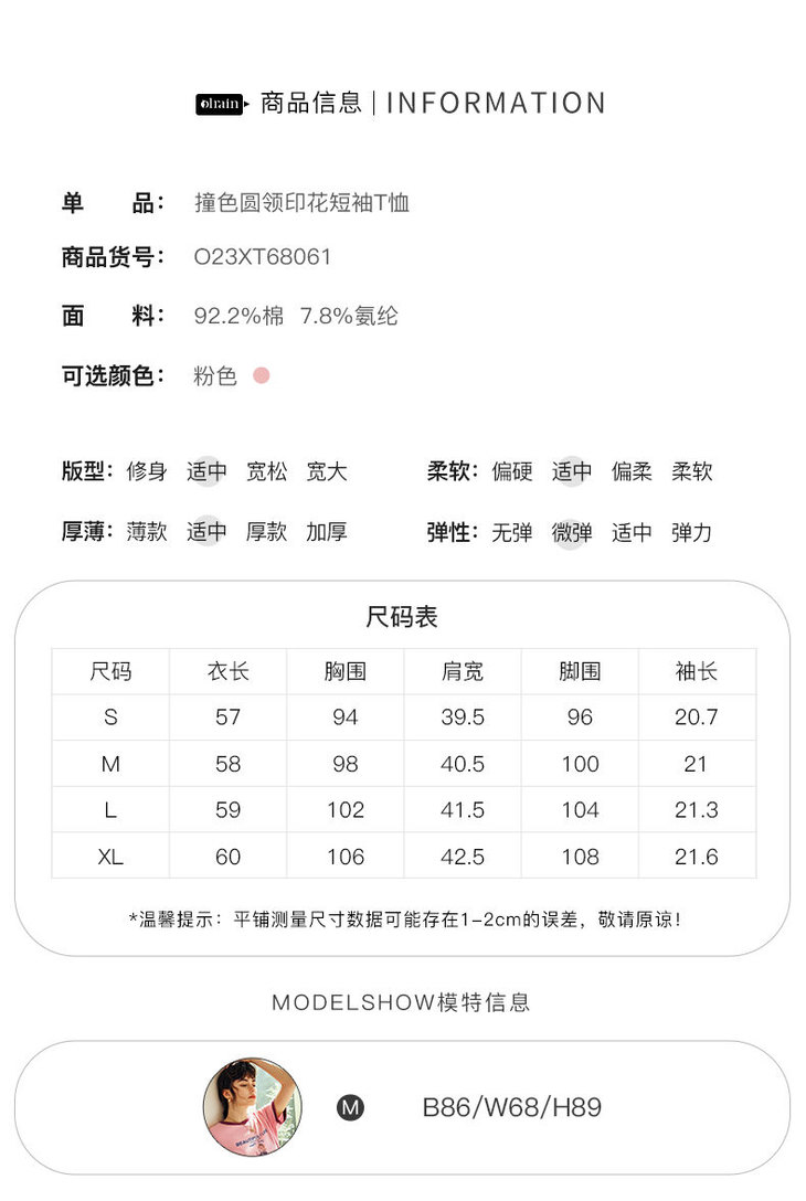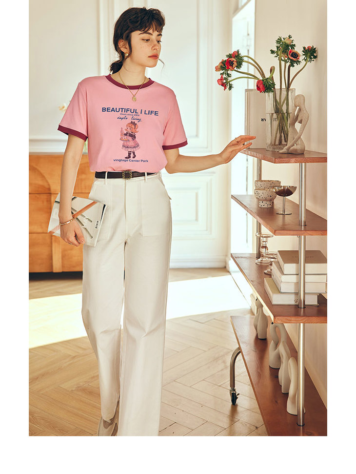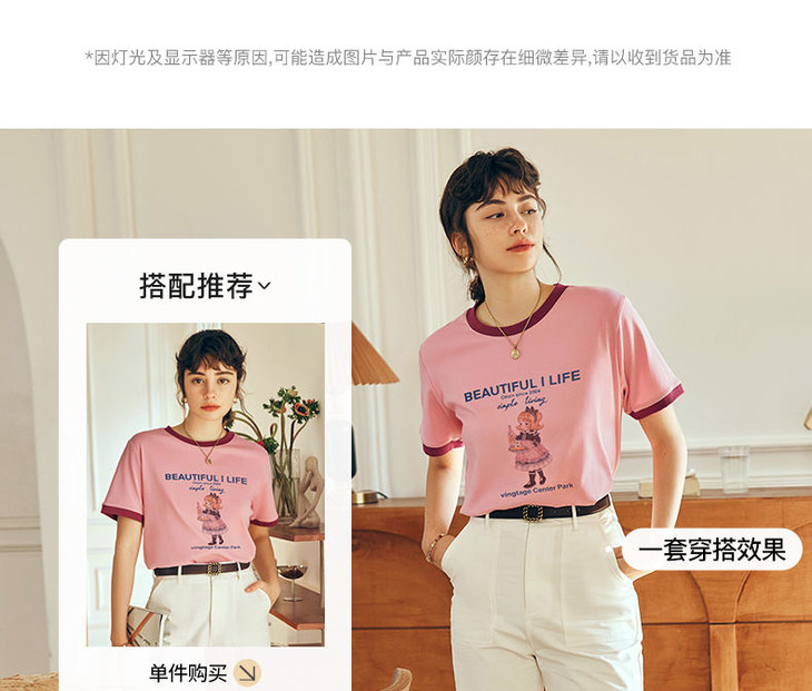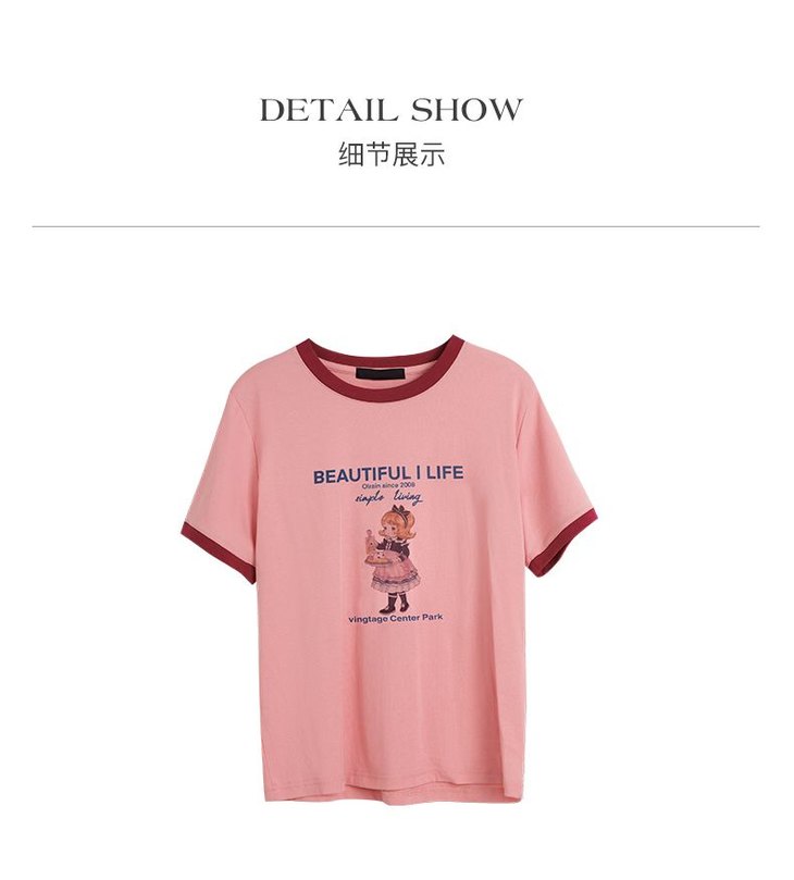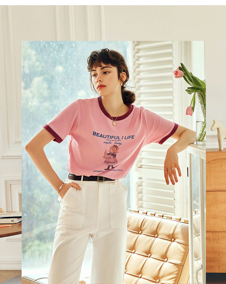 OLrain欧芮儿法式粉色短袖T恤女夏季2023年新款宽松印花百搭上衣