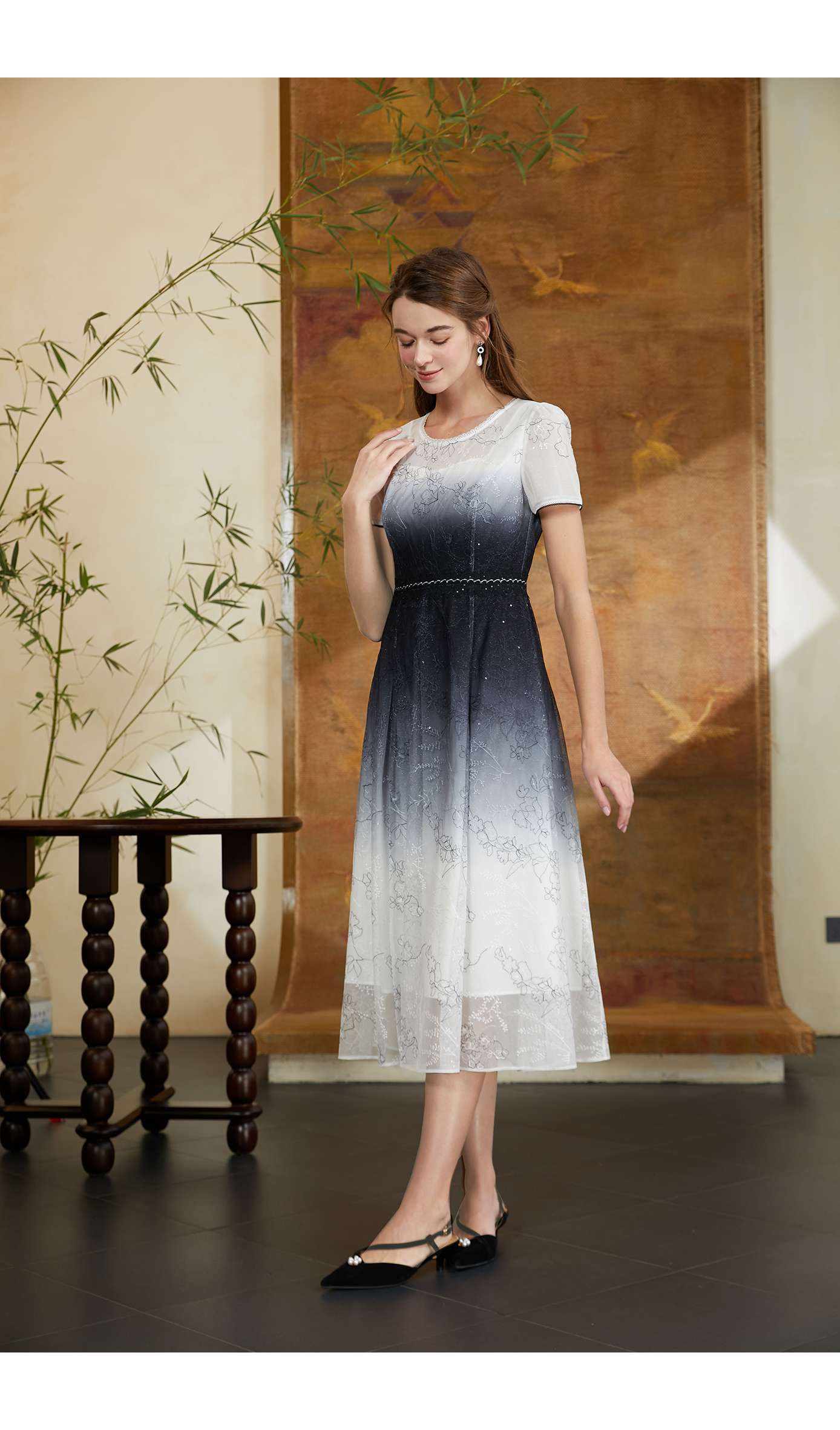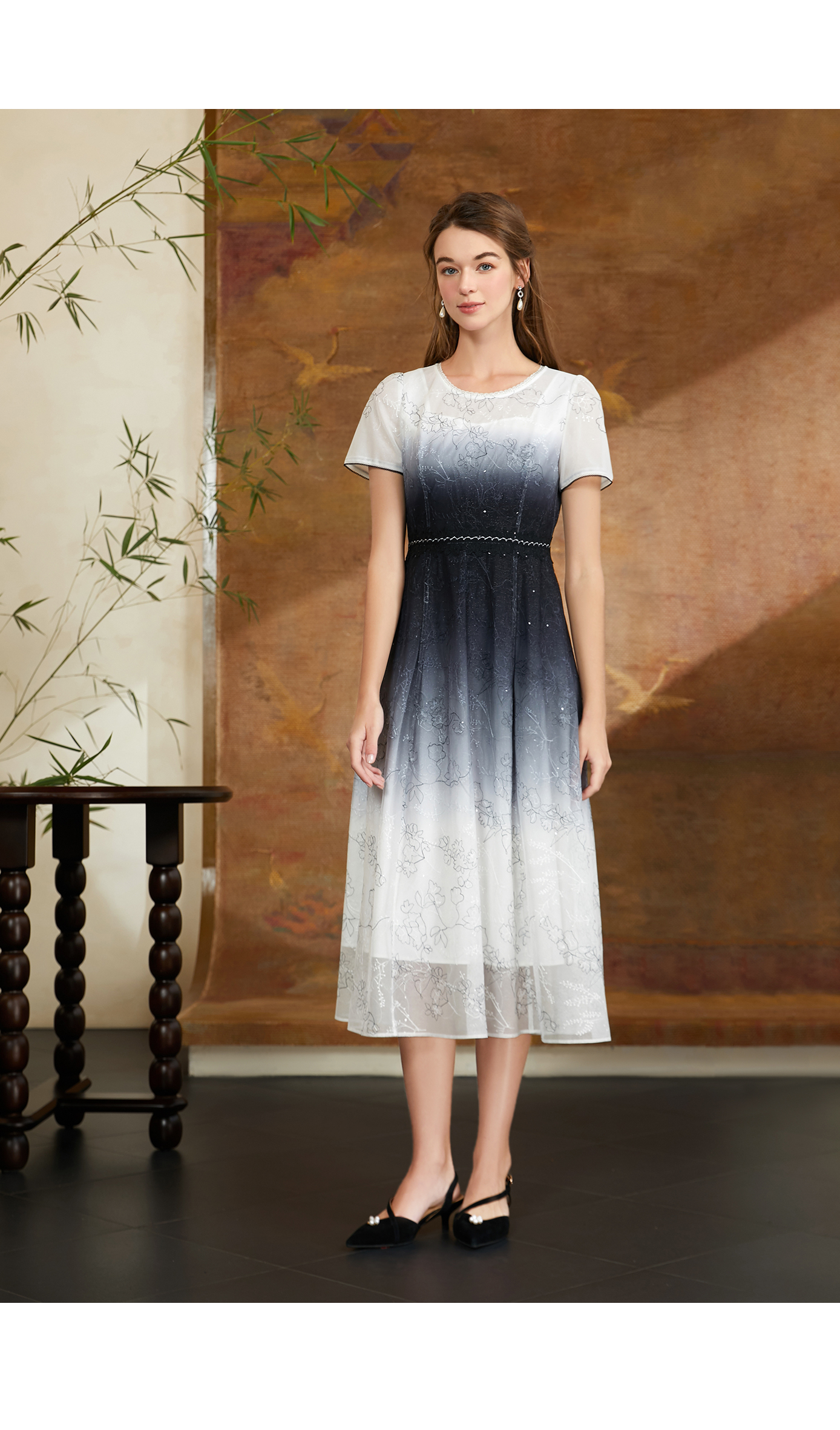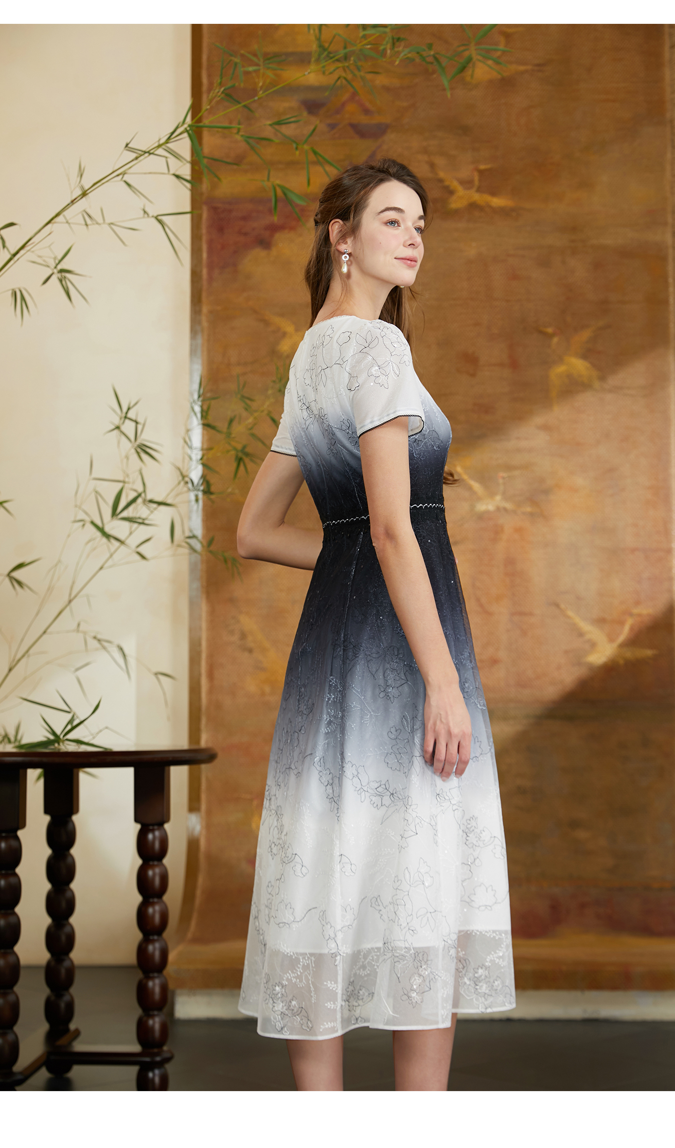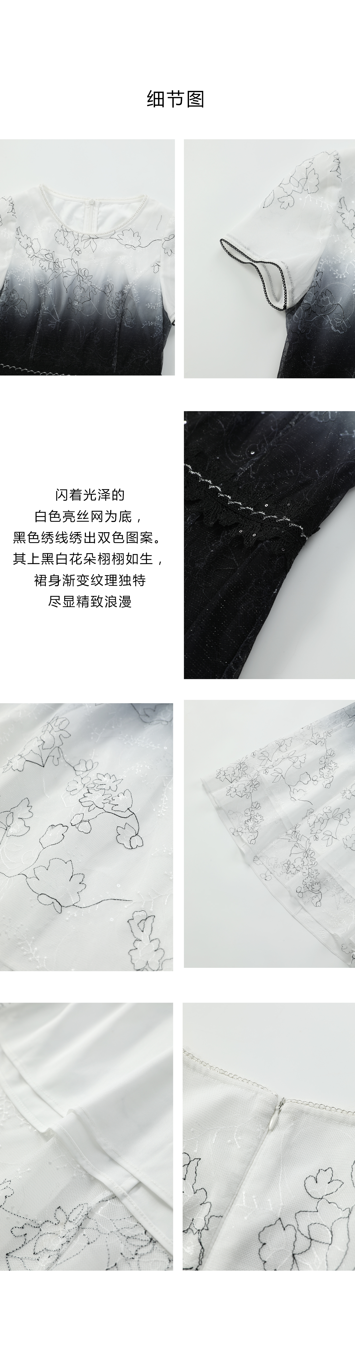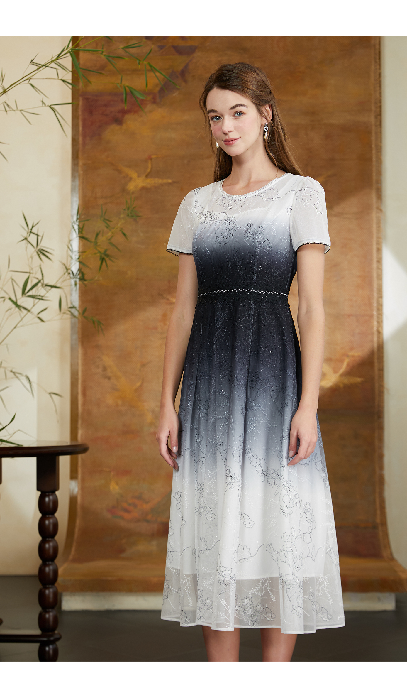 司歌蕾丝渐变连衣裙中长短袖裙A911018X