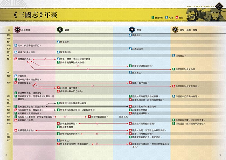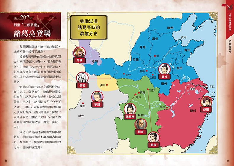 特色2:搭配「年表」與「地圖」,橫向與縱向的完整呈現三國群雄割據的地域分布及各戰役的攻守防備與敵友變化,清楚說明三國人、事、時、地、物發生的時序。