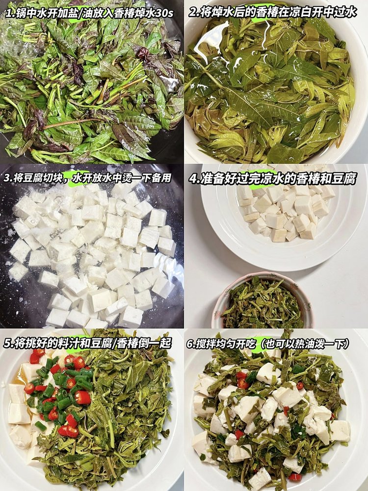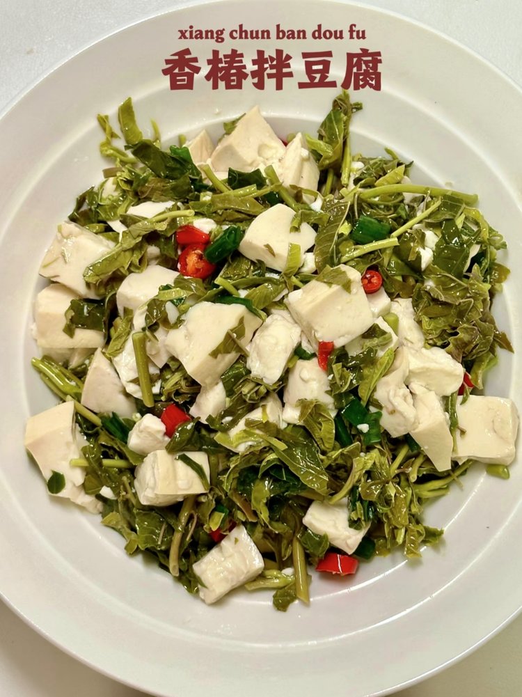 香椿拌豆腐也是非常家常的一道小菜,简简单单却能把香椿的美味体现的淋漓尽致1、首先将香椿芽洗净,焯水后快速捞出;2、然后把香椿切碎,把豆腐切成小方块,拌在一起加入食盐;3、再加一点儿姜蒜汁儿、香油调匀即可。