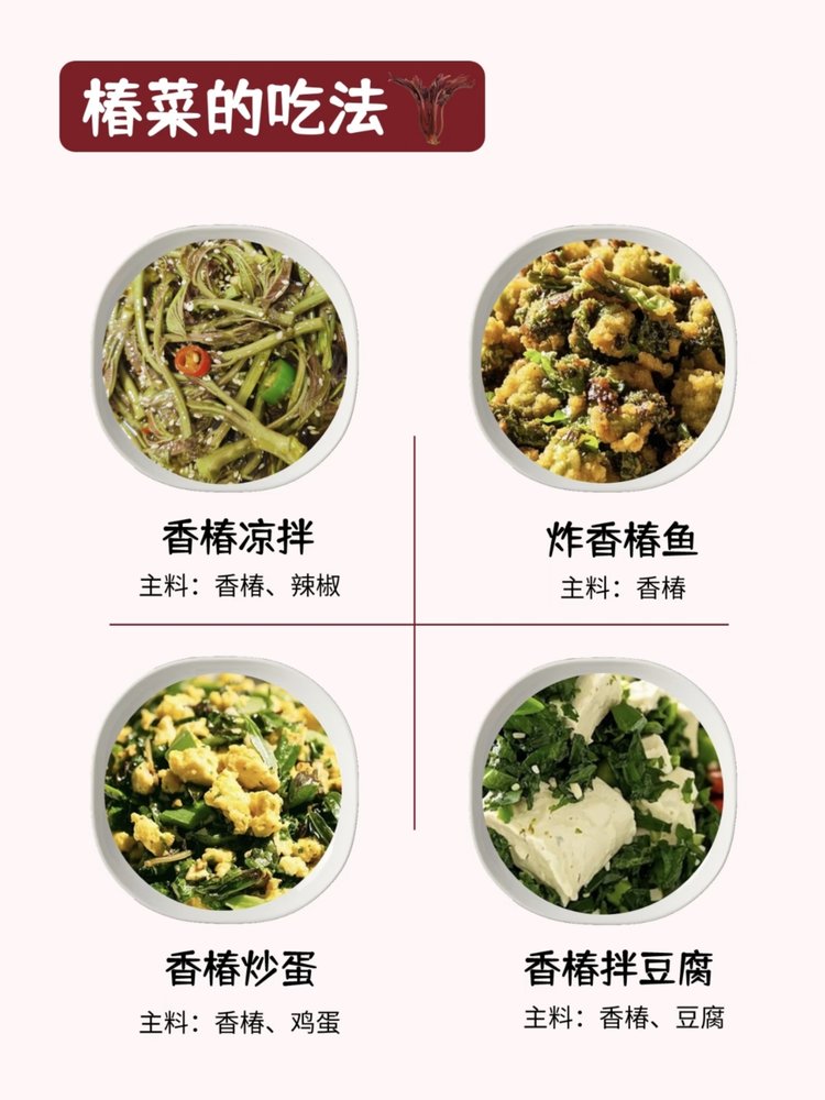 香椿芽入菜,吃法很多。通常有香椿拌豆腐、香椿炒鸡蛋、盐渍生香椿、油炸香椿,也可将香椿与大米同煮,调以香油、味精、精盐等,香糯可口。