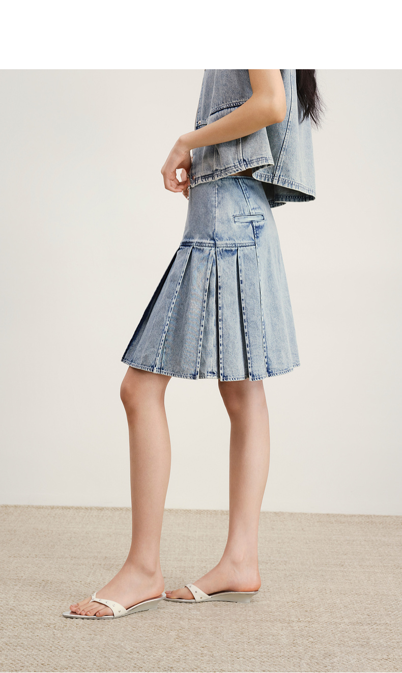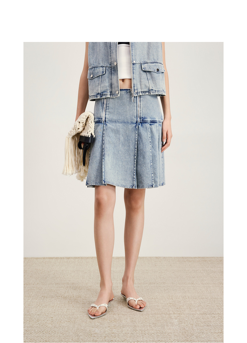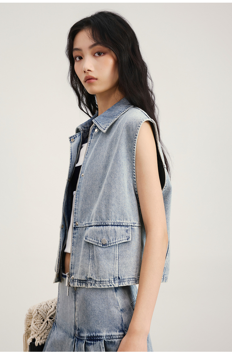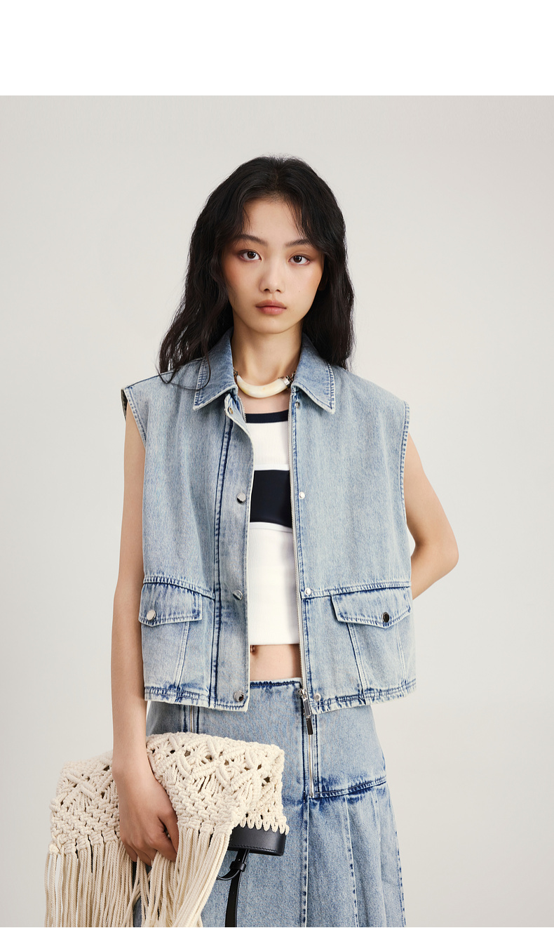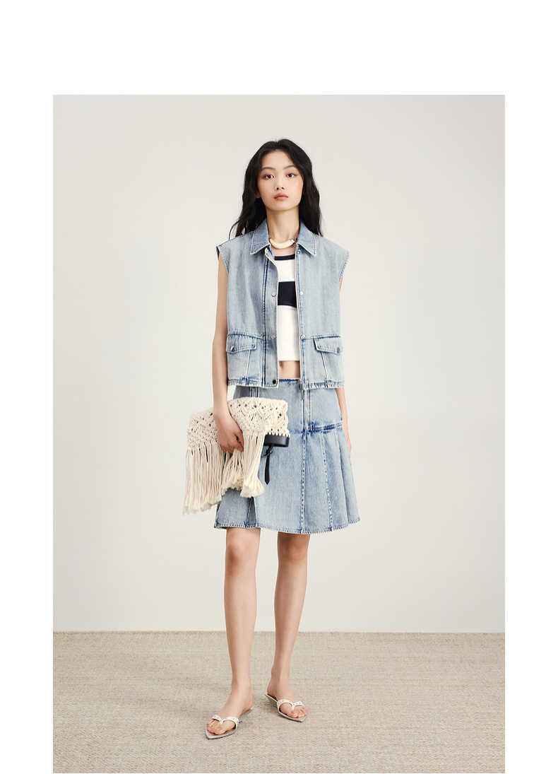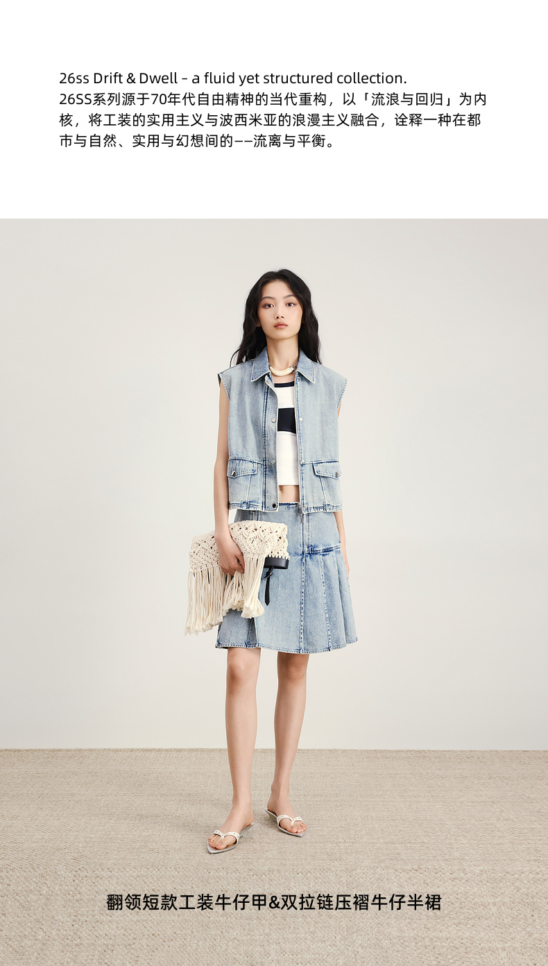 lost in echo2026年春夏新款翻领修身工装牛仔短马甲压褶半裙套装