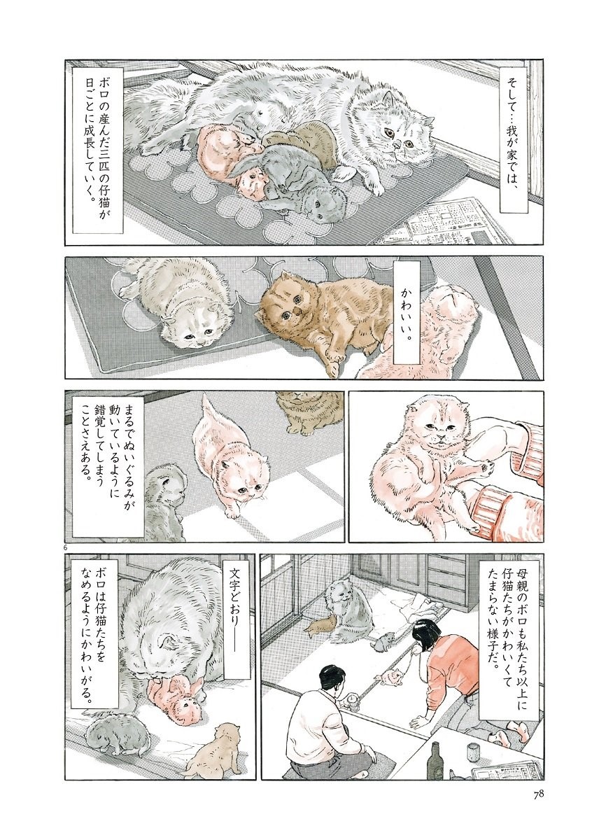 第一篇〈養狗〉描繪照顧飼養了15年的愛犬「湯姆」,終老臨走前最後一年的過程。透過日記般的筆法,谷口智郎帶出高齡寵物的長照課題,細膩摹寫飼主心境轉折,從悉心呵護、焦慮不耐到痛心放手,樸實的圖文灌注了強烈的情感。實際速寫愛犬的臨終模樣,更是令人鼻酸。即使距1991年發表至今已近30年,作品中流露出的情感和細膩的描寫還是令人感動不已。