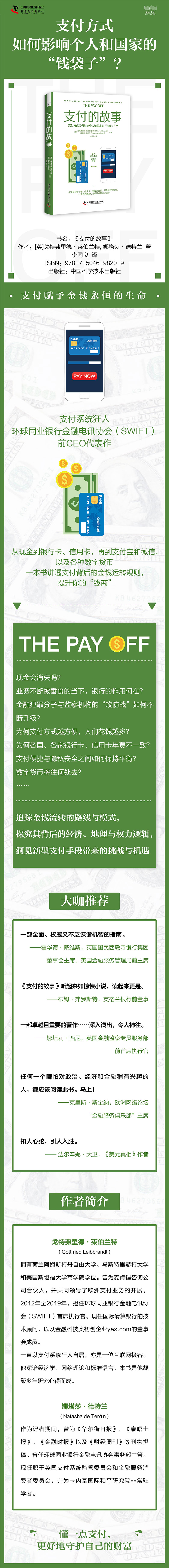 1. 支付系统狂人、环球同业银行金融电讯协会(SWIFT)前CEO代表作2从现金到银行卡、信用卡,再到支付宝和微信,以及各种数字货币,支付方式如何影响个人和国家的“钱袋子”?3. 一本书讲透支付背后的金钱运转奥秘,提升你的“钱商”。