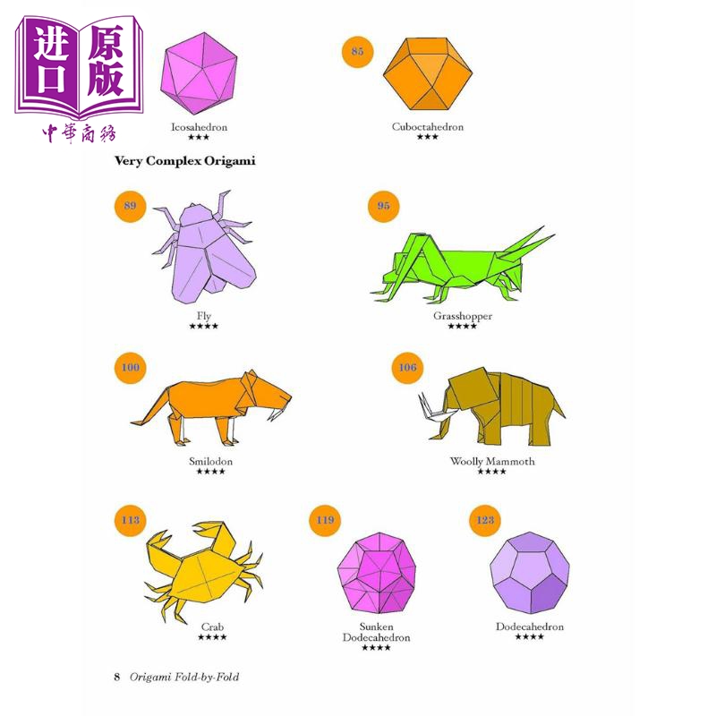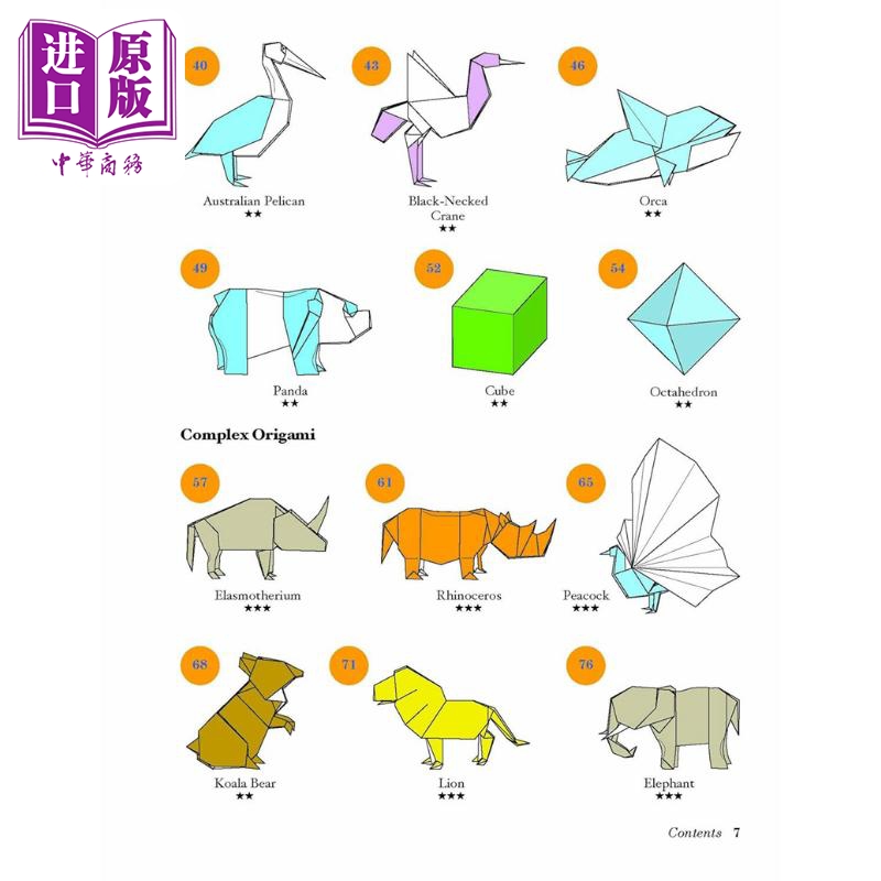 这个独特的35个原始折纸模型的集合,按照难度的顺序呈现,是畅销的折纸艺术家约翰·蒙诺尔的发明。这些项目从简单的一星模型(瓢虫、天使鱼、帆船)开始,逐渐发展到非常复杂的四星模型(蚱蜢、长毛象),中间还有鹤、狮子、孔雀和一些几何形状。包括一步一步的说明和全彩色插图,让各级文件夹逐渐发展自己的技能。
