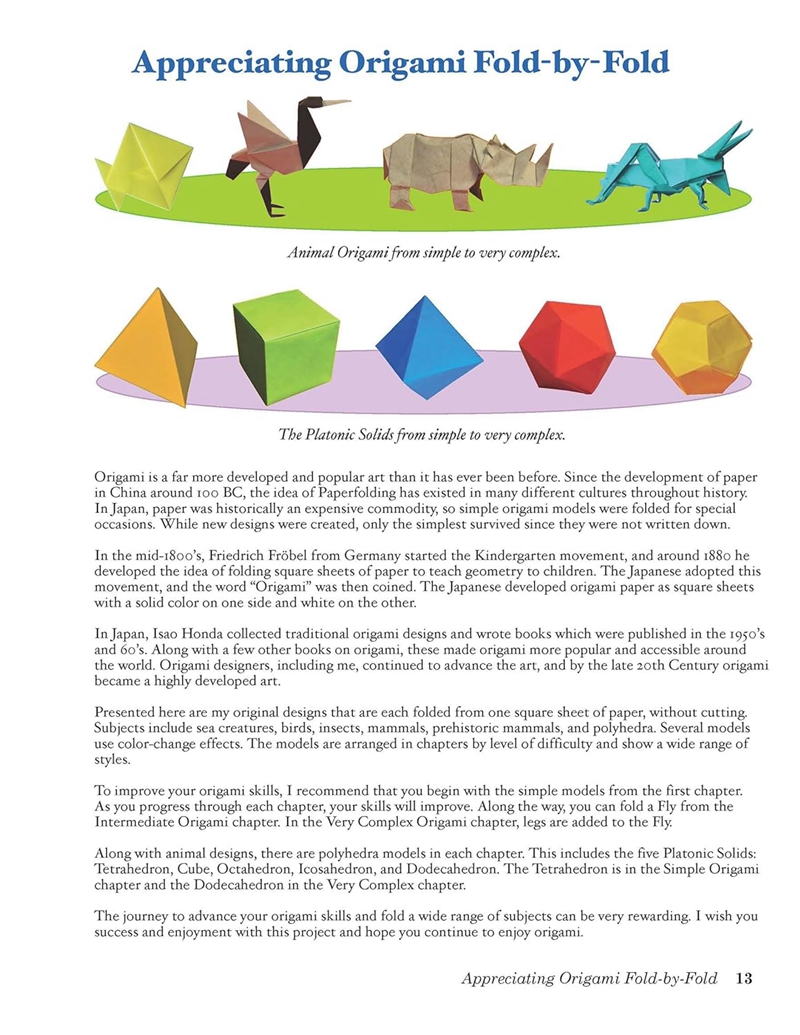 This unique collection of 35 original origami models, presented in order of difficulty, is the invention of bestselling origami artist John Montroll. The projects start with simple one-star models (ladybug, angelfish, sailboat) and progress to very complex four-star models (grasshopper, wooly mammoth), with a crane, lion, peacock, and several geometric shapes in between. This comprehensive volume includes step-by-step instructions and full-color illustrationsto allow folders at all levels to gradually develop their skills.