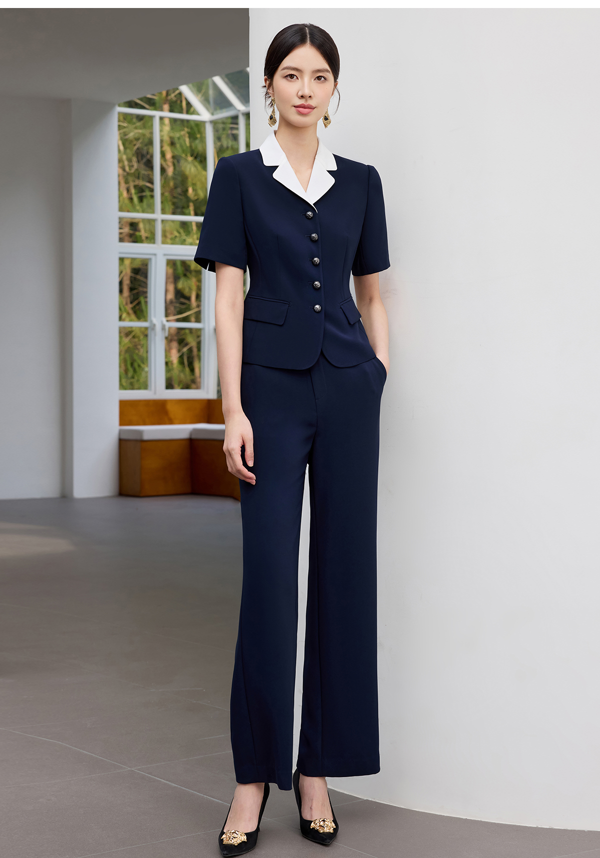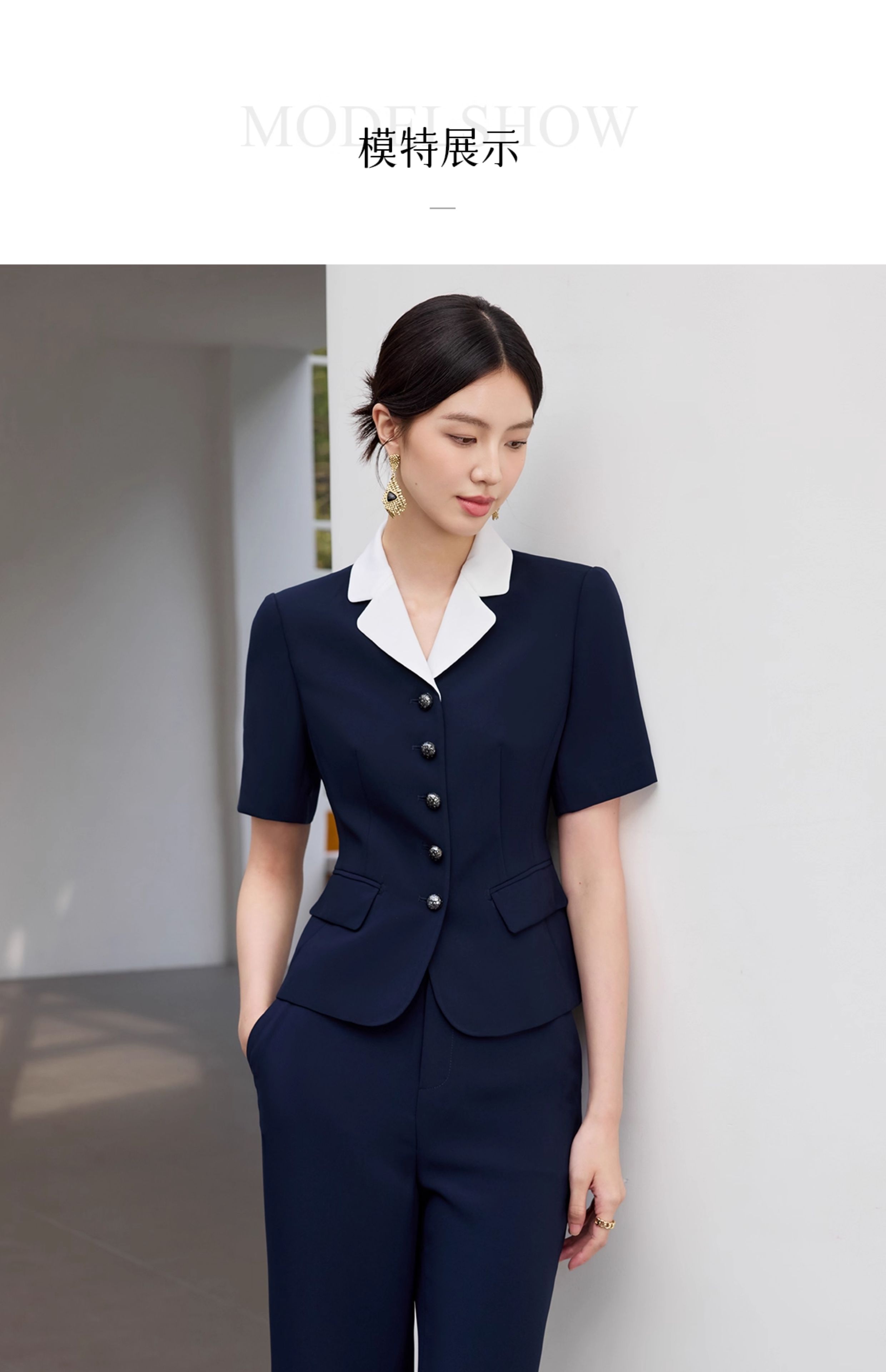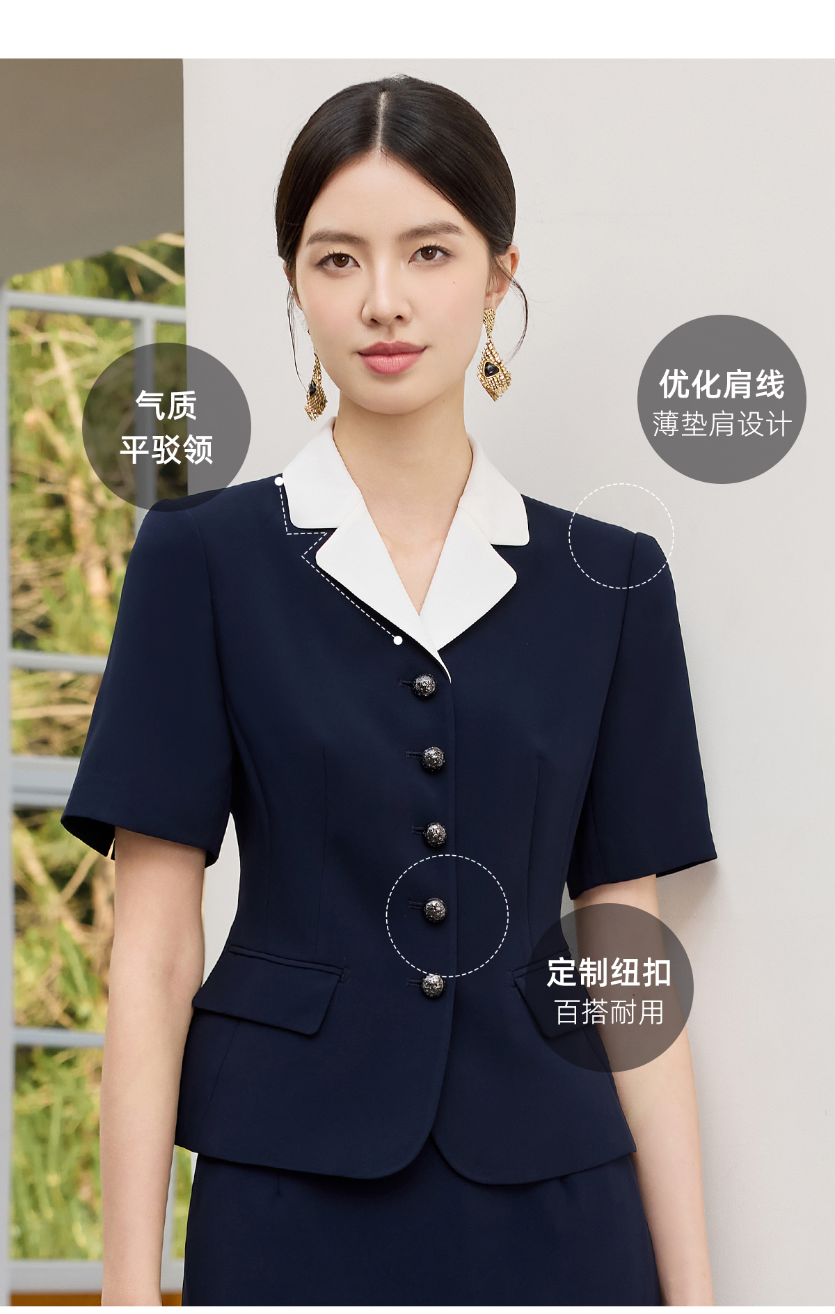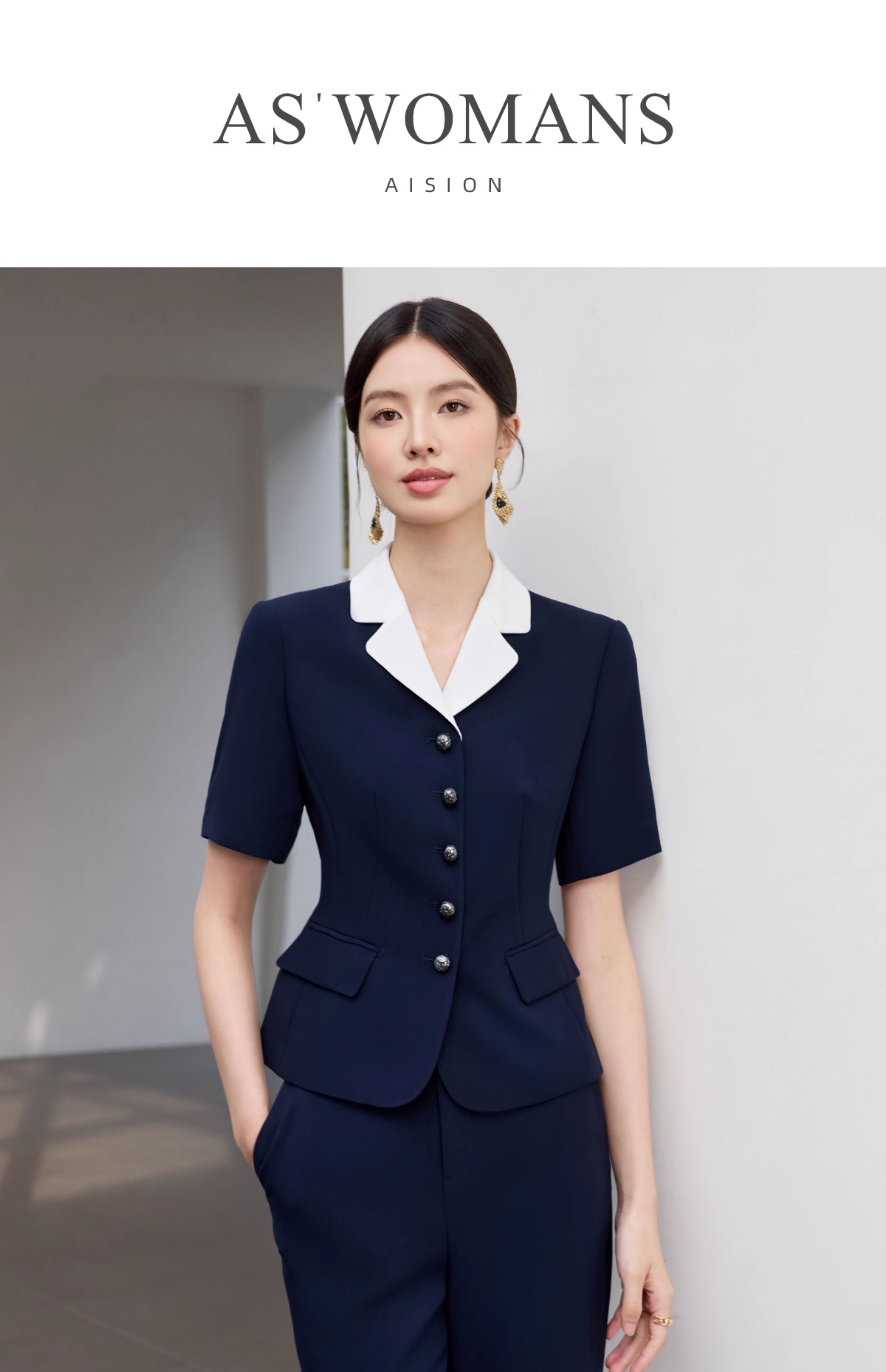 IWY/高级感拼接领西装套装女夏季藏青色商务通勤前台接待职业装25CP792