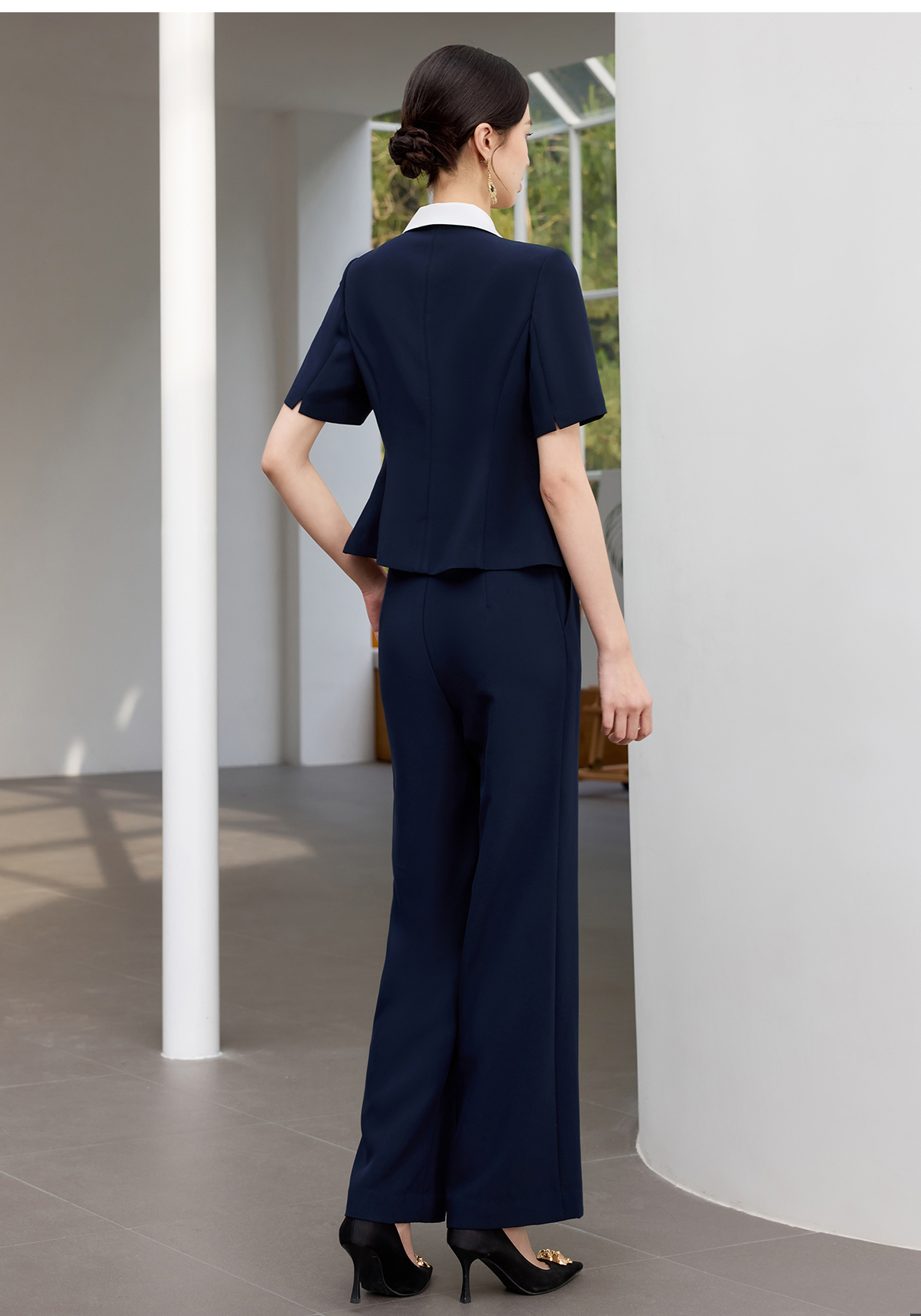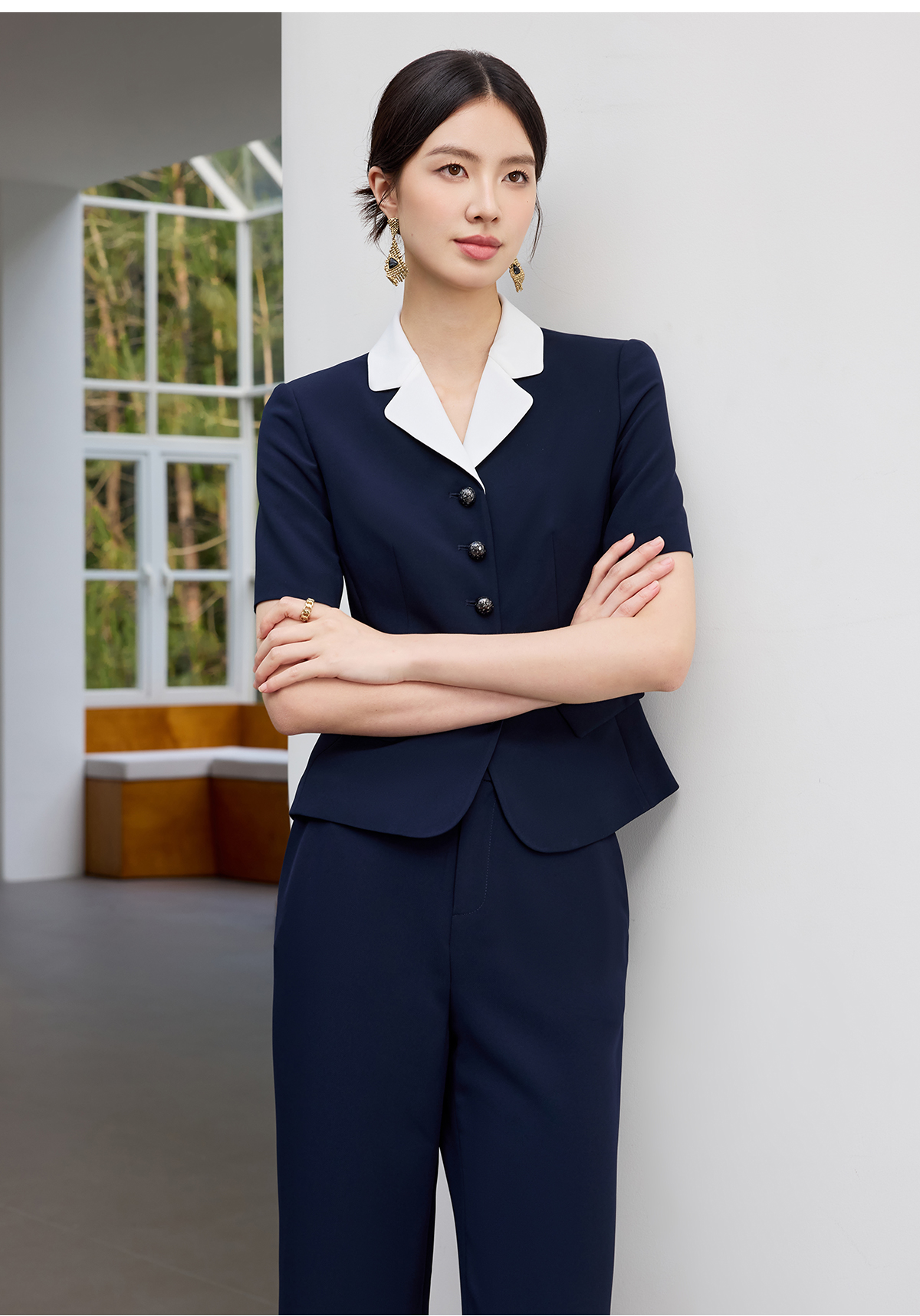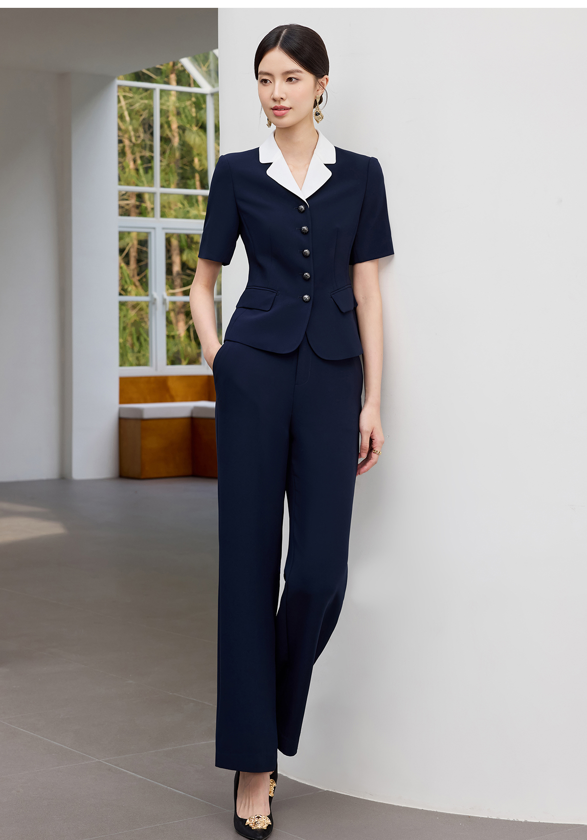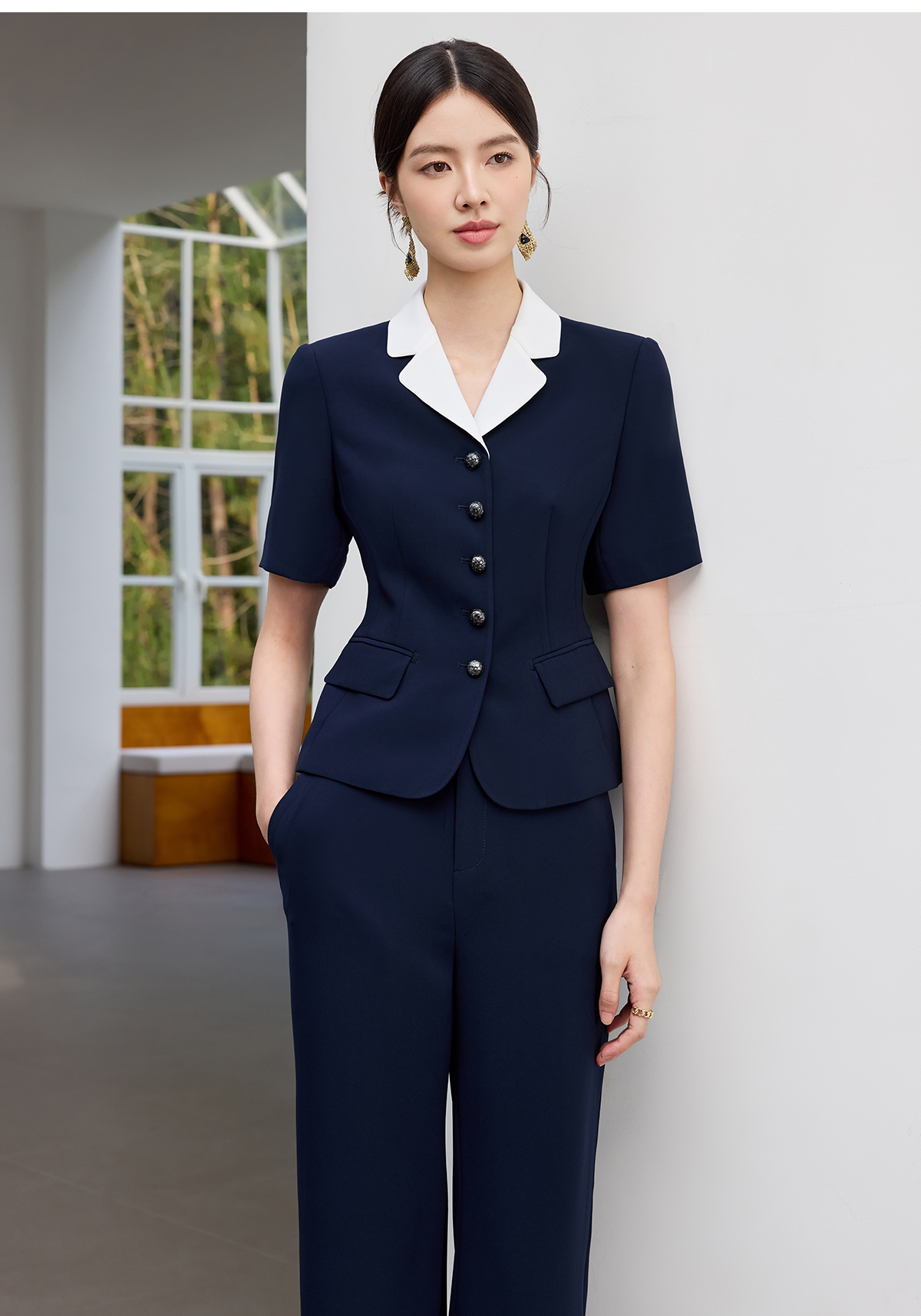 IWY/高级感拼接领西装套装女夏季藏青色商务通勤前台接待职业装25CP792