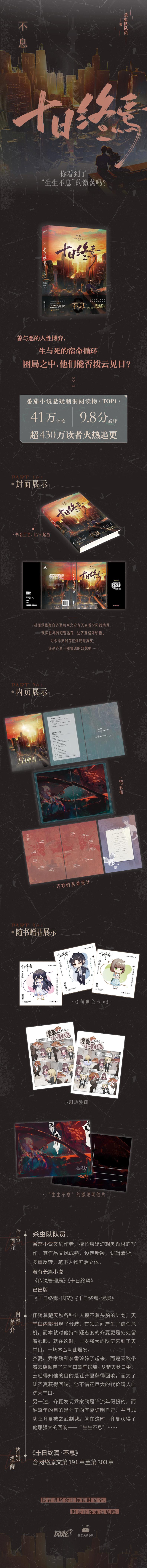 《十日终焉·不息》:伴随着楚天秋各种让人摸不着头脑的计划,天堂口内部出现了分歧,首领之间产生了信任危机,而本就对他持怀疑态度的齐夏更是处处留着心眼。就在这时,一支强大的队伍来到了天堂口,一场恶战就此爆发。齐夏、乔家劲和李香玲躲了起来,而楚天秋带着云瑶抛弃了天堂口驾车逃离。从楚天秋口中,云瑶得知他的目的是让齐夏获得回响,而为了让齐夏获得回响,他不惜花巨大的代价请人血洗天堂口。另一边,齐夏发现乔家劲是许流年假扮的,而许流年的目的是为了向齐夏证明自己,并且成功让齐夏被玄武制裁。就在这时,齐夏获得了他那强大的回响——“生生不息”……