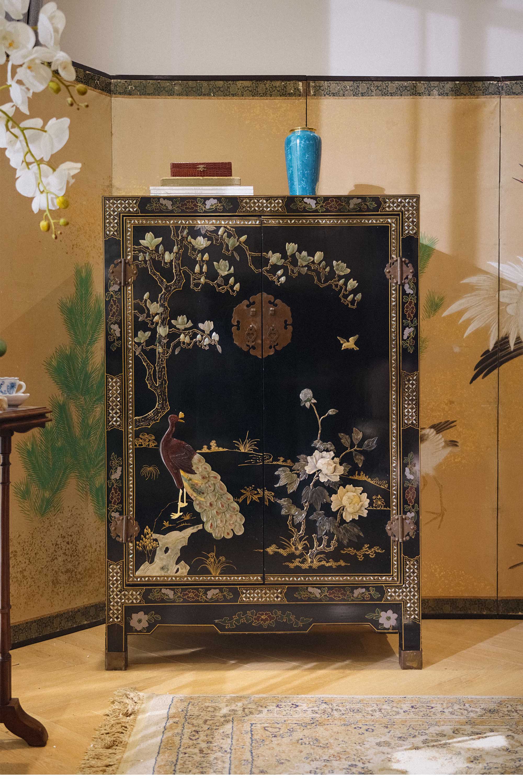 20世纪中国创汇时期出品「玉堂富贵」主题黑漆描金百宝嵌角柜
