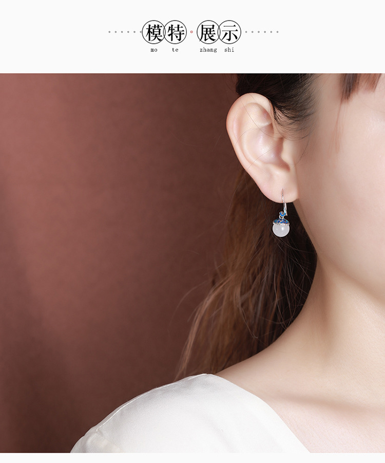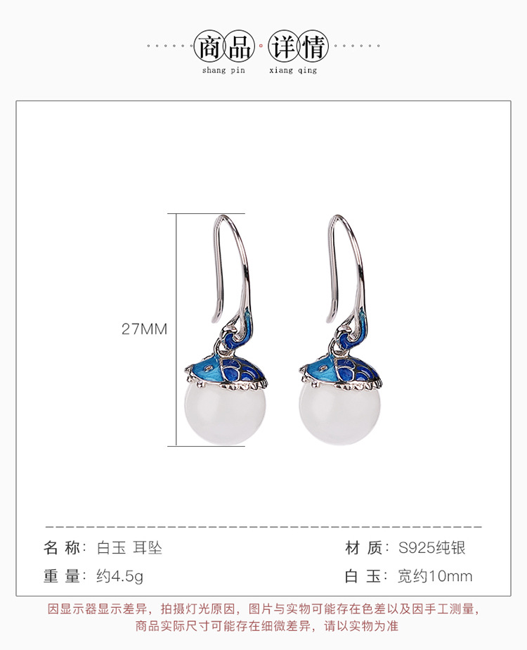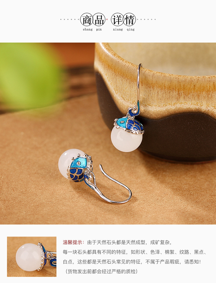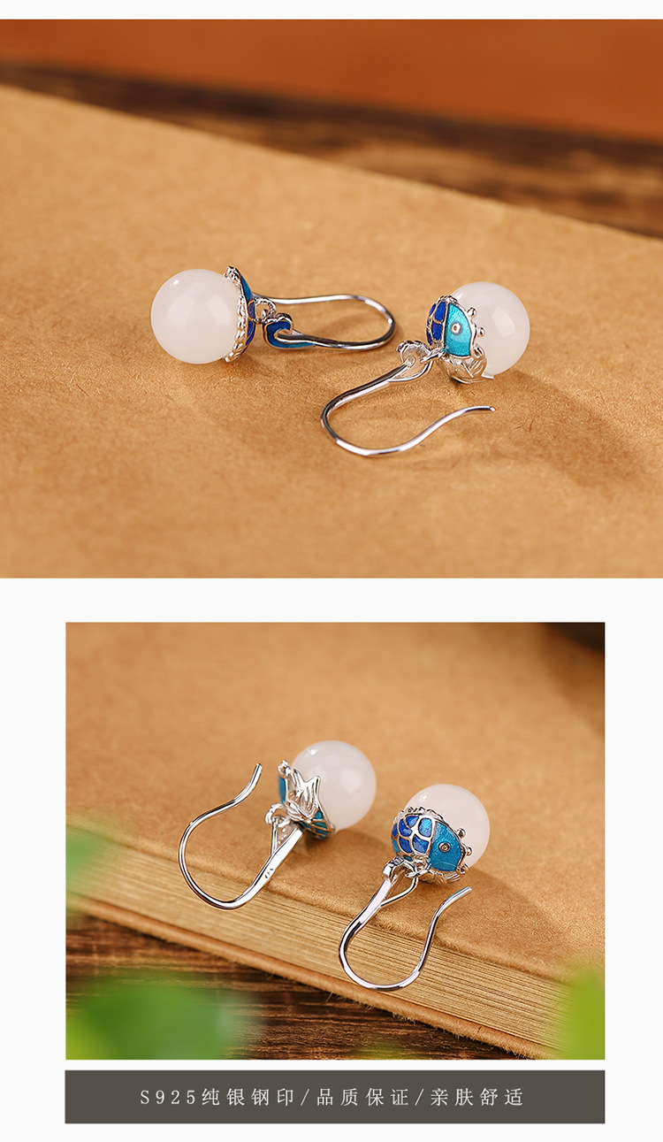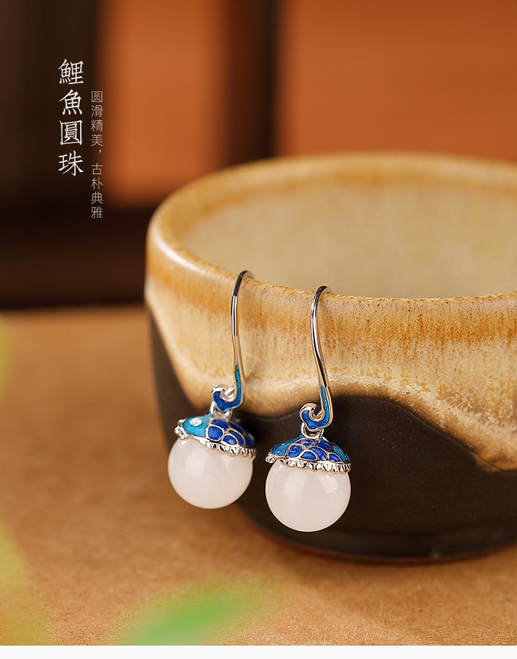 【倚绛云】S925银和田玉白玉景泰蓝国潮鲤鱼圆珠耳饰【CW-51415】