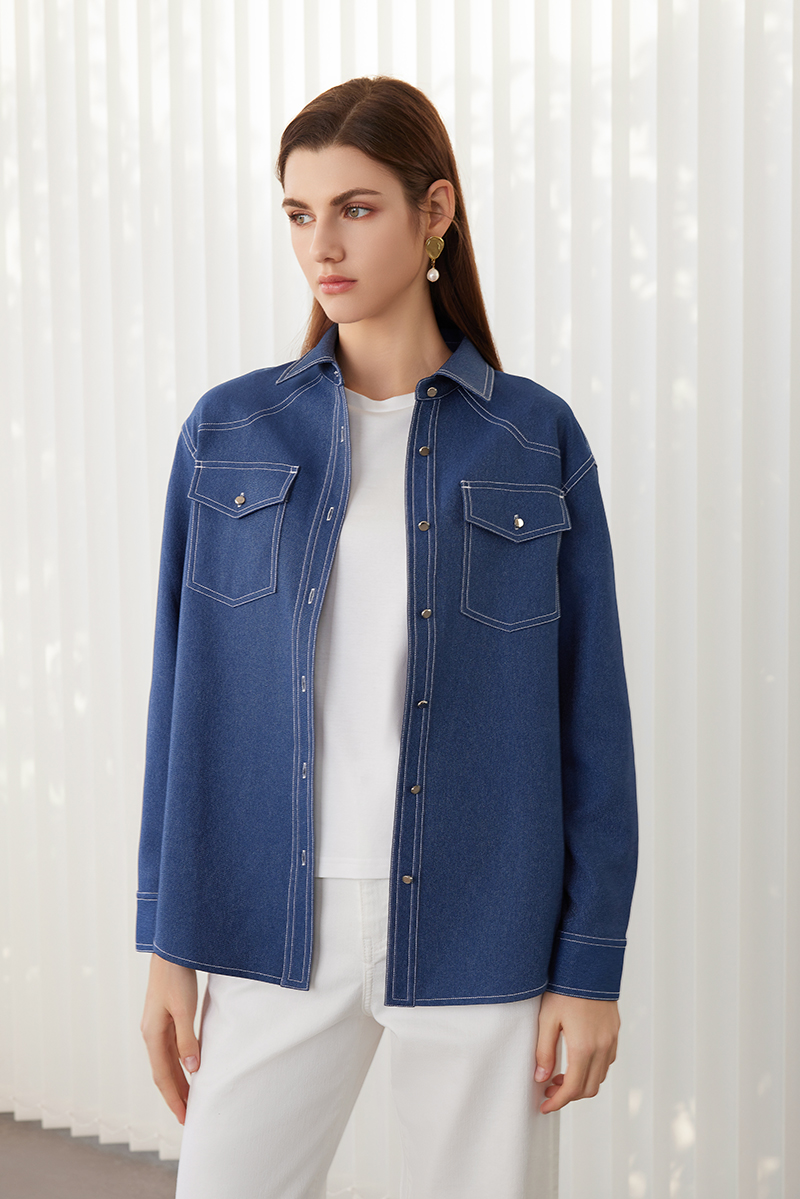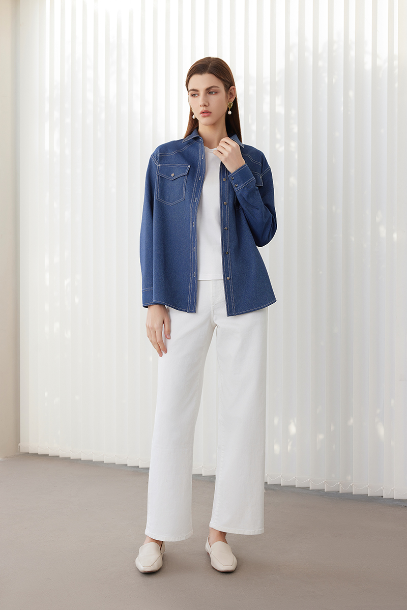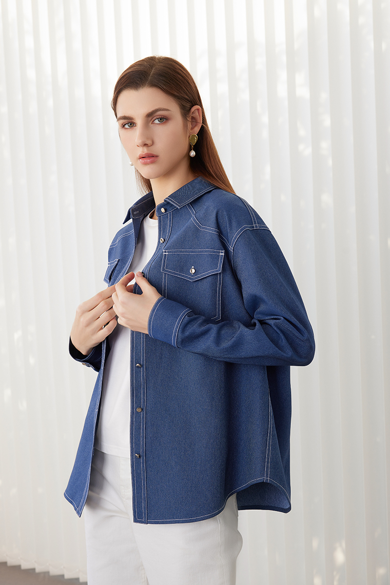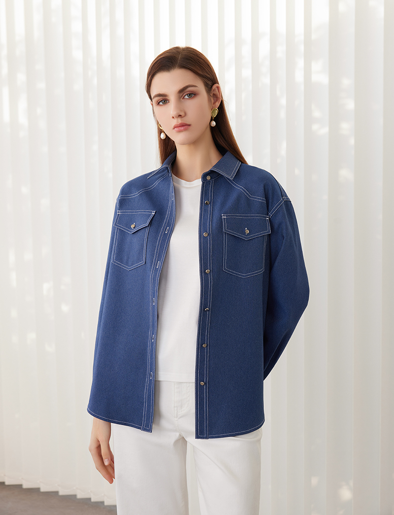 【牛仔蓝衬衫外套】24年春夏新品女士100%聚酯纤维时尚牛仔衬衫外套