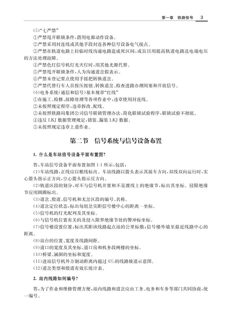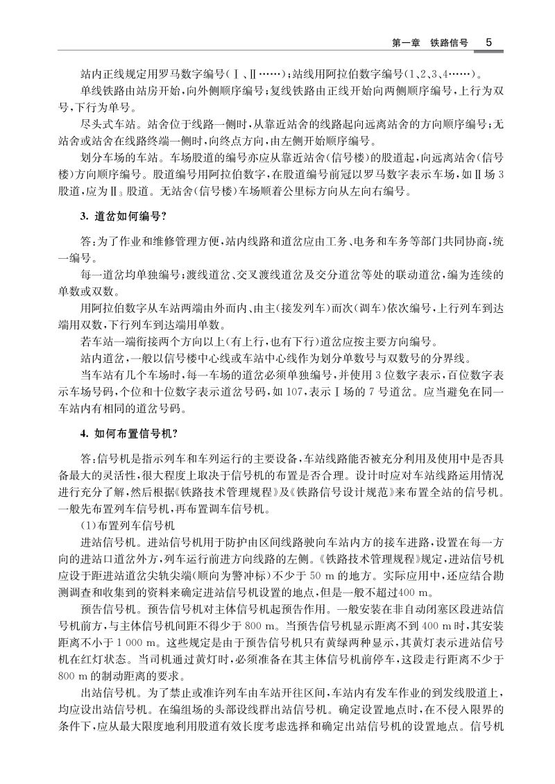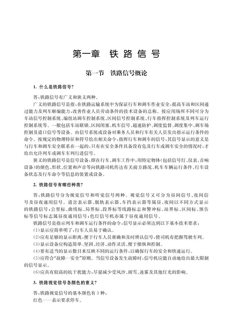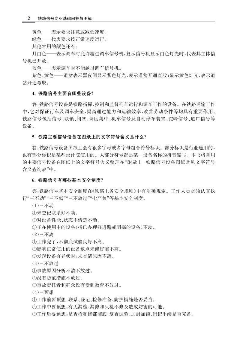 本书从为读者提供快速专业基础和应知应会的专业知识答案出发,整理成310个问答和大量图解的方式,尽可能用通俗的语言描述,便于非铁路信号专业人士理解铁路信号专业系统、专业名词。全书主要介绍铁路和铁路信号基础知识,铁道信号专业中的站内联锁、信号机、道岔及转辙设备、轨道电路、区间闭塞、机车信号、驼峰信号设备、列车控制系统,信号电源、道口信号、信号继电器、信号电缆、信号雷电防护等其它信号系统,以及信号集中监测系统。重点介绍铁道信号专业主要系统的工作原理、工程和维护技术重点。