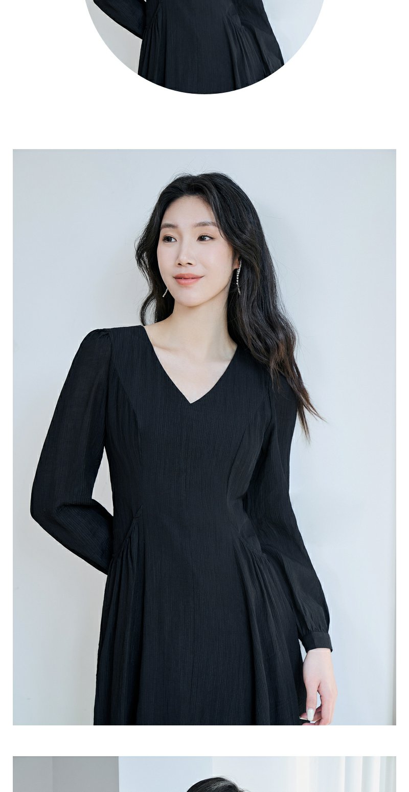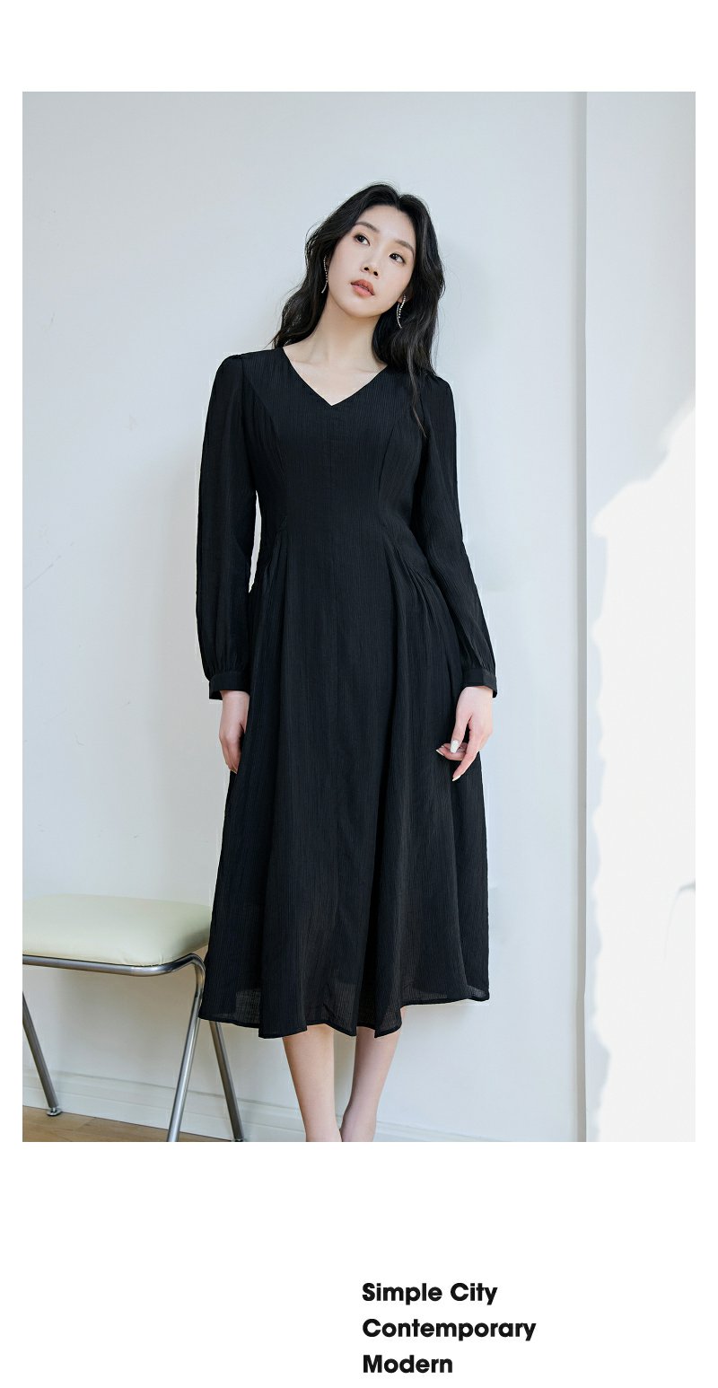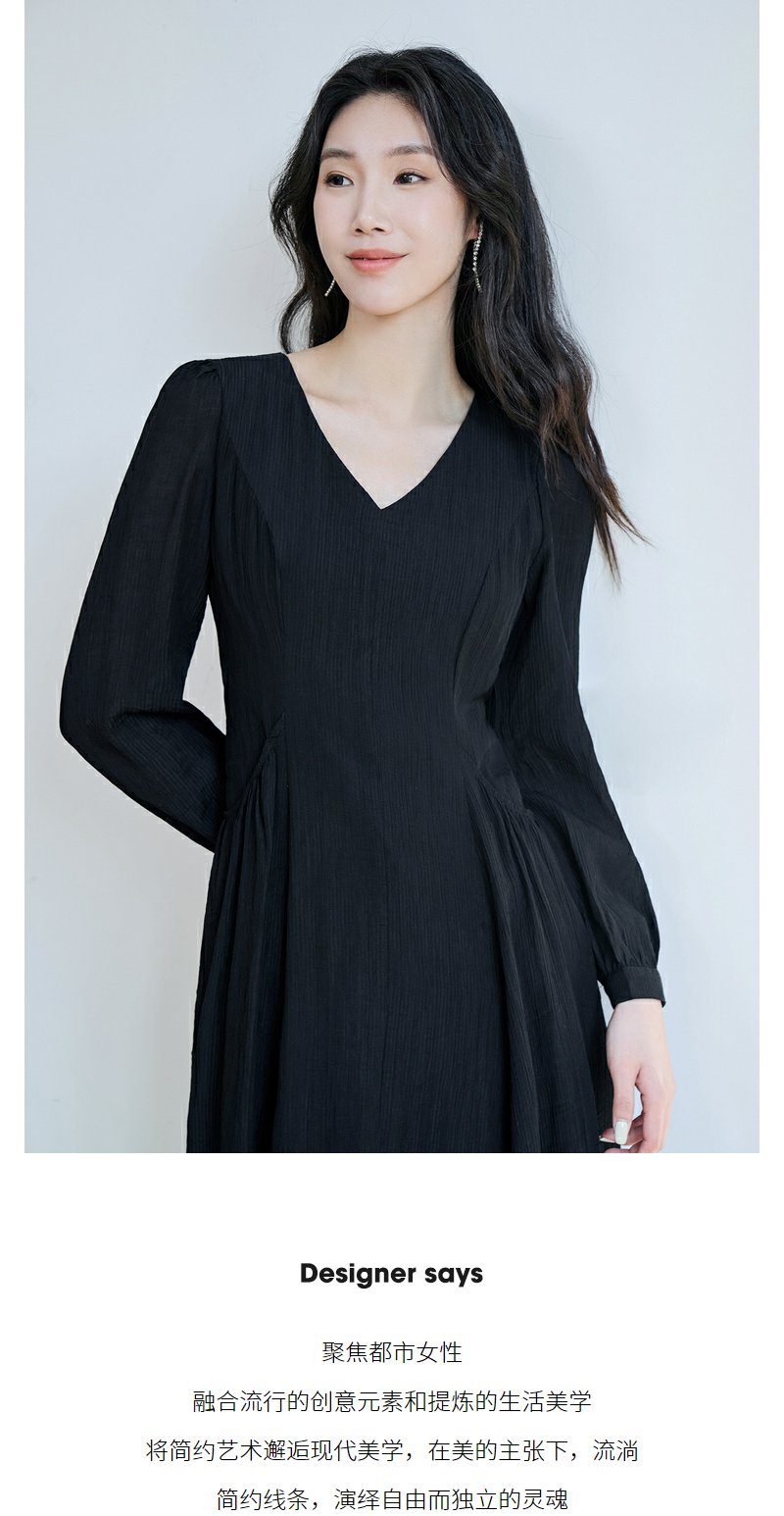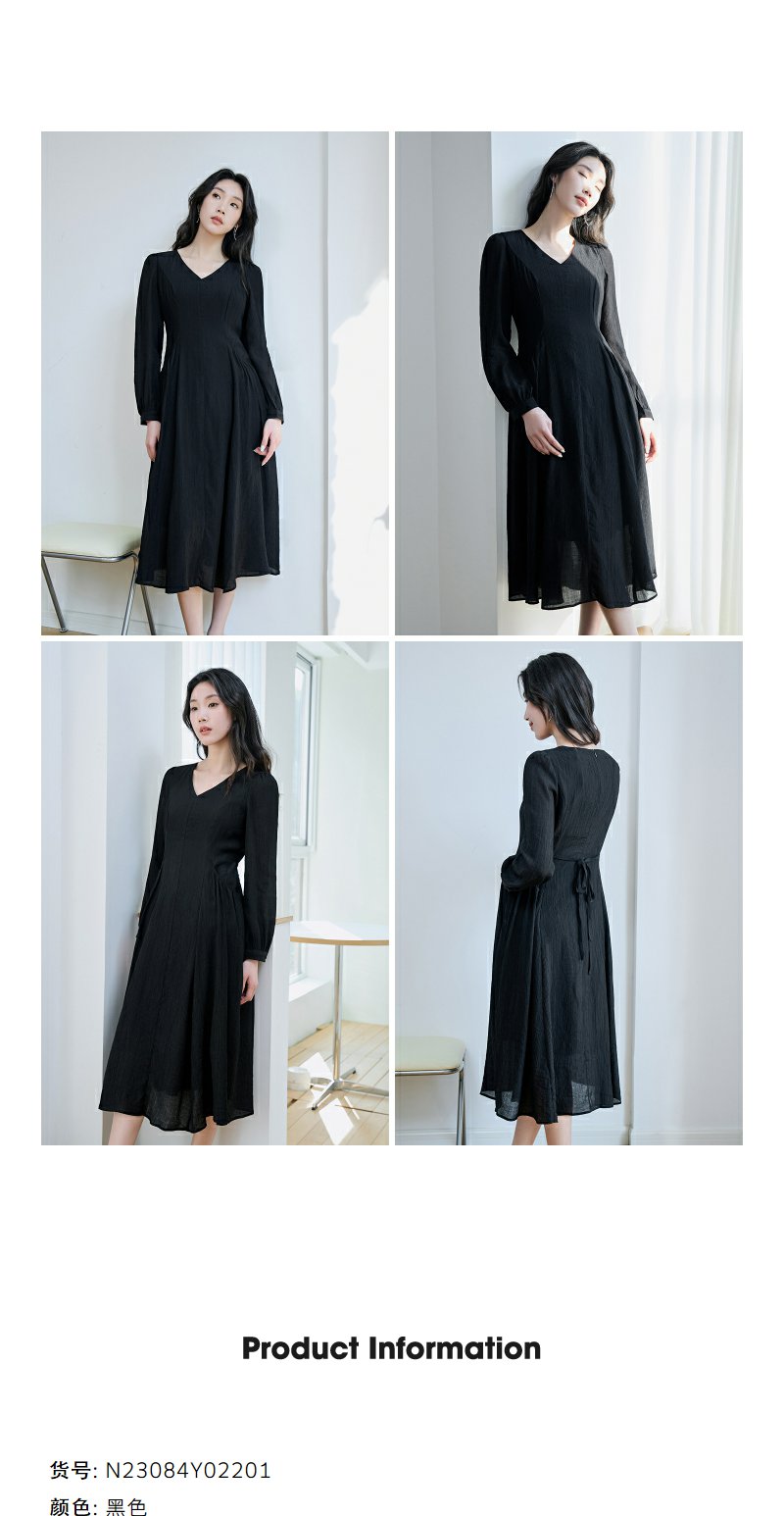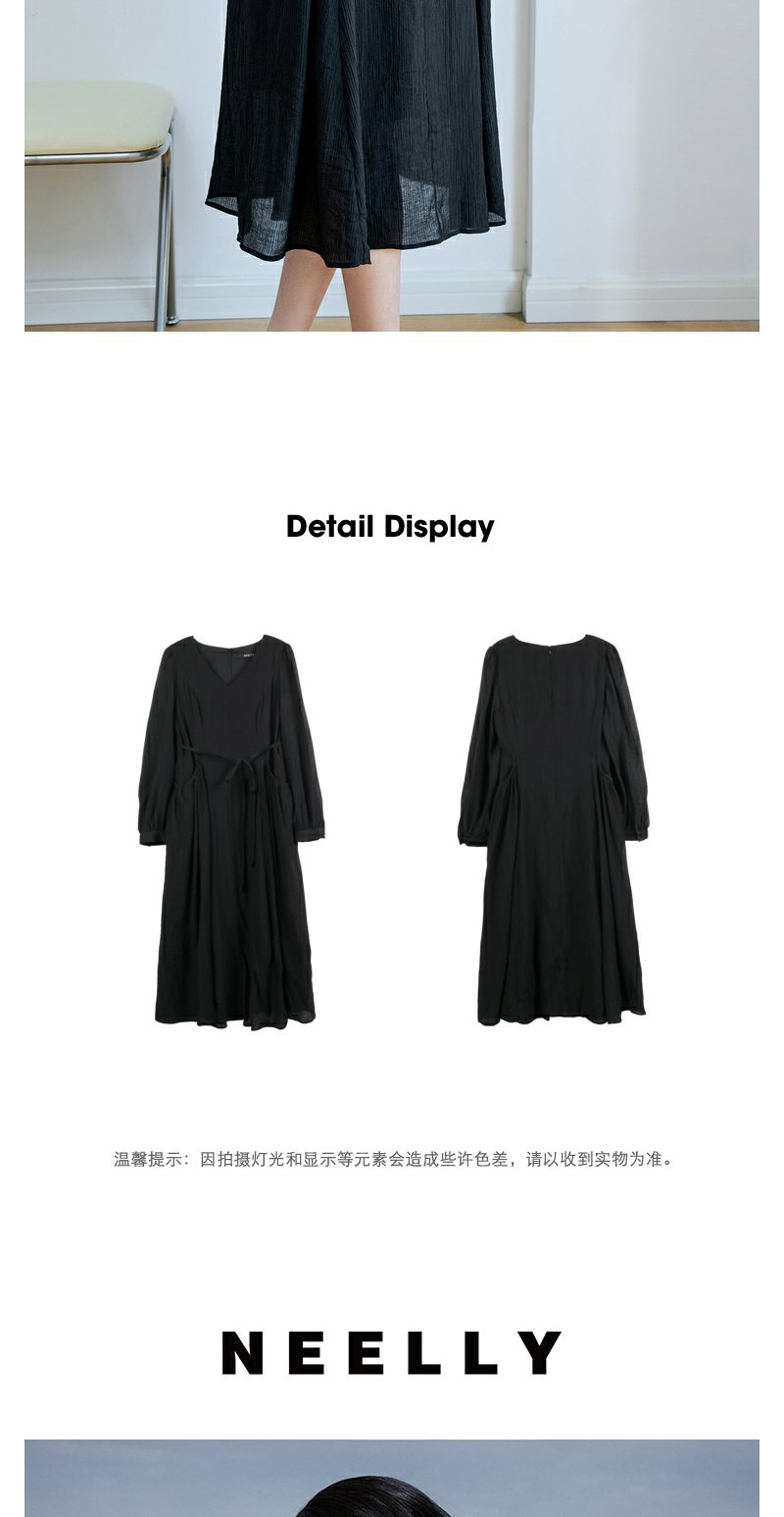 NEELLY纳俪商场同款V领系带收腰连衣裙 肌理感百搭法式垂感中长裙N23084Y02201